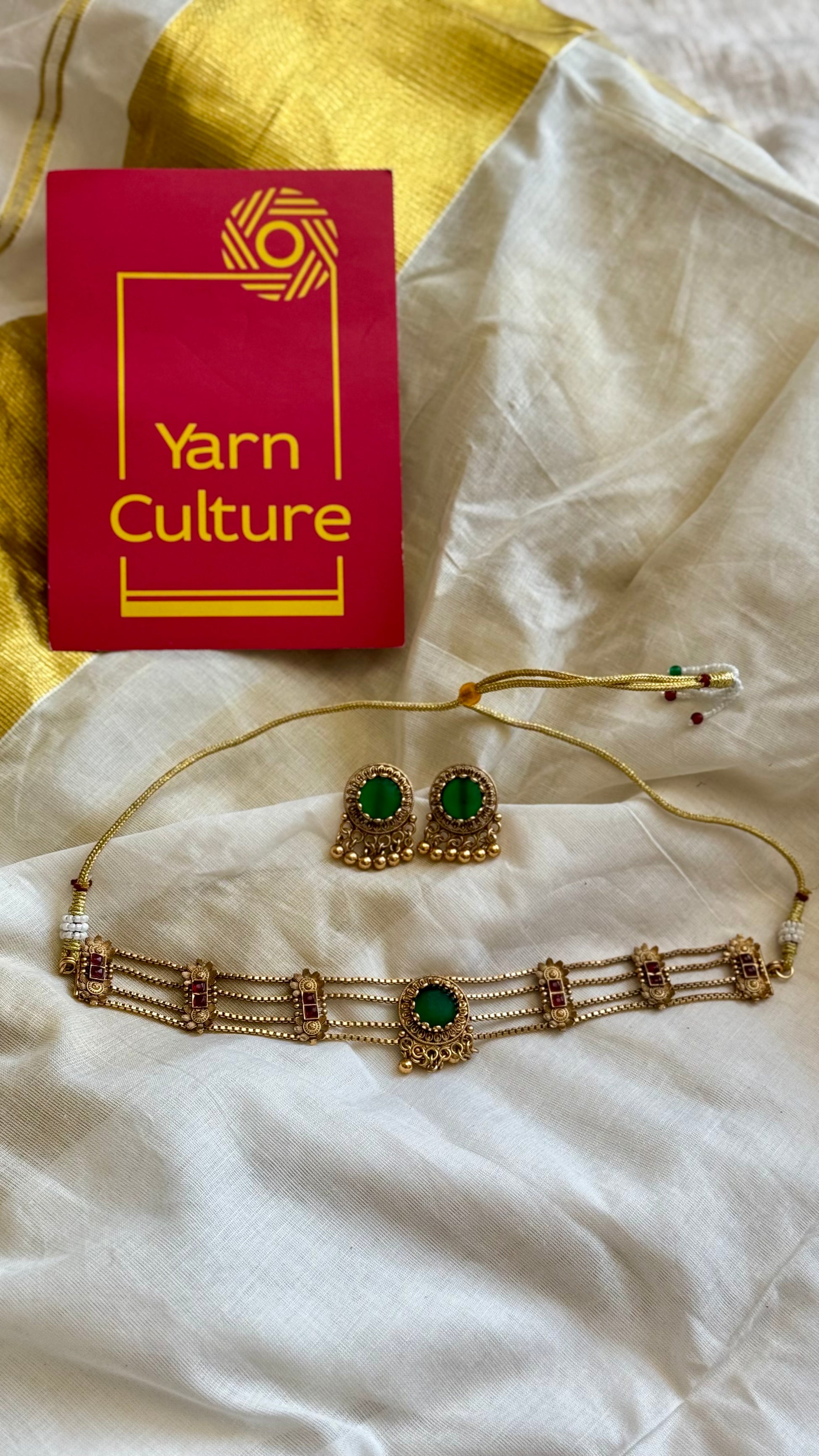 4 layered choker neckpiece with green pendant, with earrings