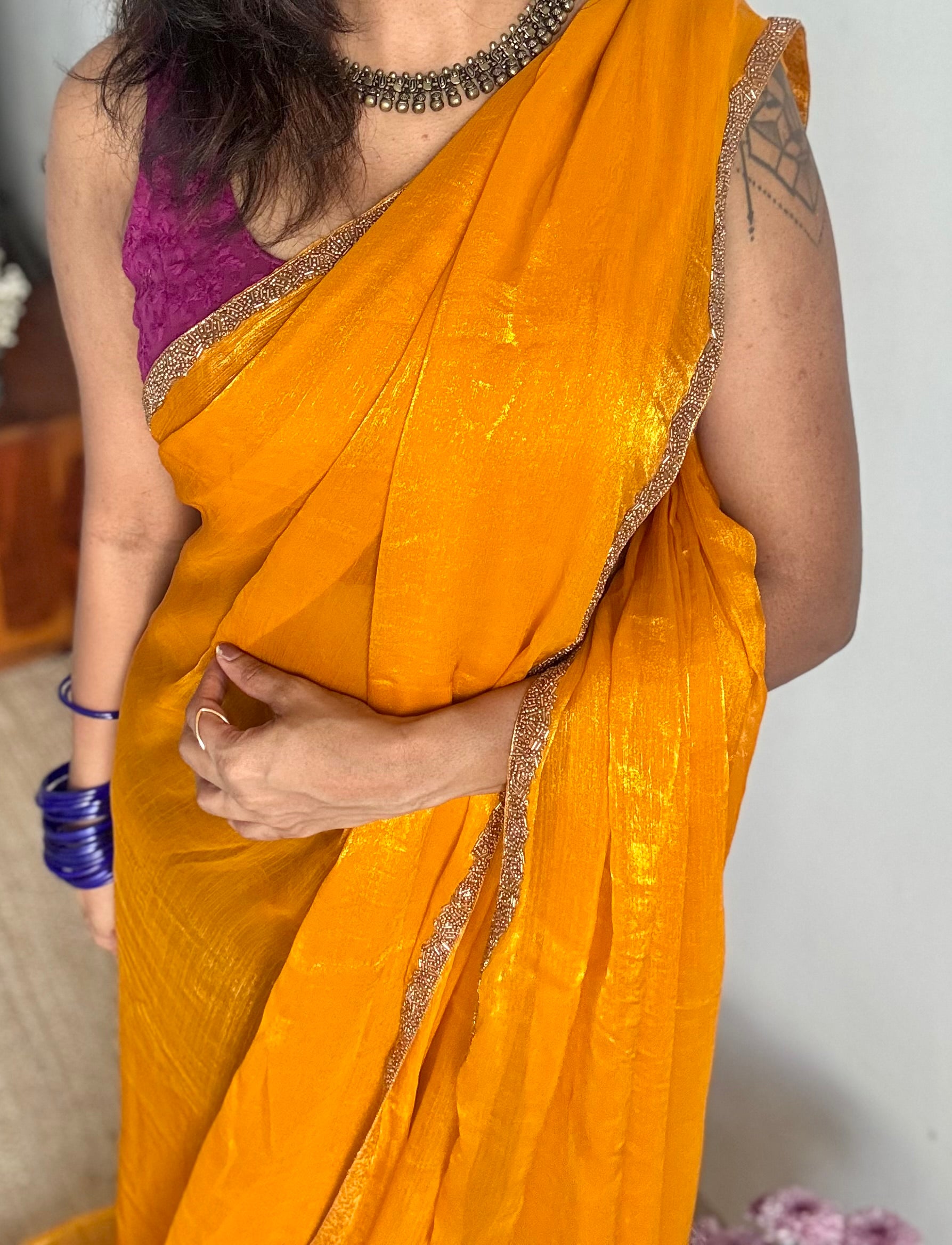 Golden yellow dual tone space silk that moves like liquid. Soft, easy to drape, shiny, and finished with an antique gold embellished border, your perfect festive glow.