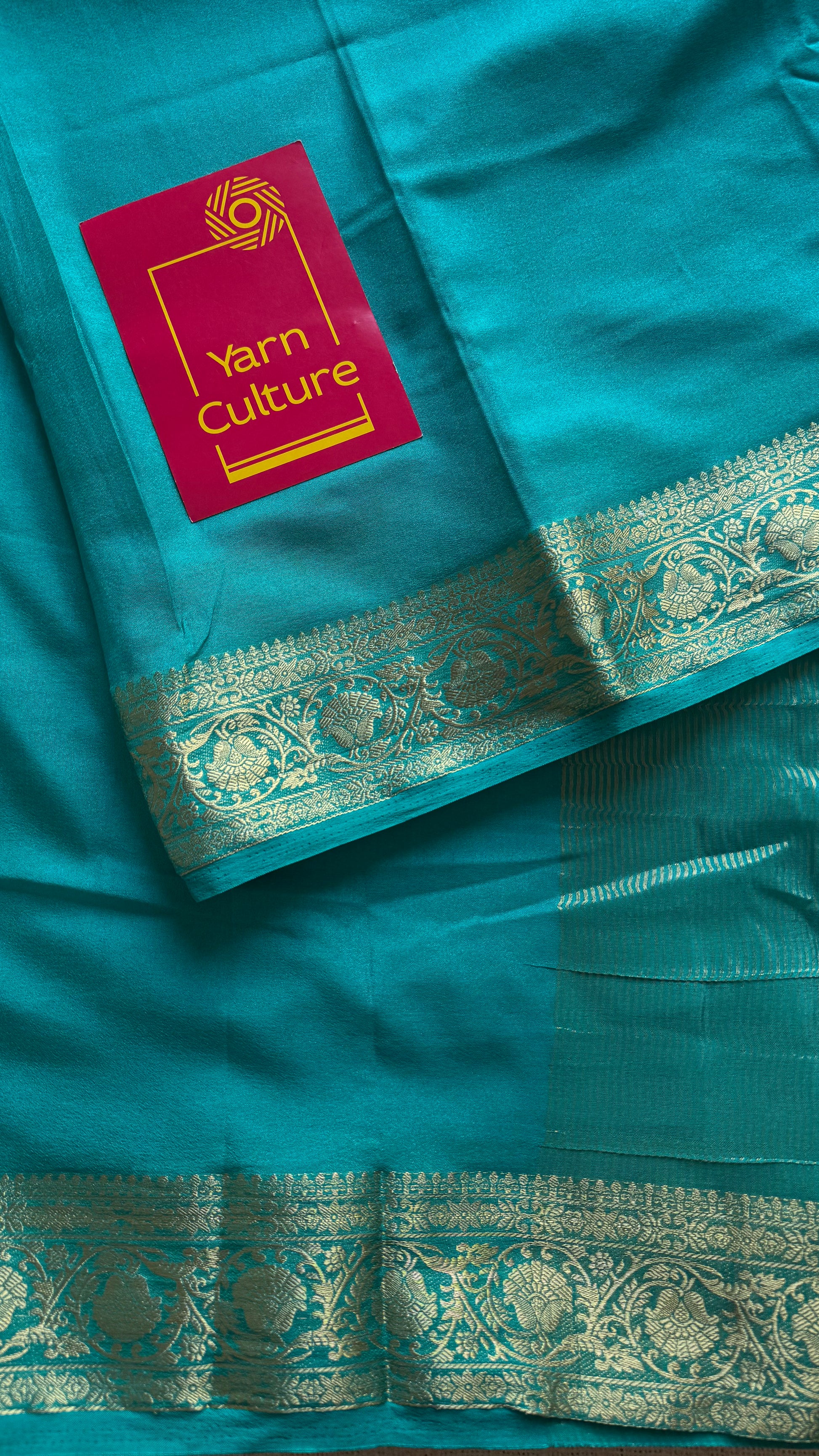 Another refreshing turquoise blue Mysore semi crepe silk saree featuring elegant floral zari borders and a rich zari pallu. Lightweight, soft, and easy to drape, it is perfect for festive occasions, formal gatherings, and refined everyday elegance.