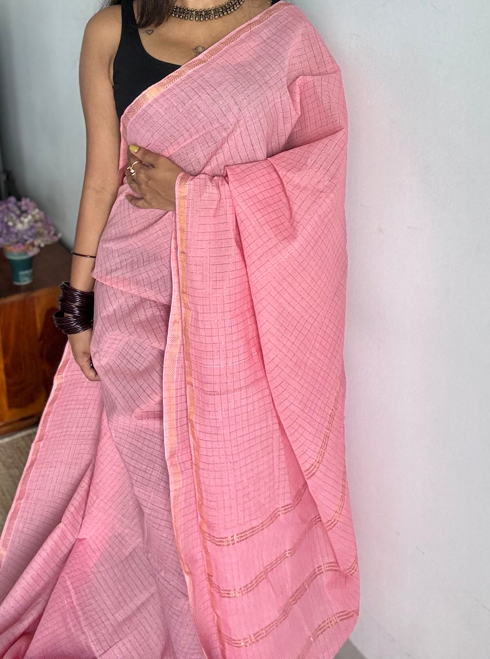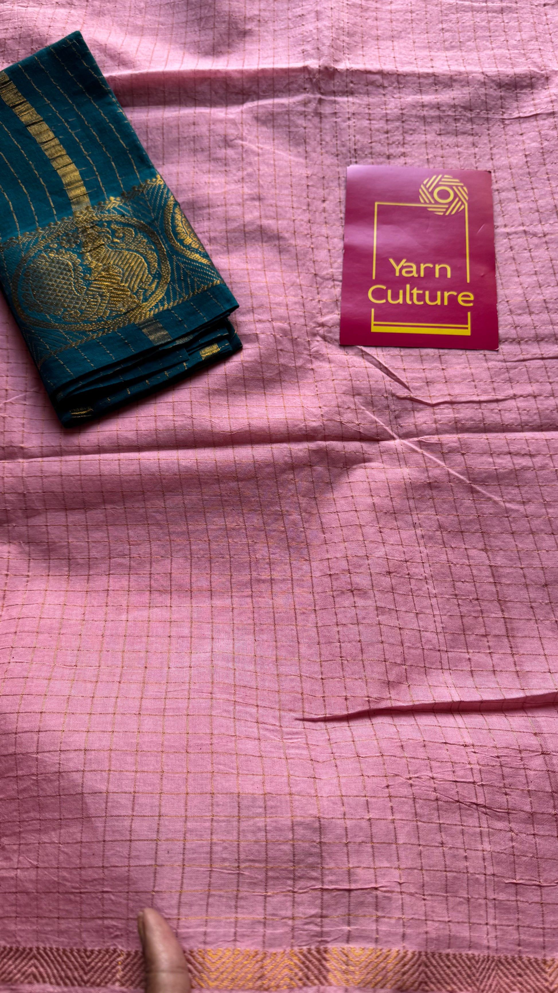 A charming baby pink Madurai cotton saree featuring delicate mini kattam checks, dyed using the traditional Kattuchayam technique. Comes with blouse fabric. The colour of blouse may vary based on availability.