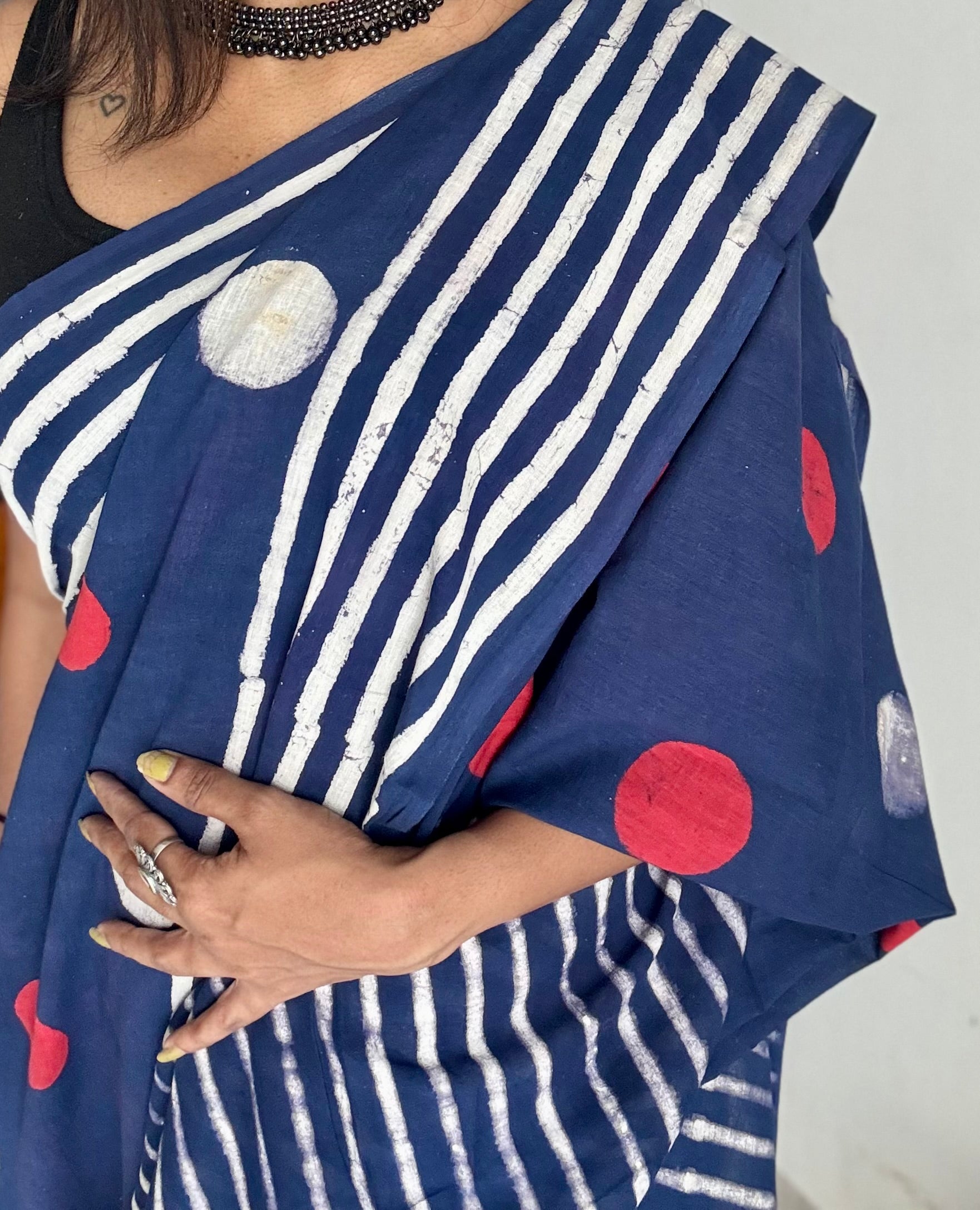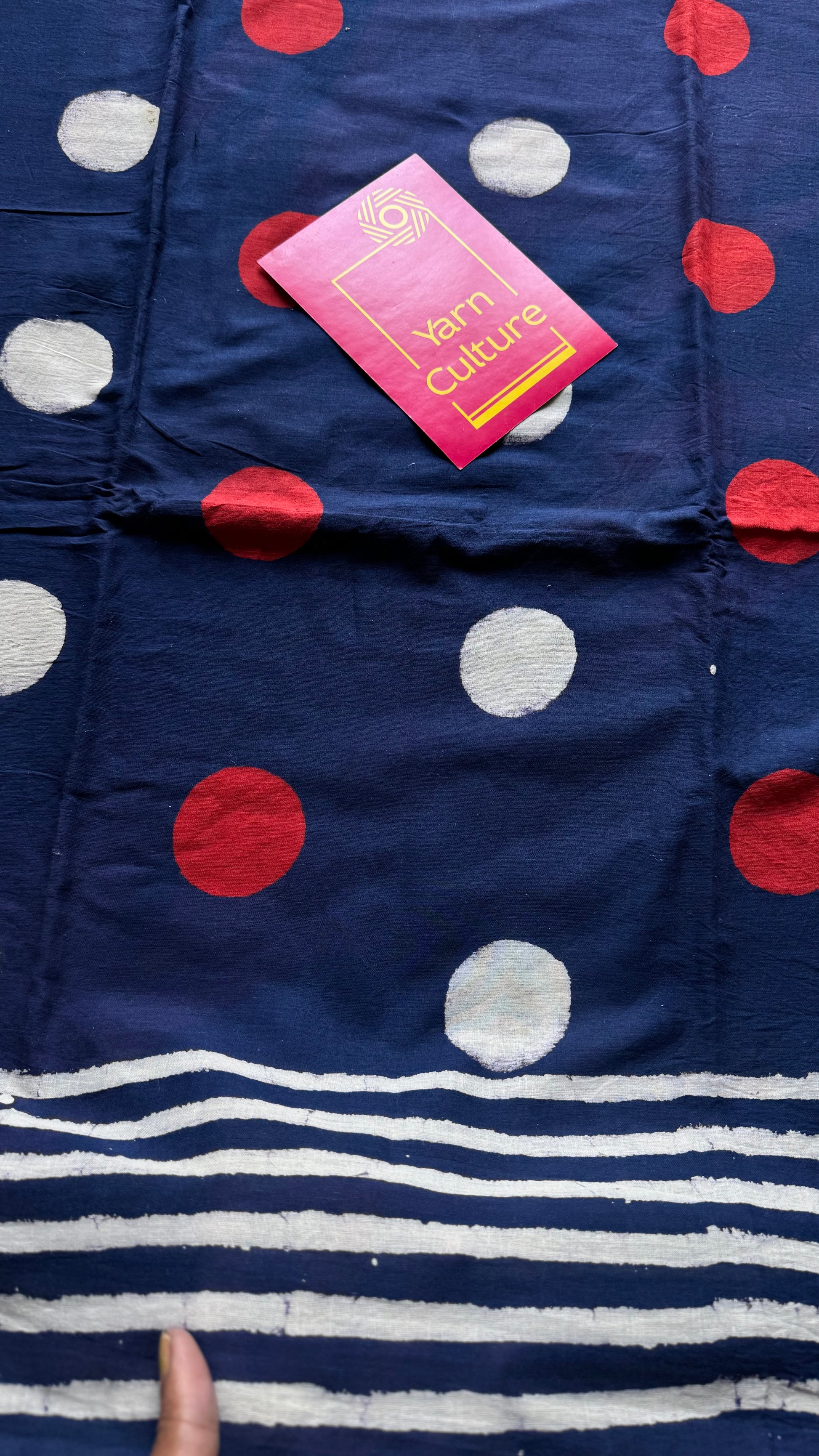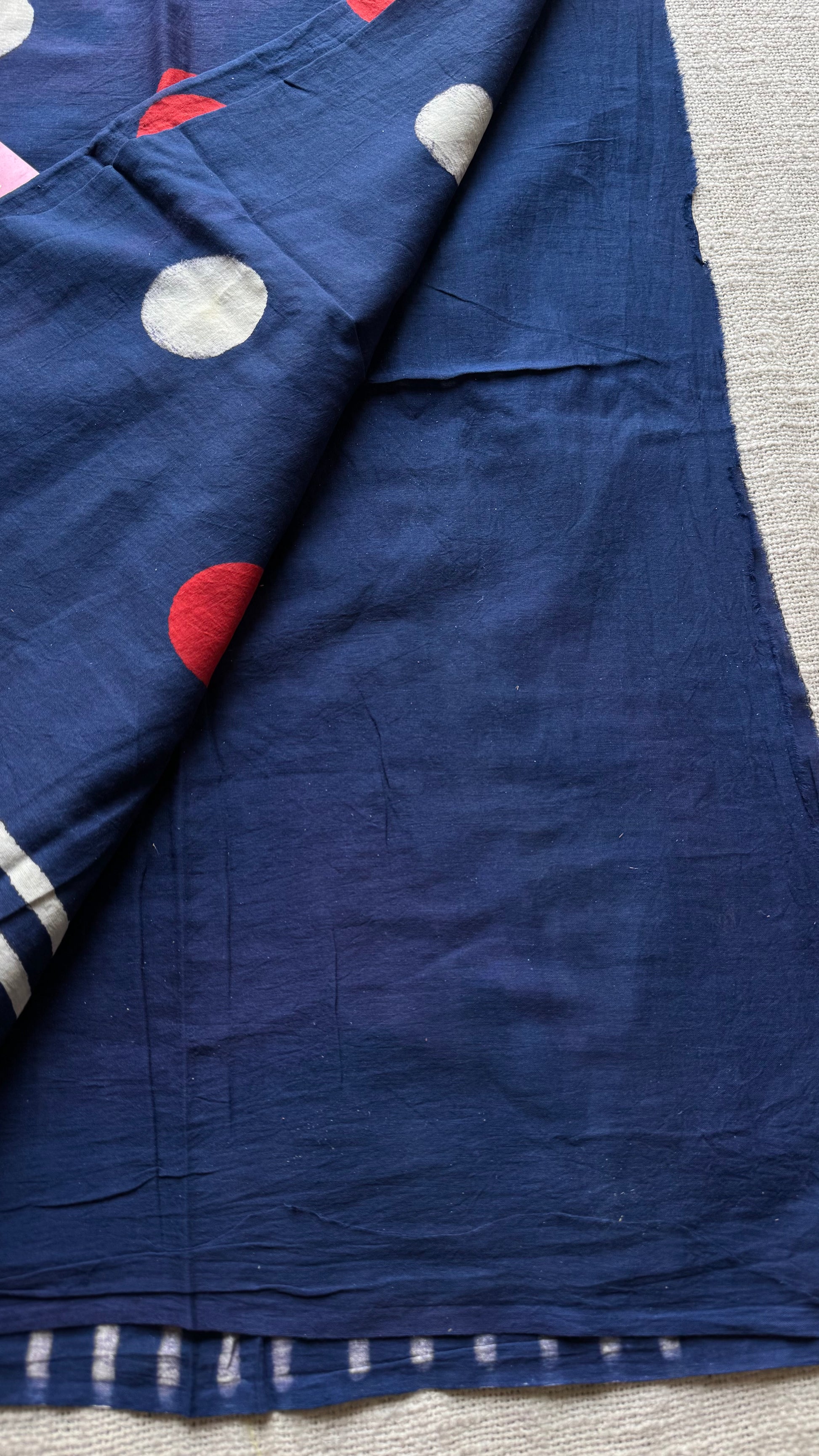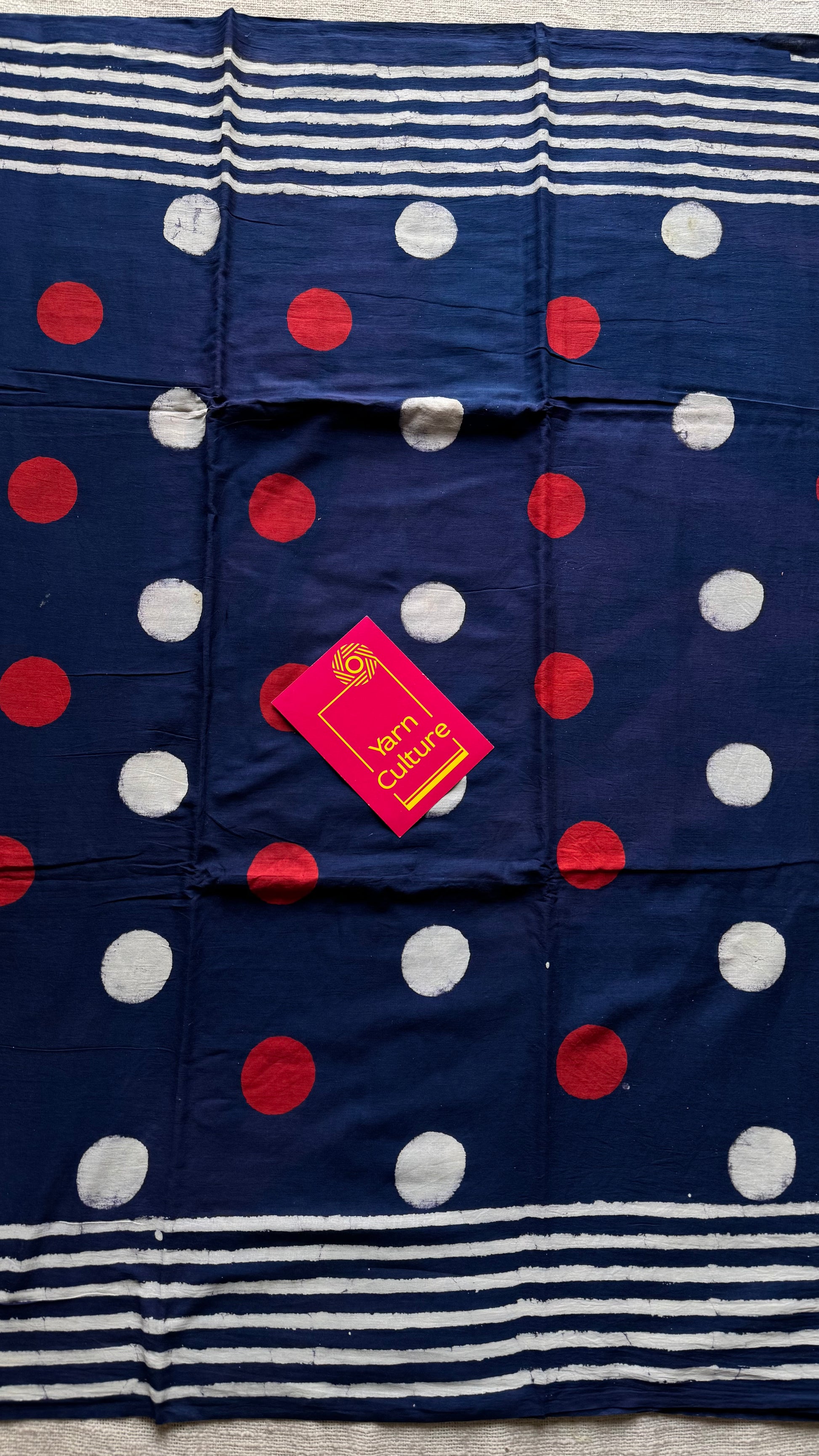Indigo with red and white cirlce motifs, block printed soft cotton saree - YCTORCMA11