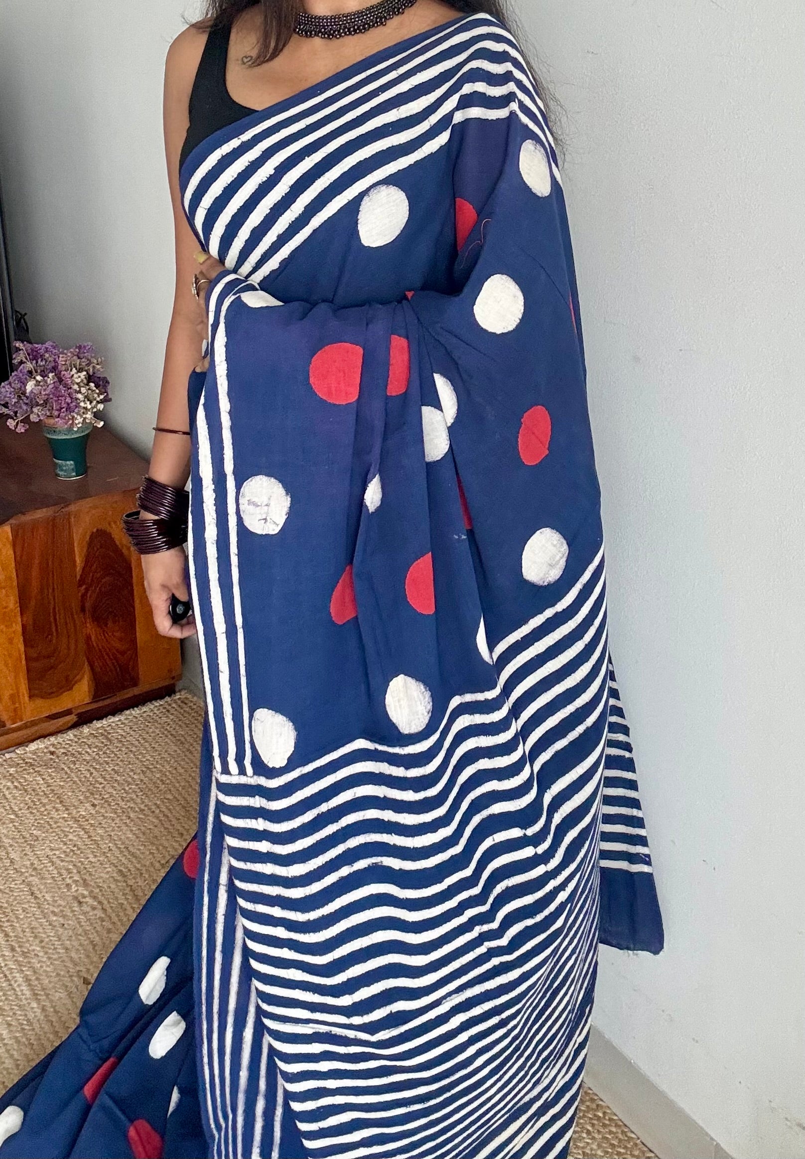 breathable cotton, lightweight drape, bagru saree, jaipur cotton, soft cotton saree, summer essential, everyday saree, office saree, summer sarees, indigo sarees