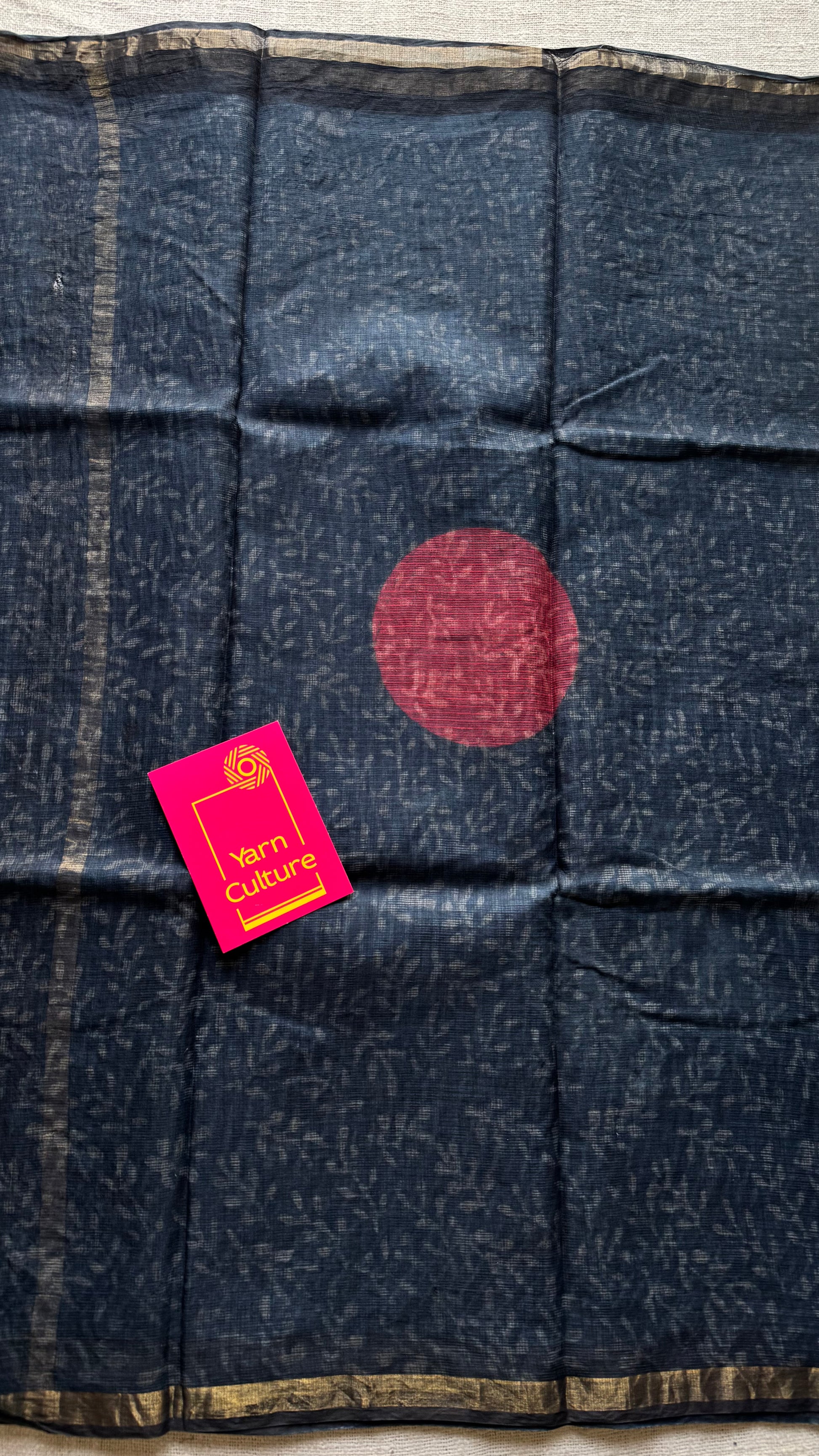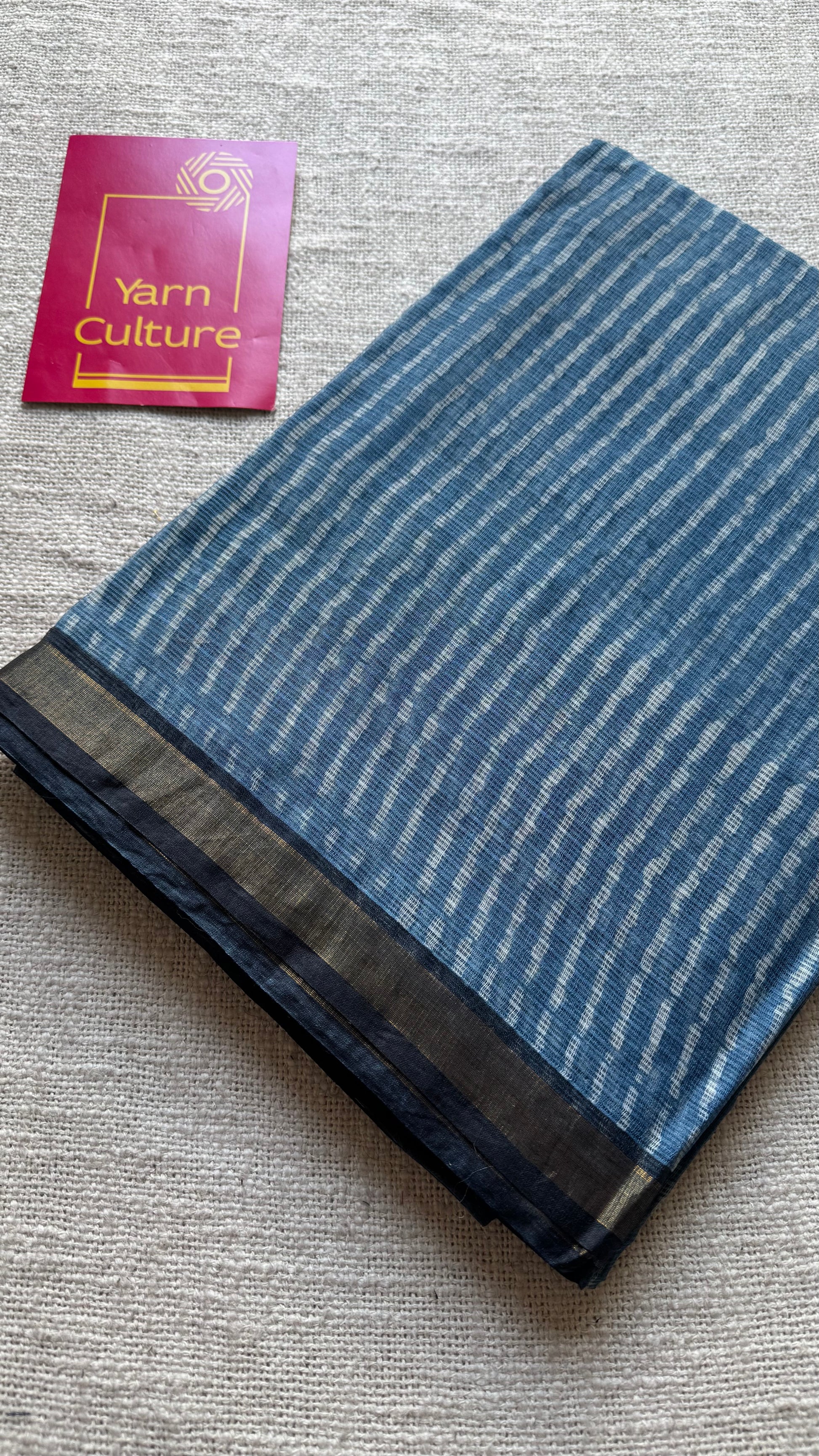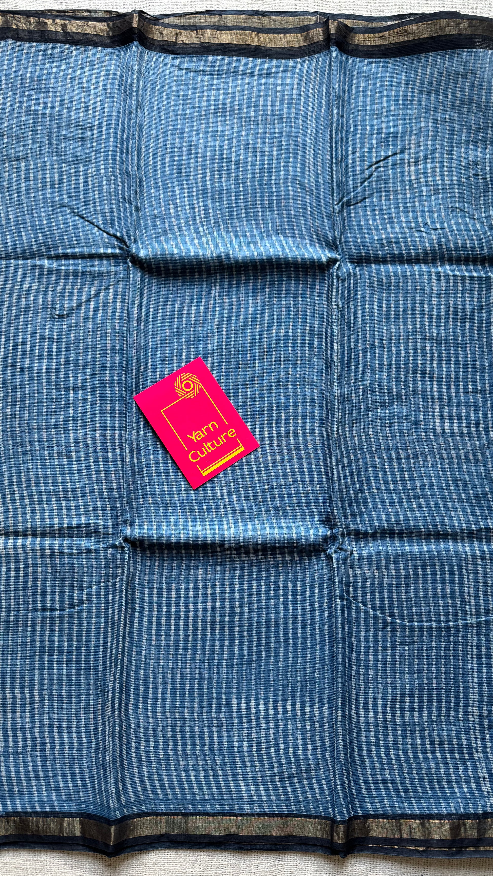 Indigo stripes flow into a black-highlighted border with antique gold zari, leading to a plain black pallu marked by a bold red dot. Bindu is striking in its simplicity, symbolic, meditative, and deeply artistic, echoing the essence of Indian design where every detail tells a story.