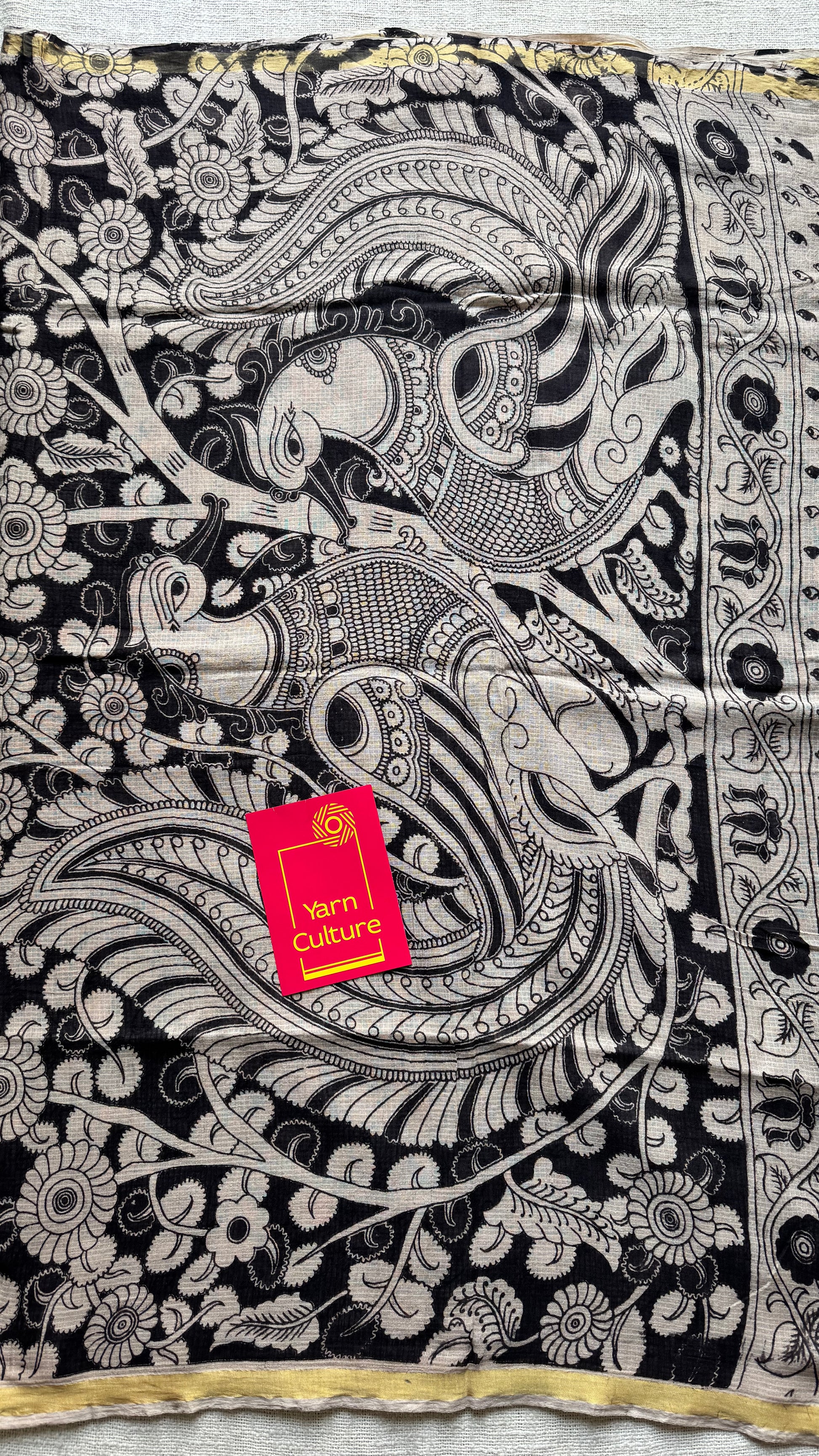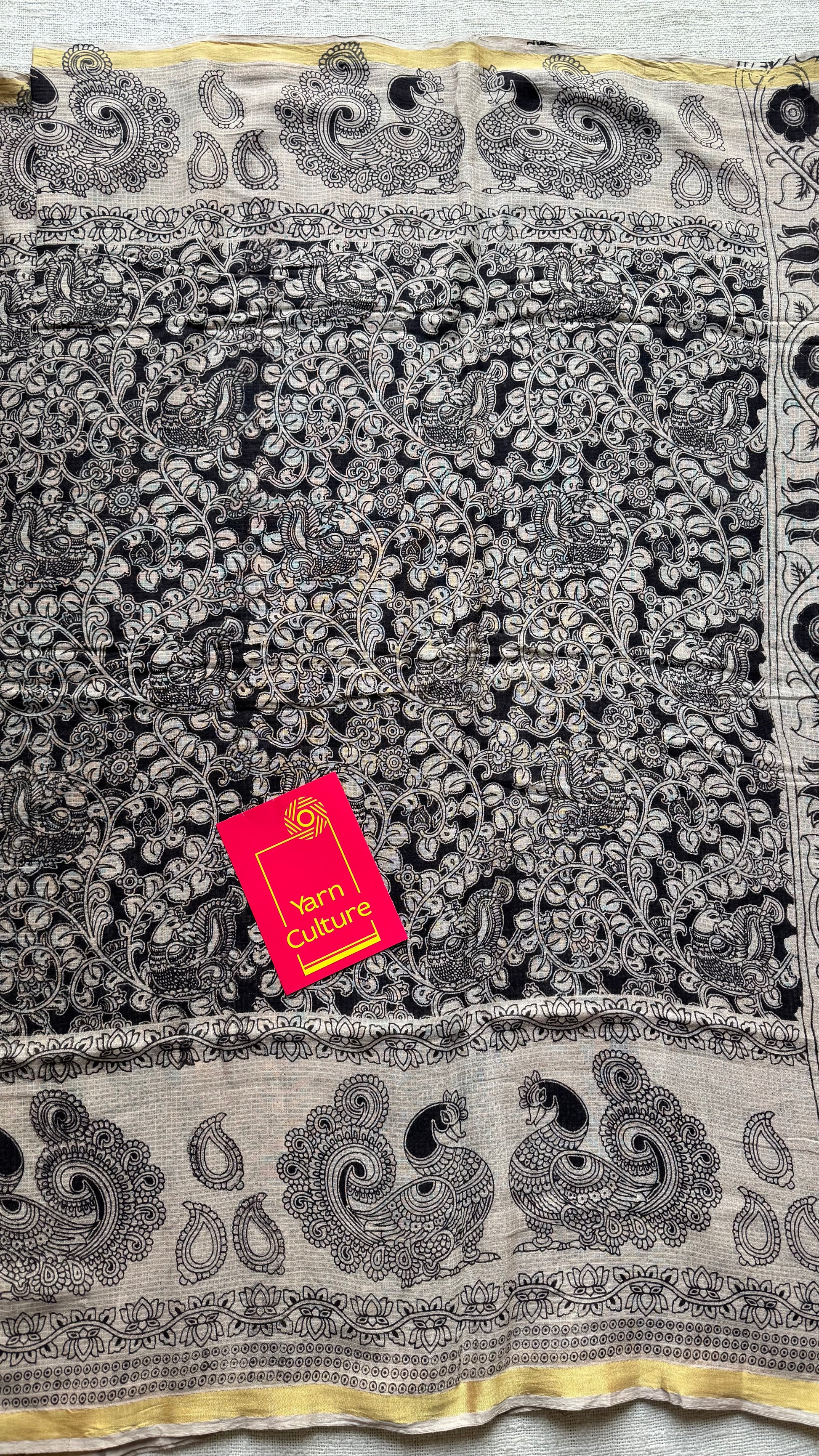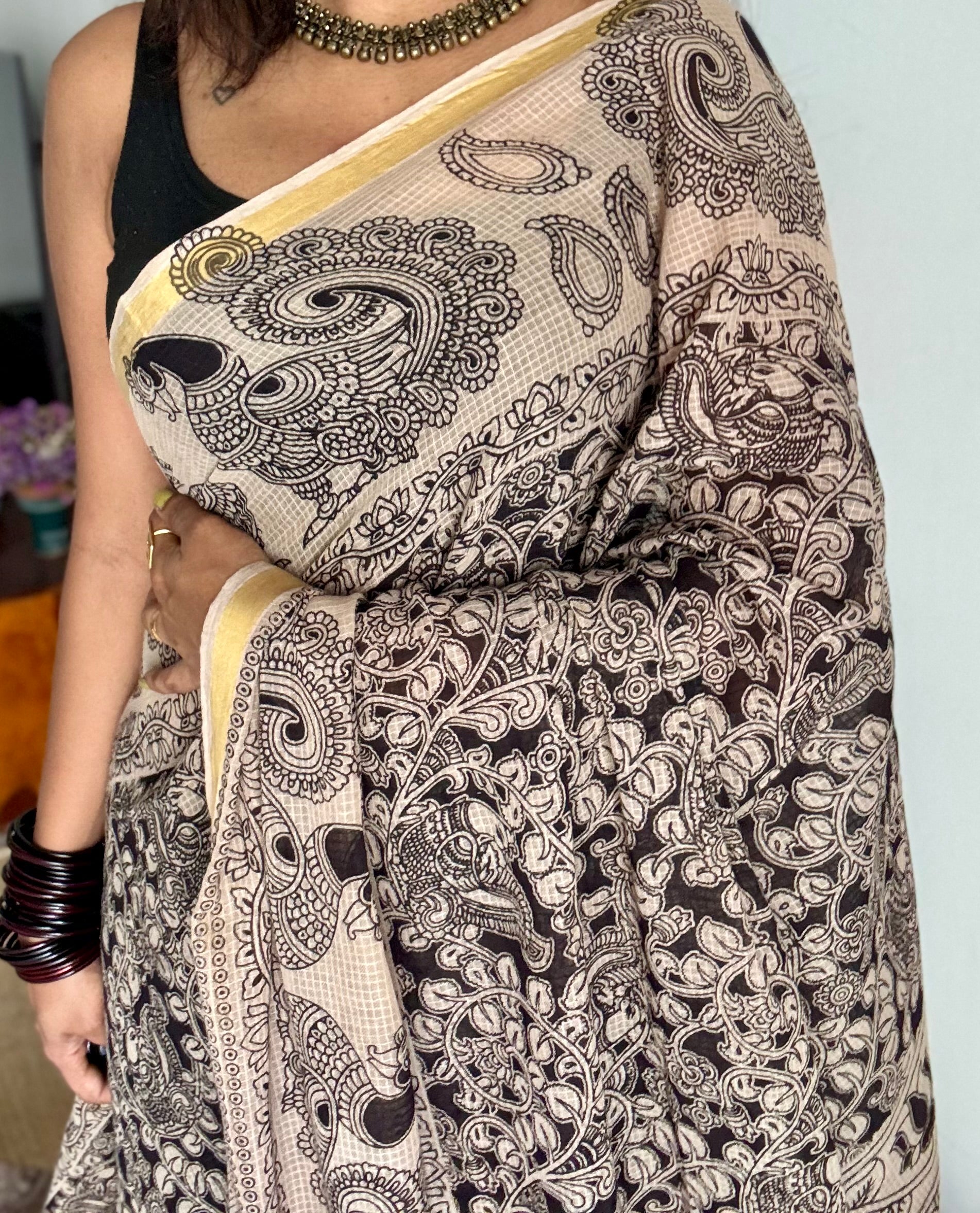 Black cream floral kalamkari saree in kota, with zari border - YCWOTDKKFE19