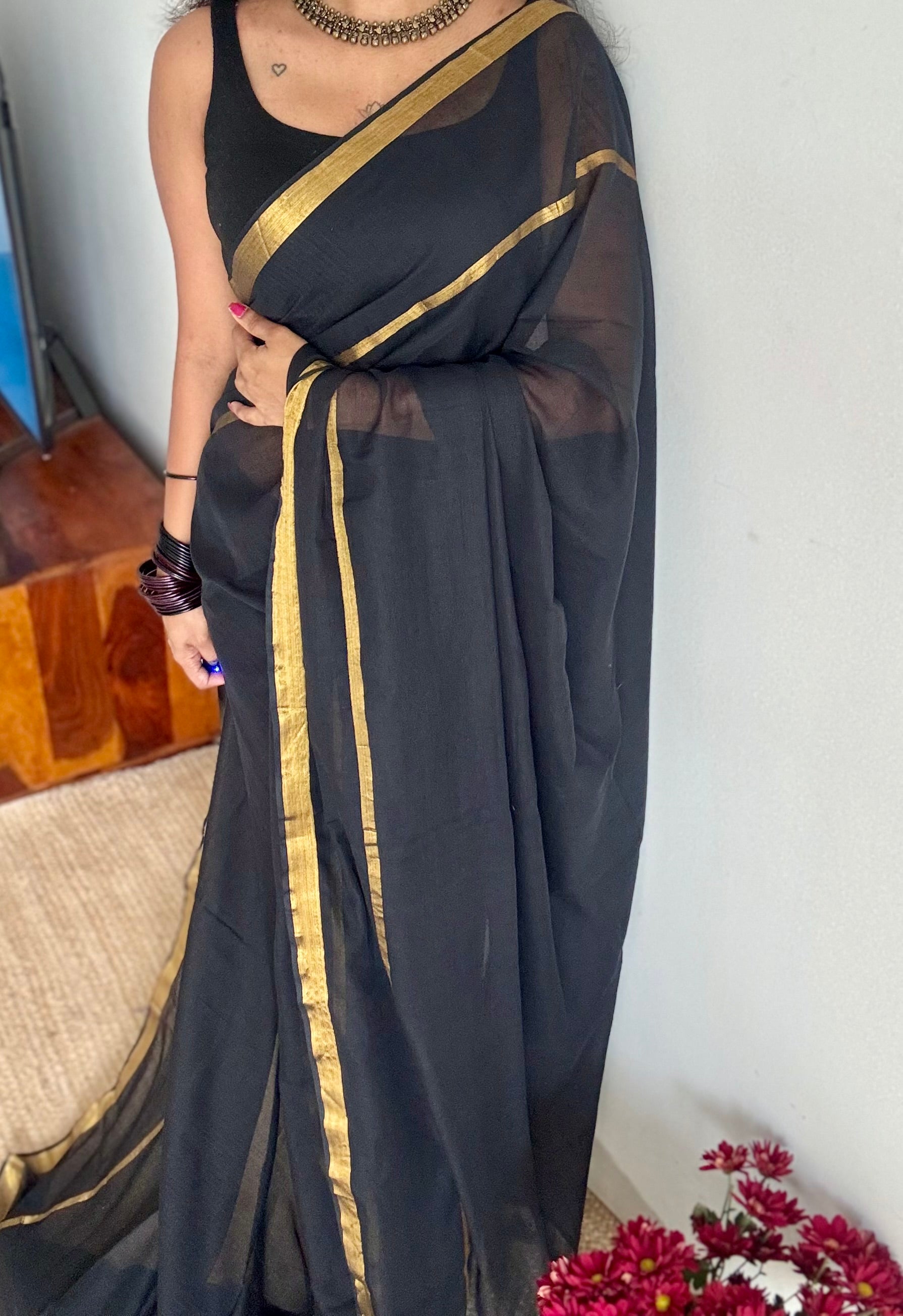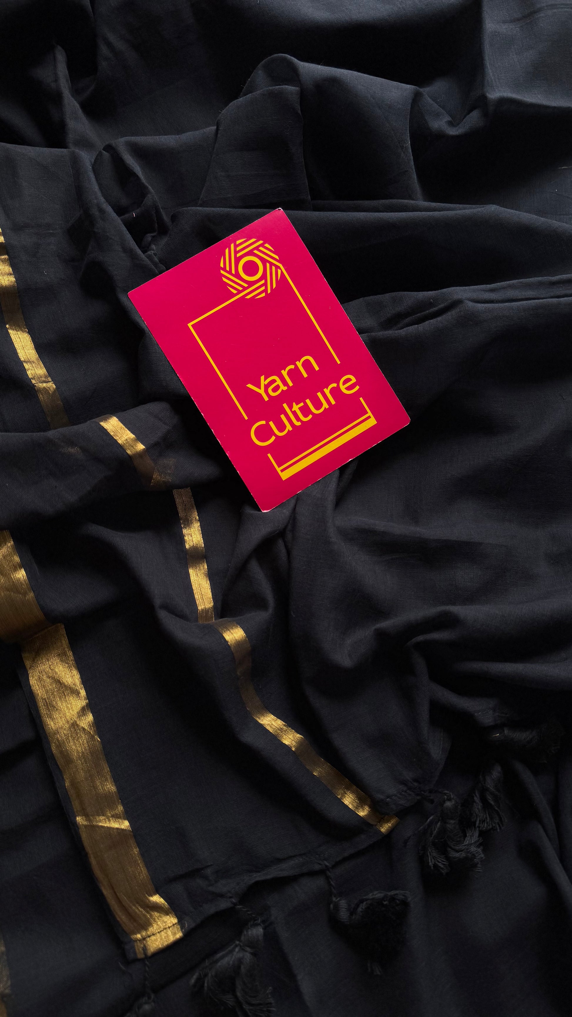 Everybody's favourite mul cotton in black with antique gold zari in gap border pattern and with tassels.