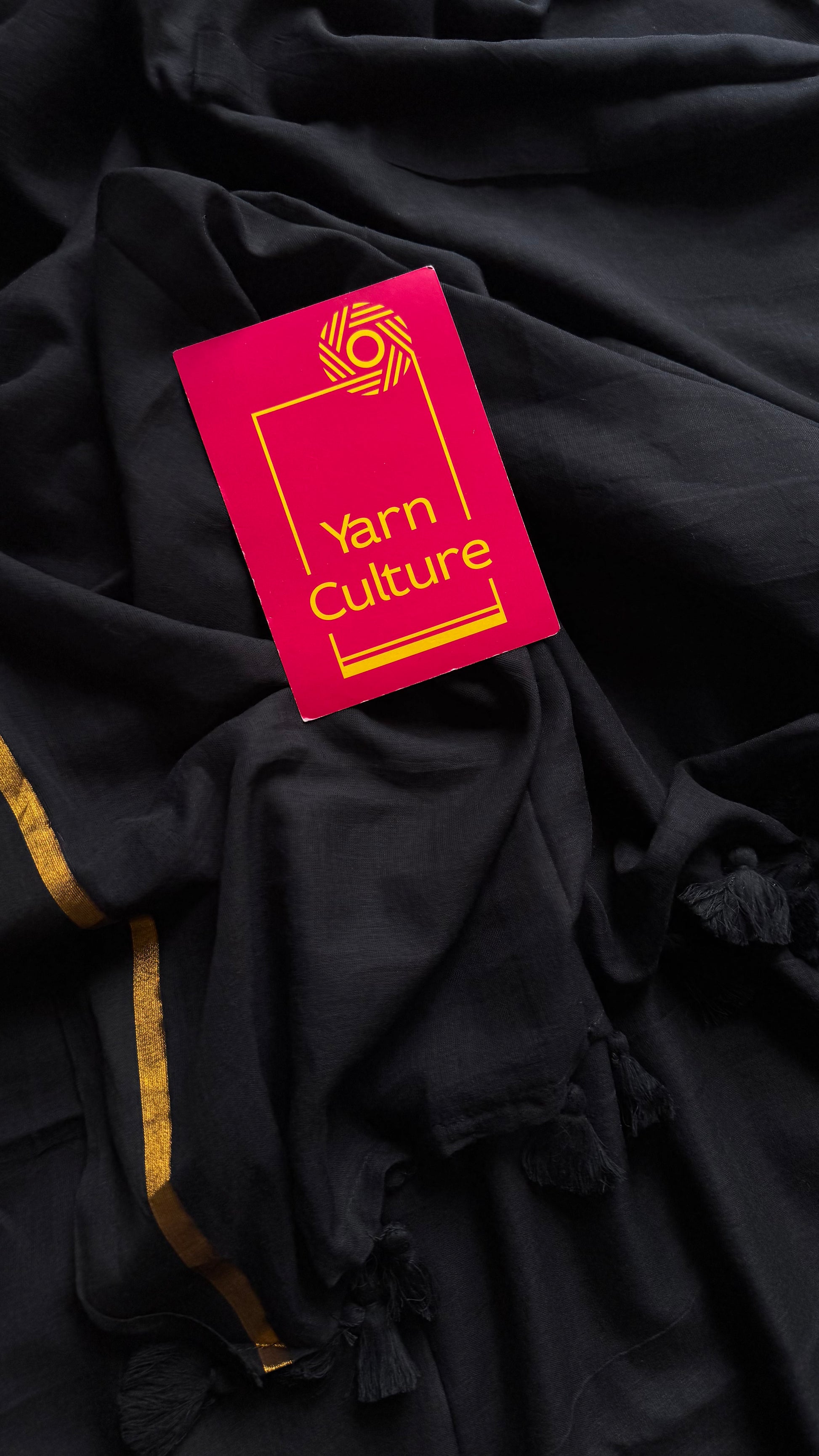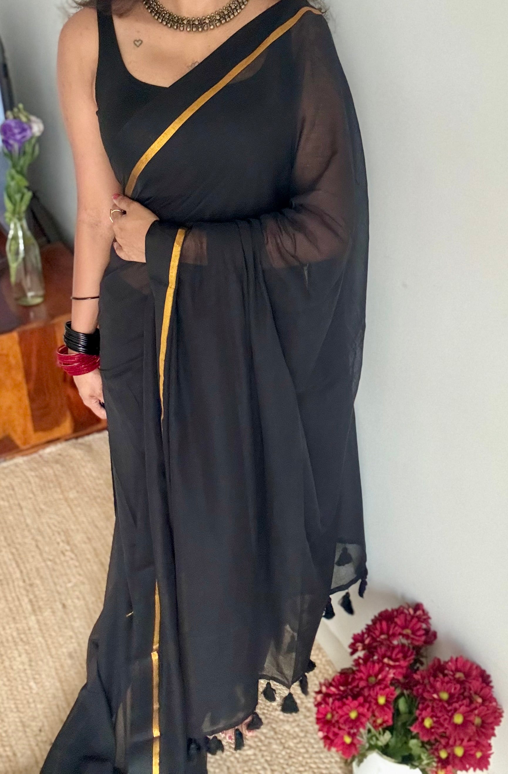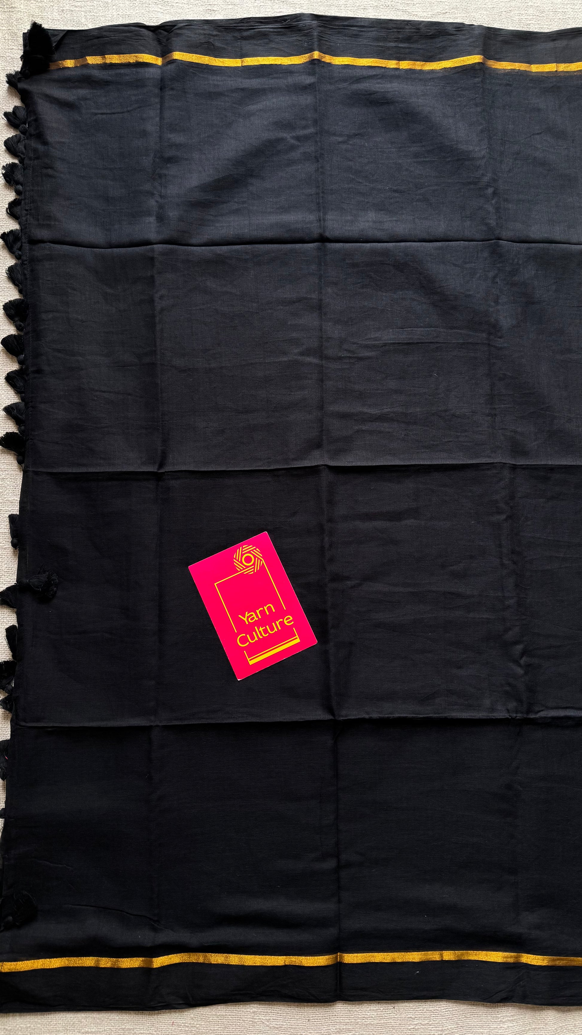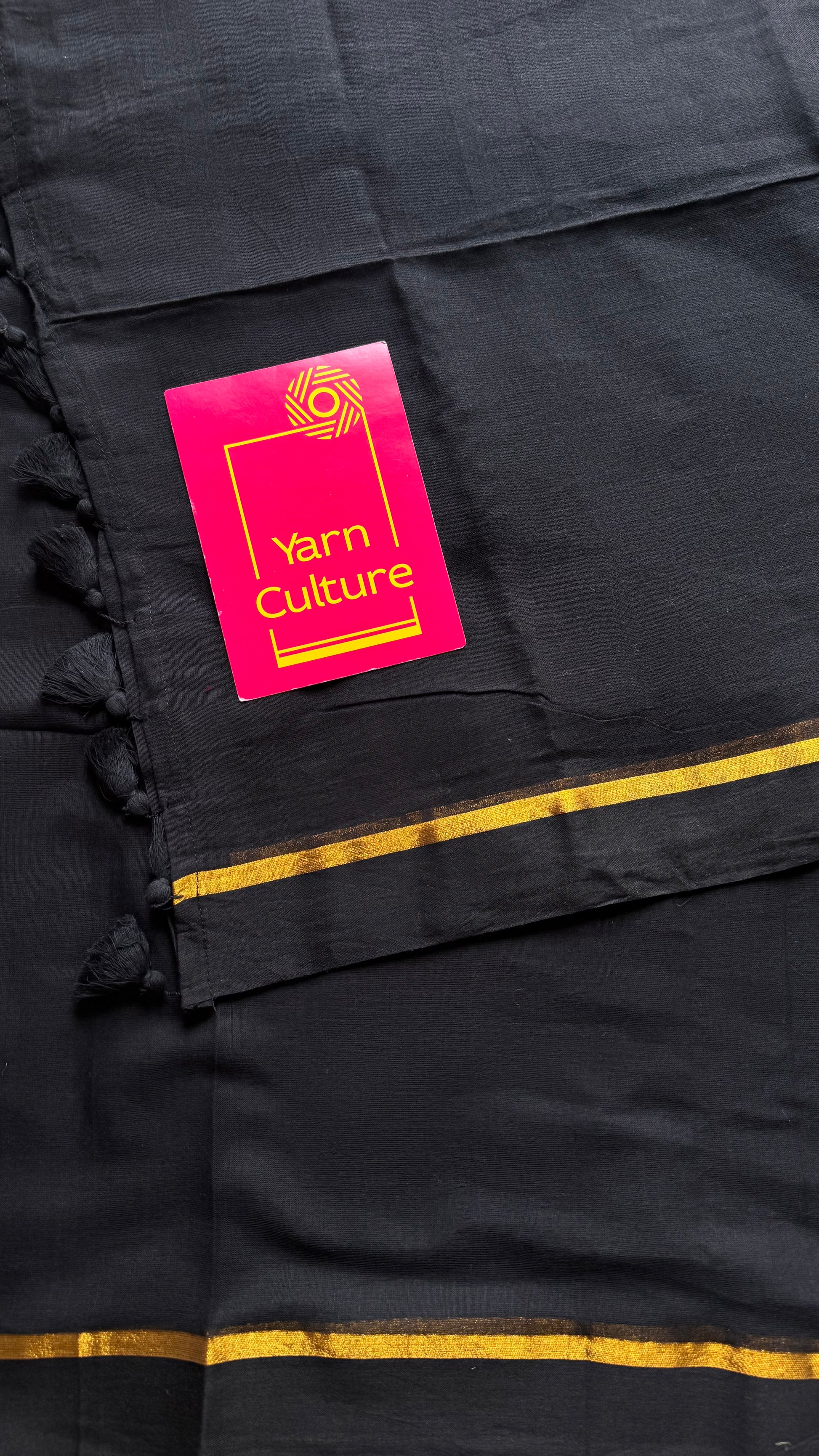 Everybody's favourite mul cotton in black with thin antique gold zari gap border and with tassels.