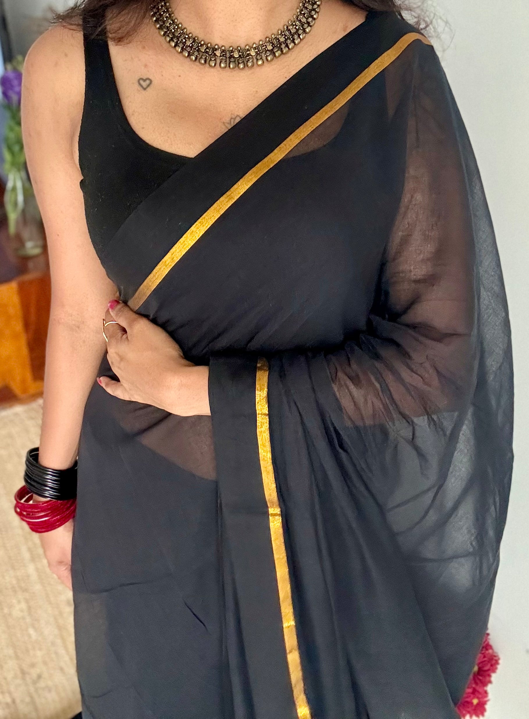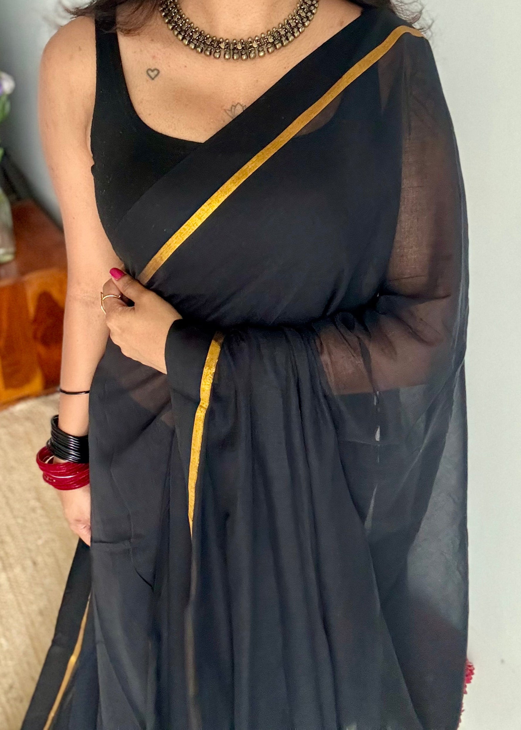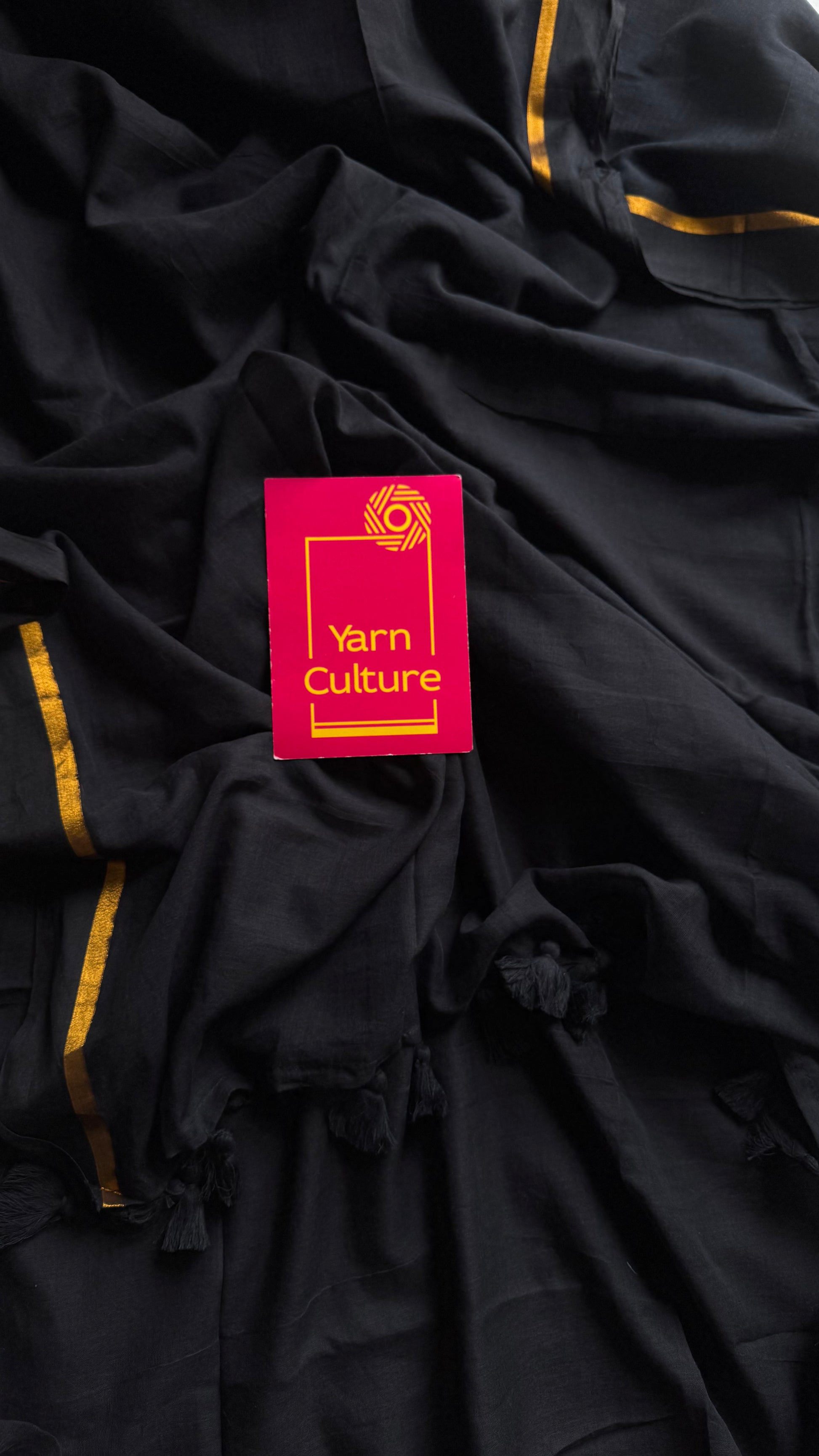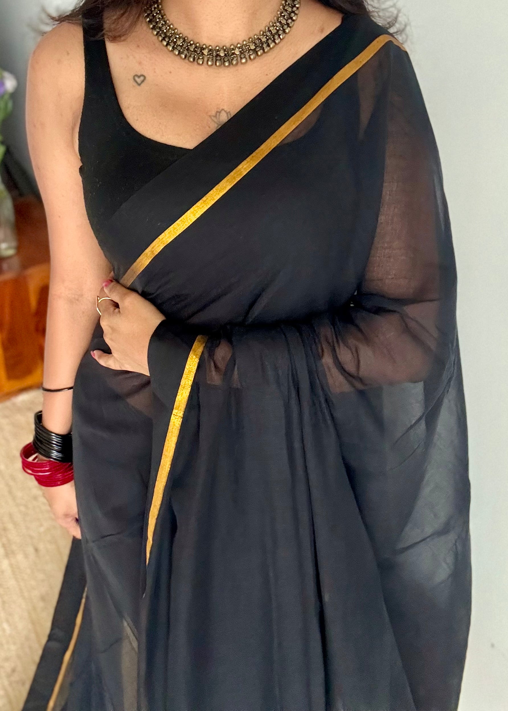 Everybody's favourite mul cotton in black with thin antique gold zari gap border and with tassels.
