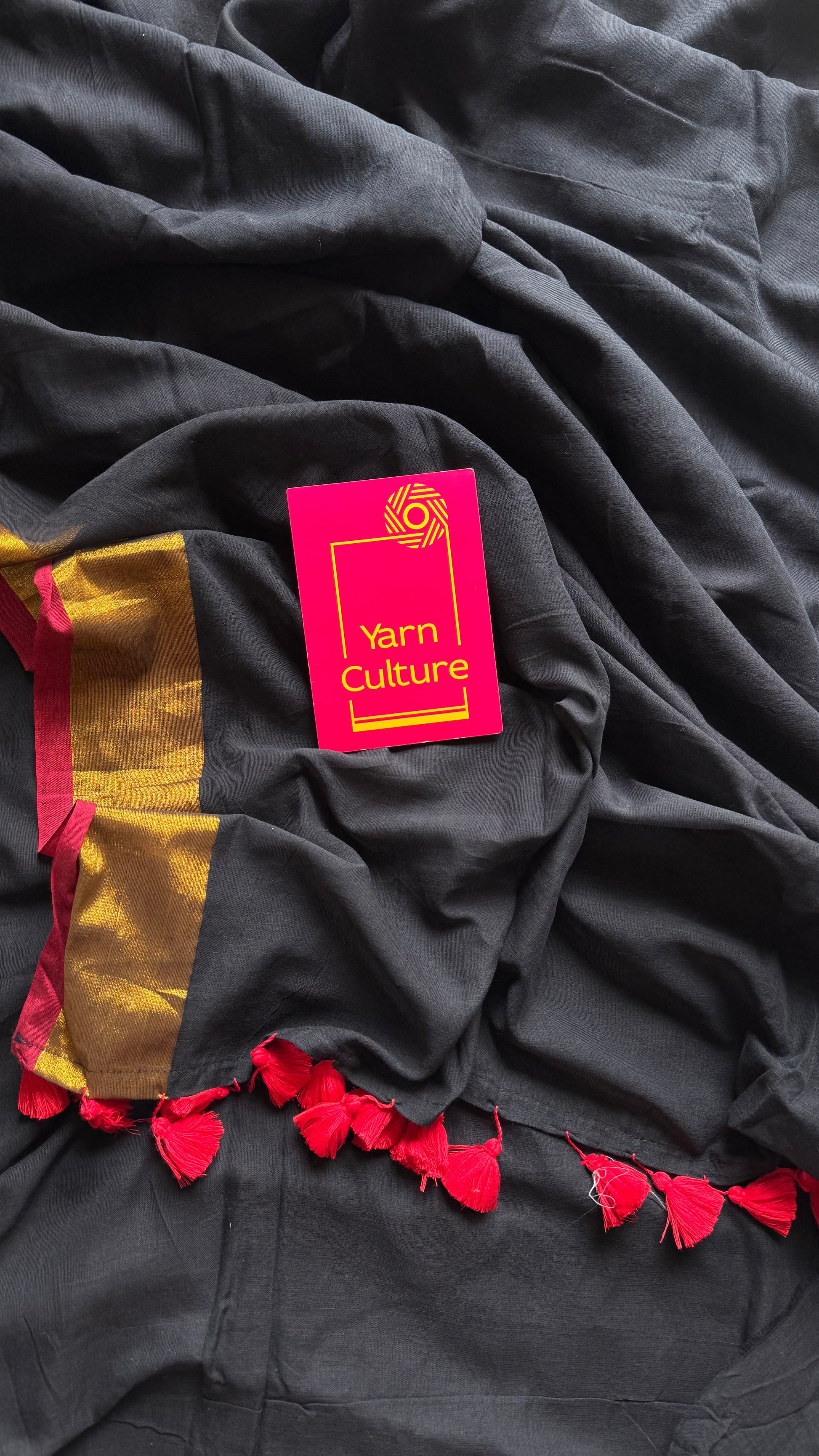 Everybody's favourite mul cotton with contrast antique gold zari border and tassels.
