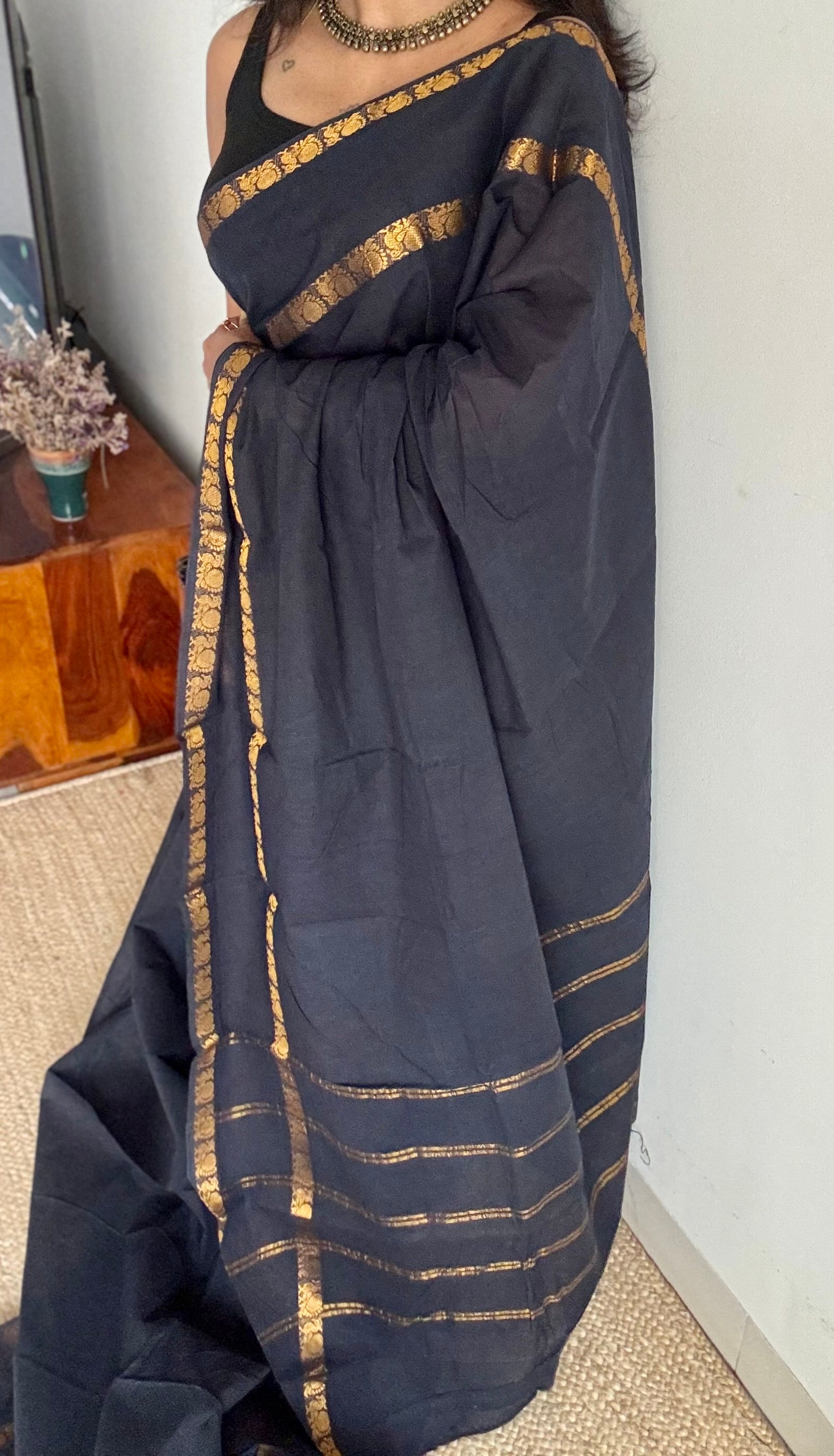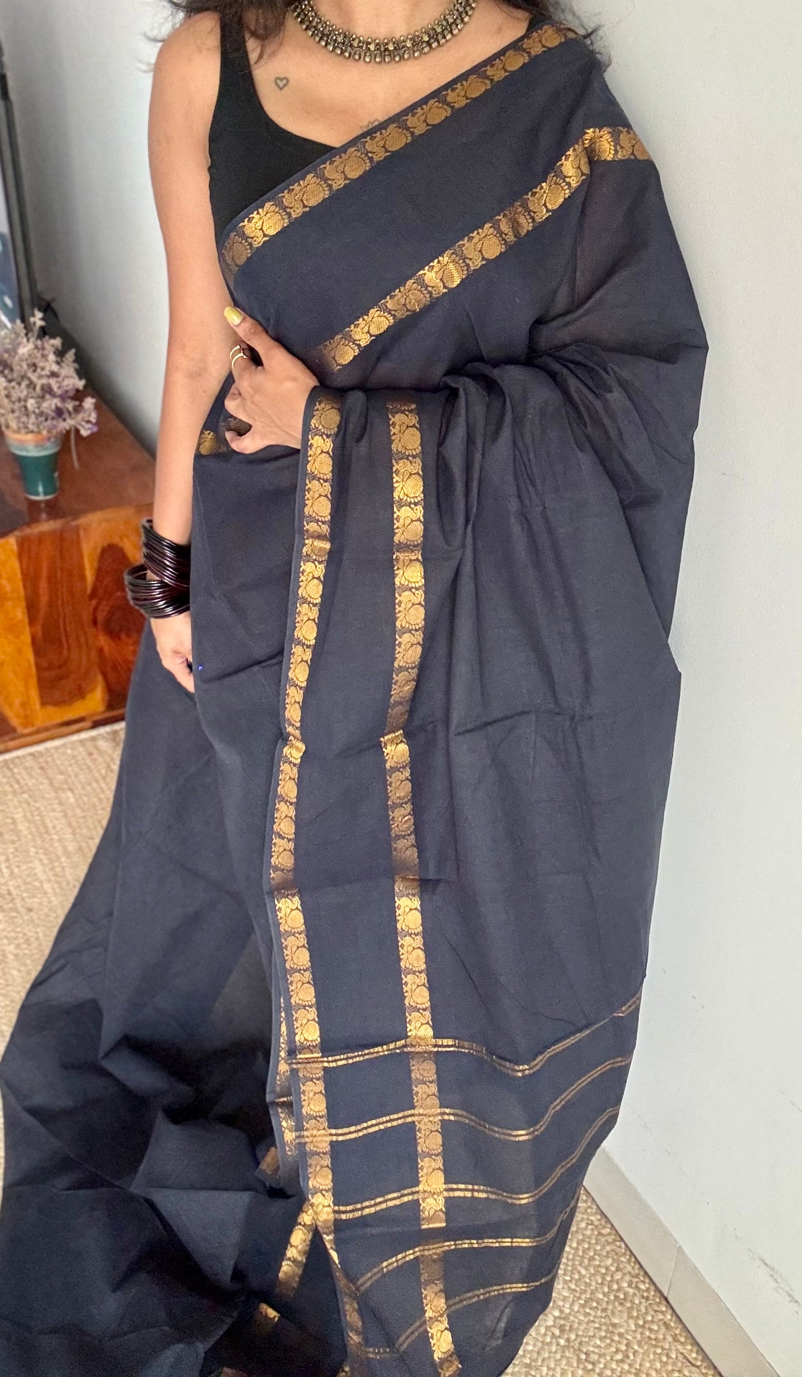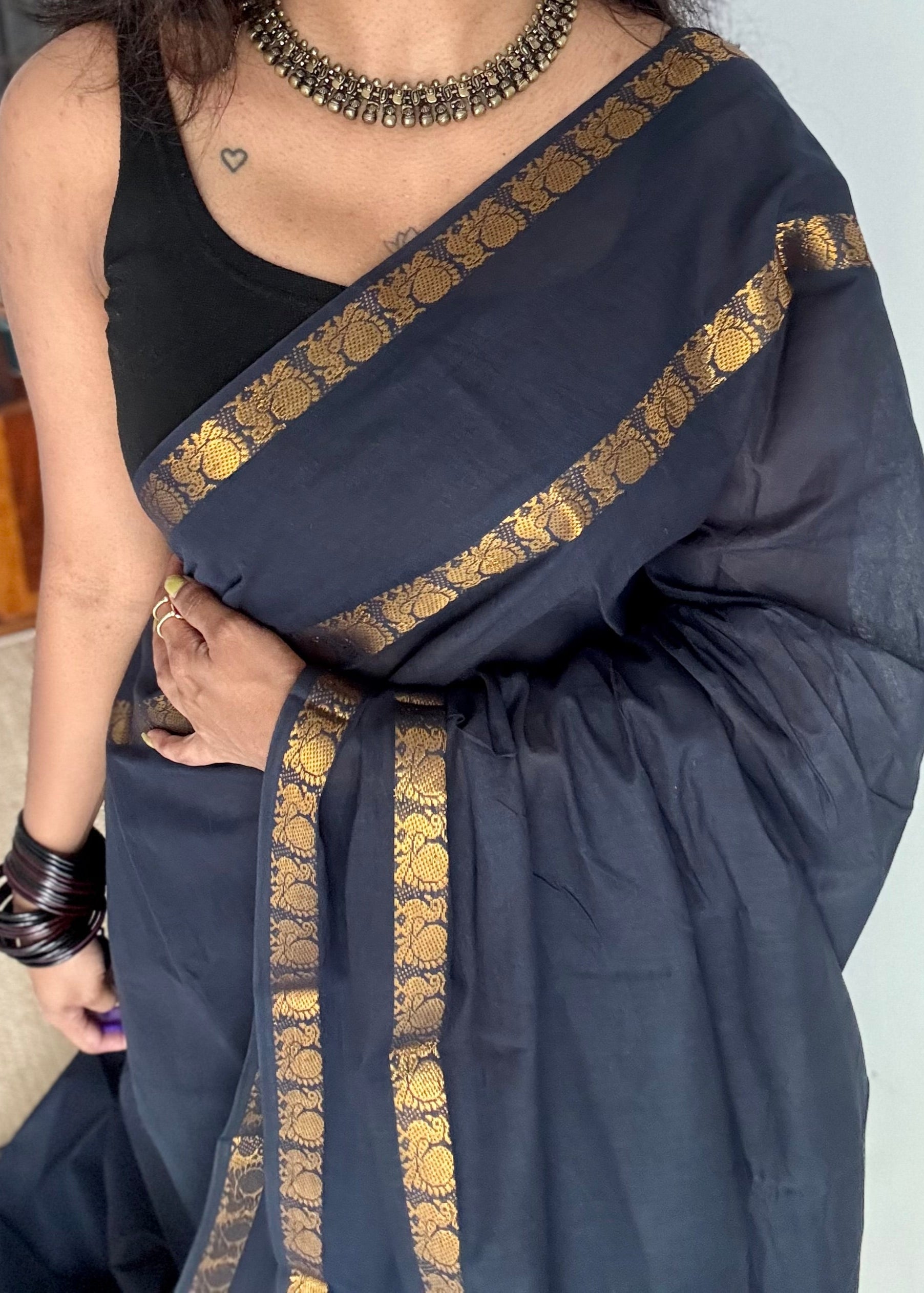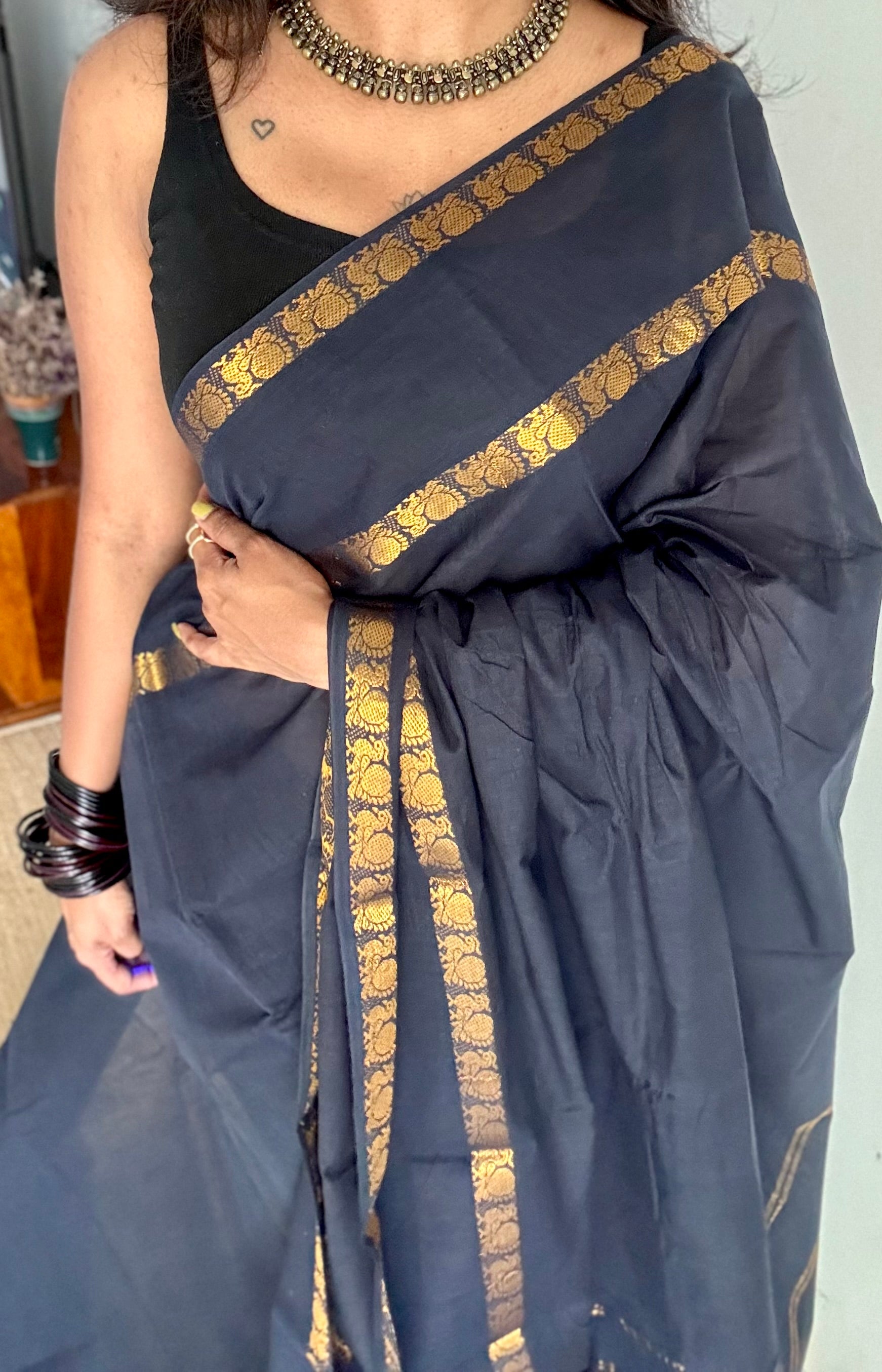 Black rettaipettu peacock double border 💖 Made using the kattuchayam dyeing technique. Comes with 0.9m same colour blouse