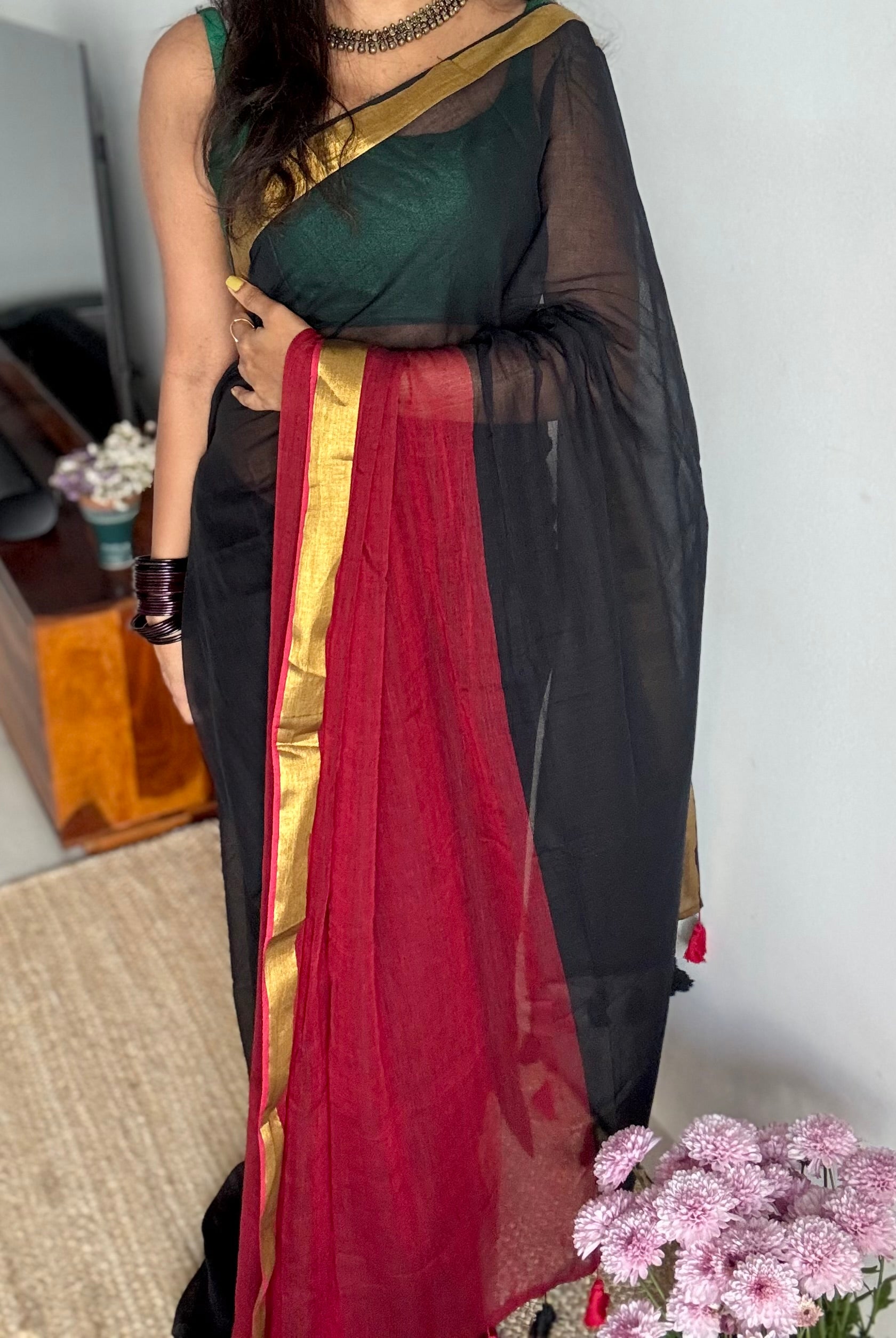 Everybody's favourite mul cotton in black with dark red half-half patterned mul with zari border.