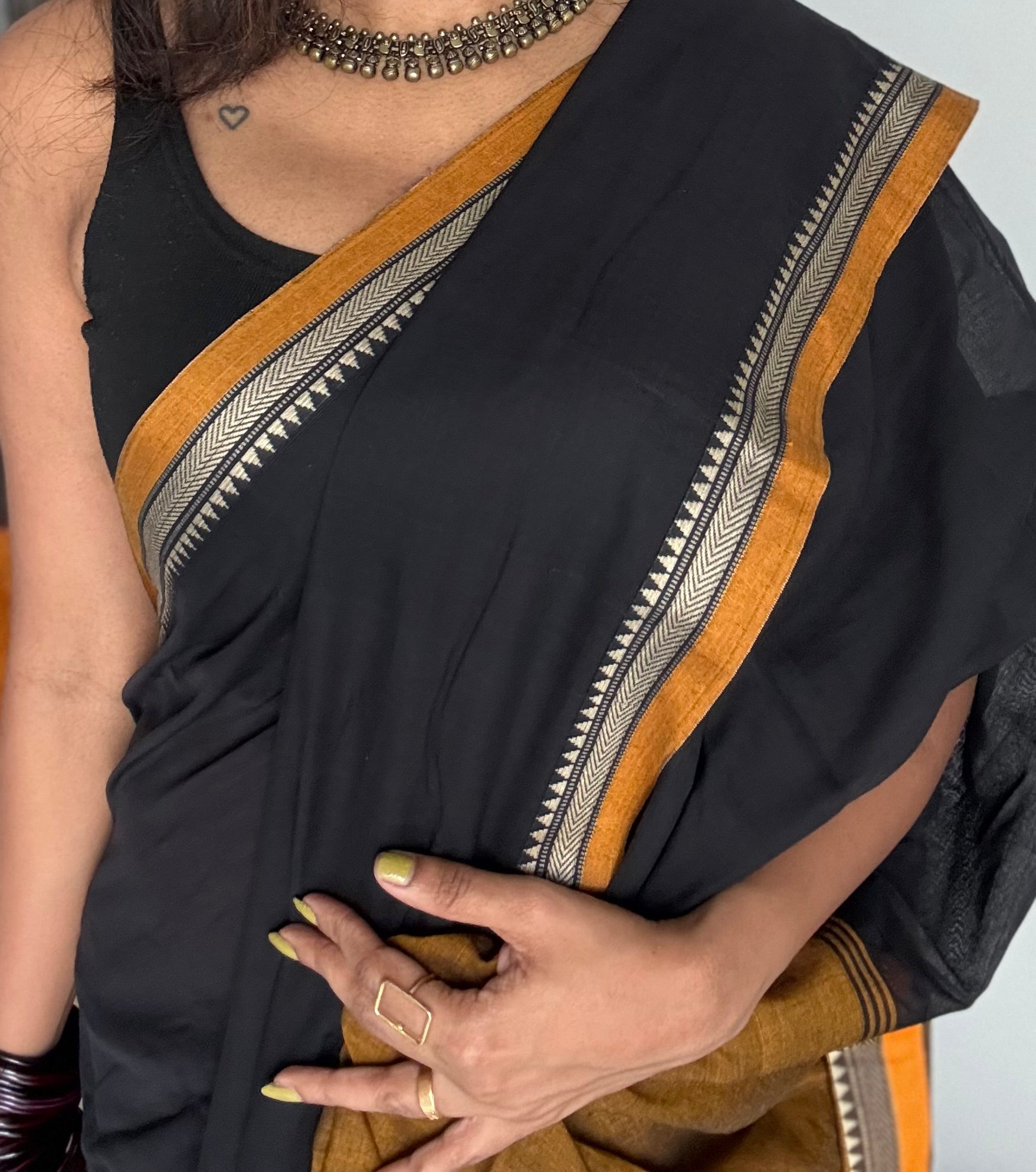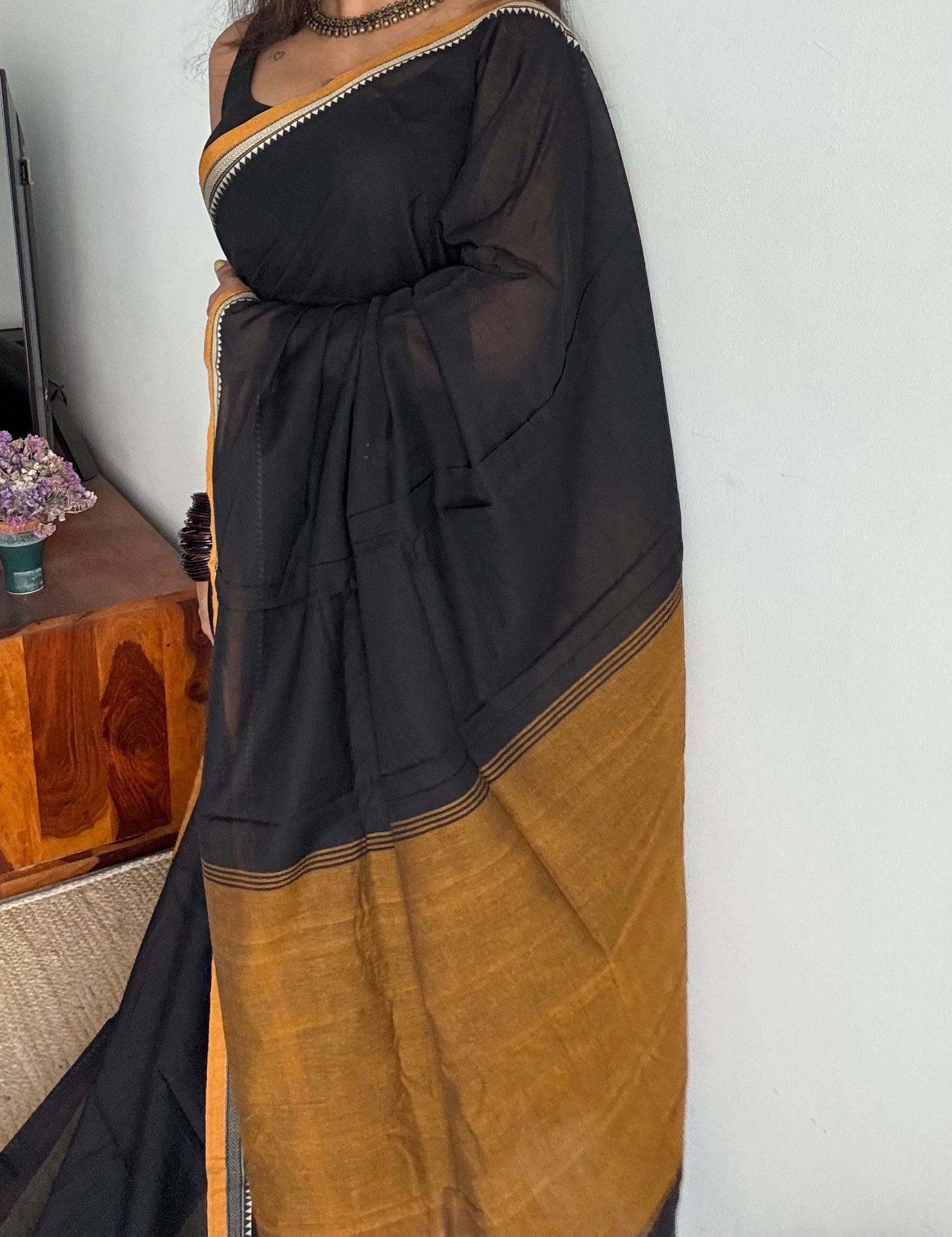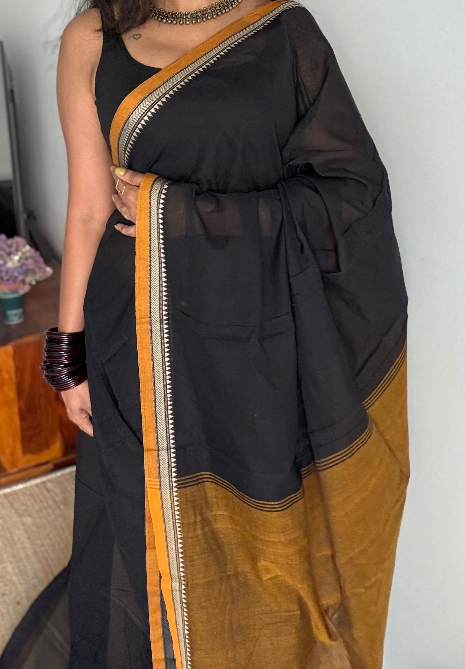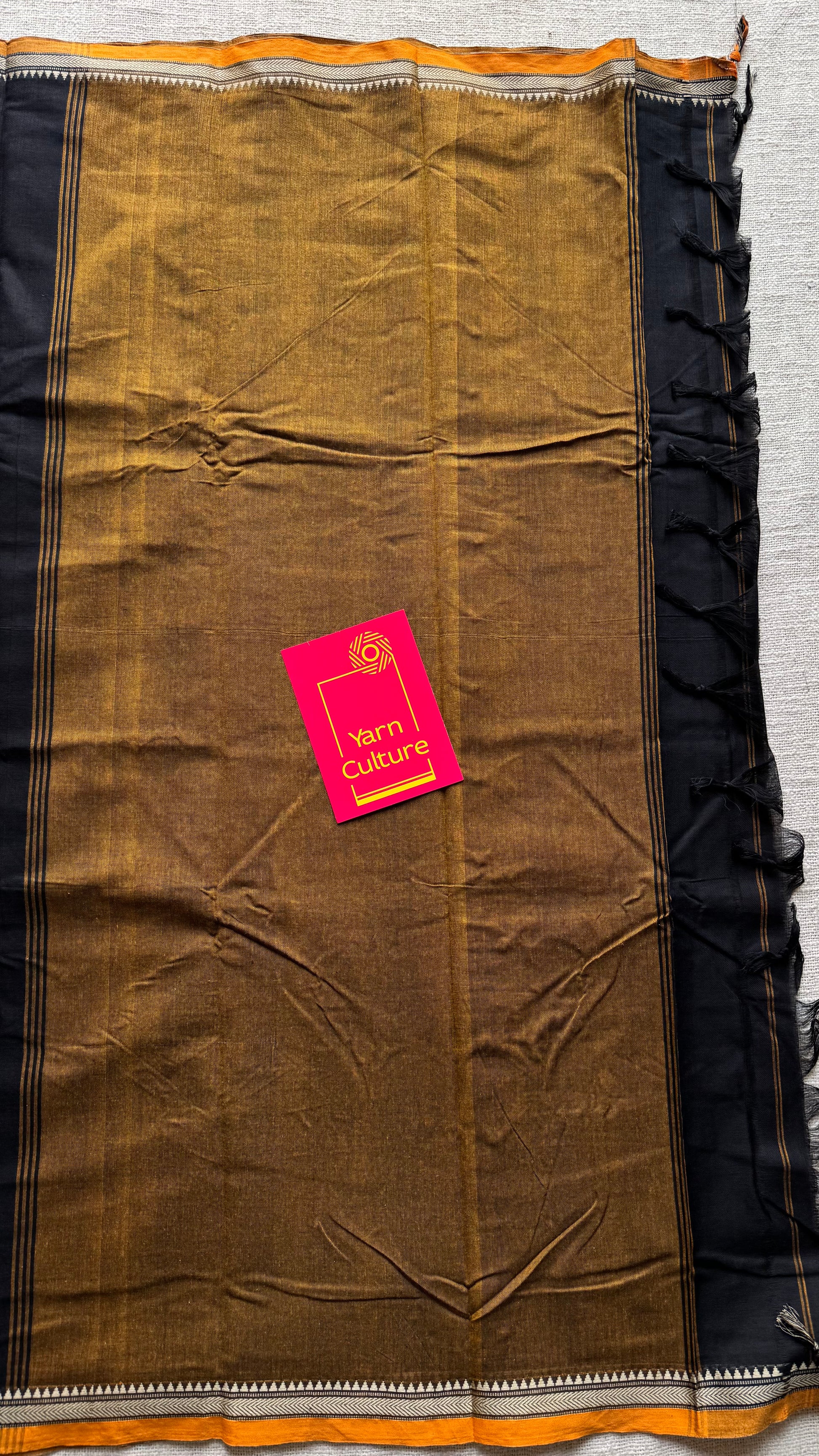 Black with dark yellow border narayanpet saree, soft cotton - YCWOTDNPFE29