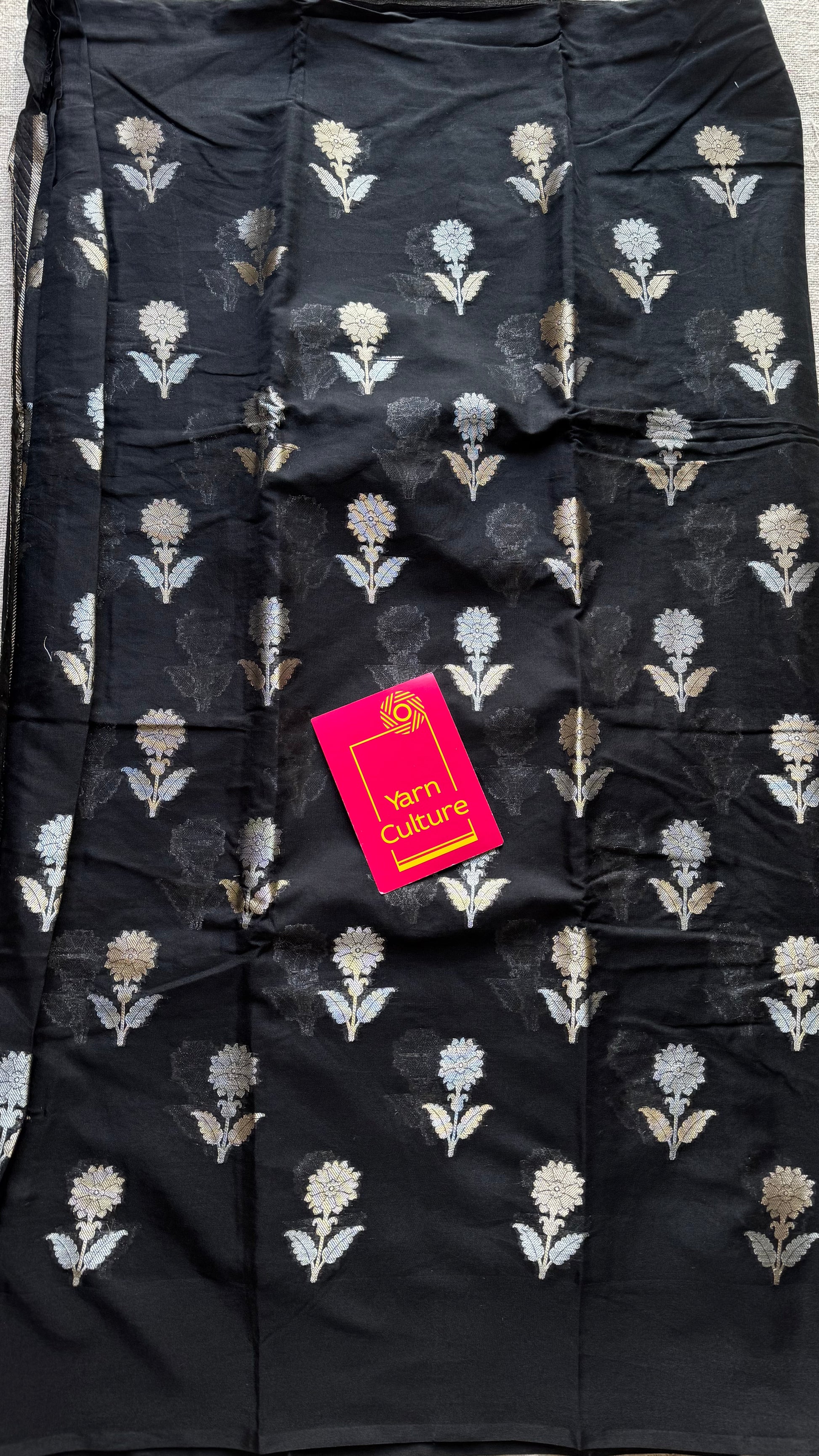 Black with gold and silver floral buttas, Banarasi semi-crepe silk - YCDESE49