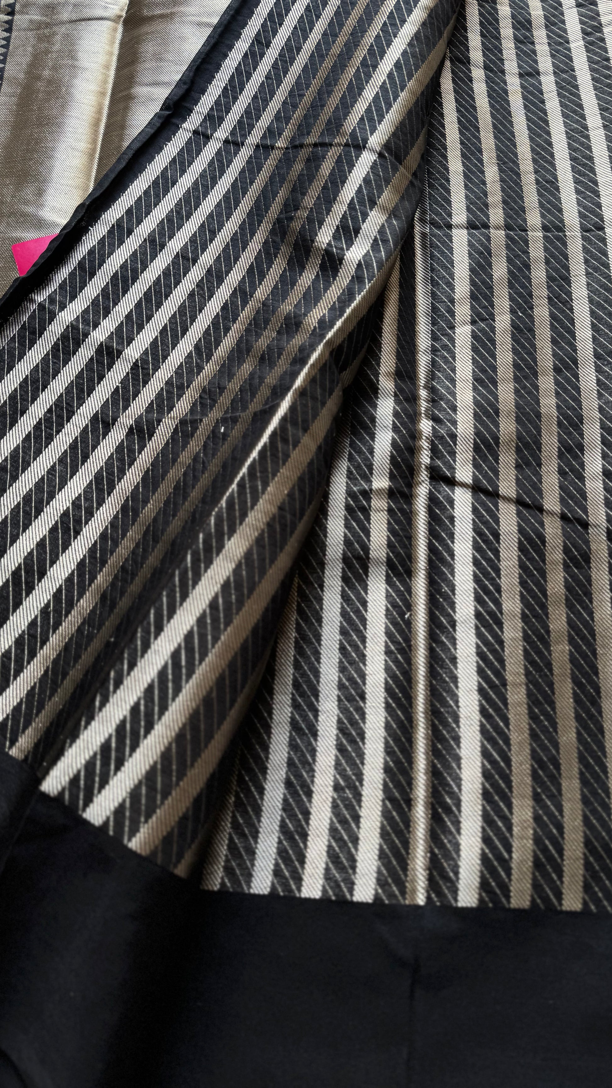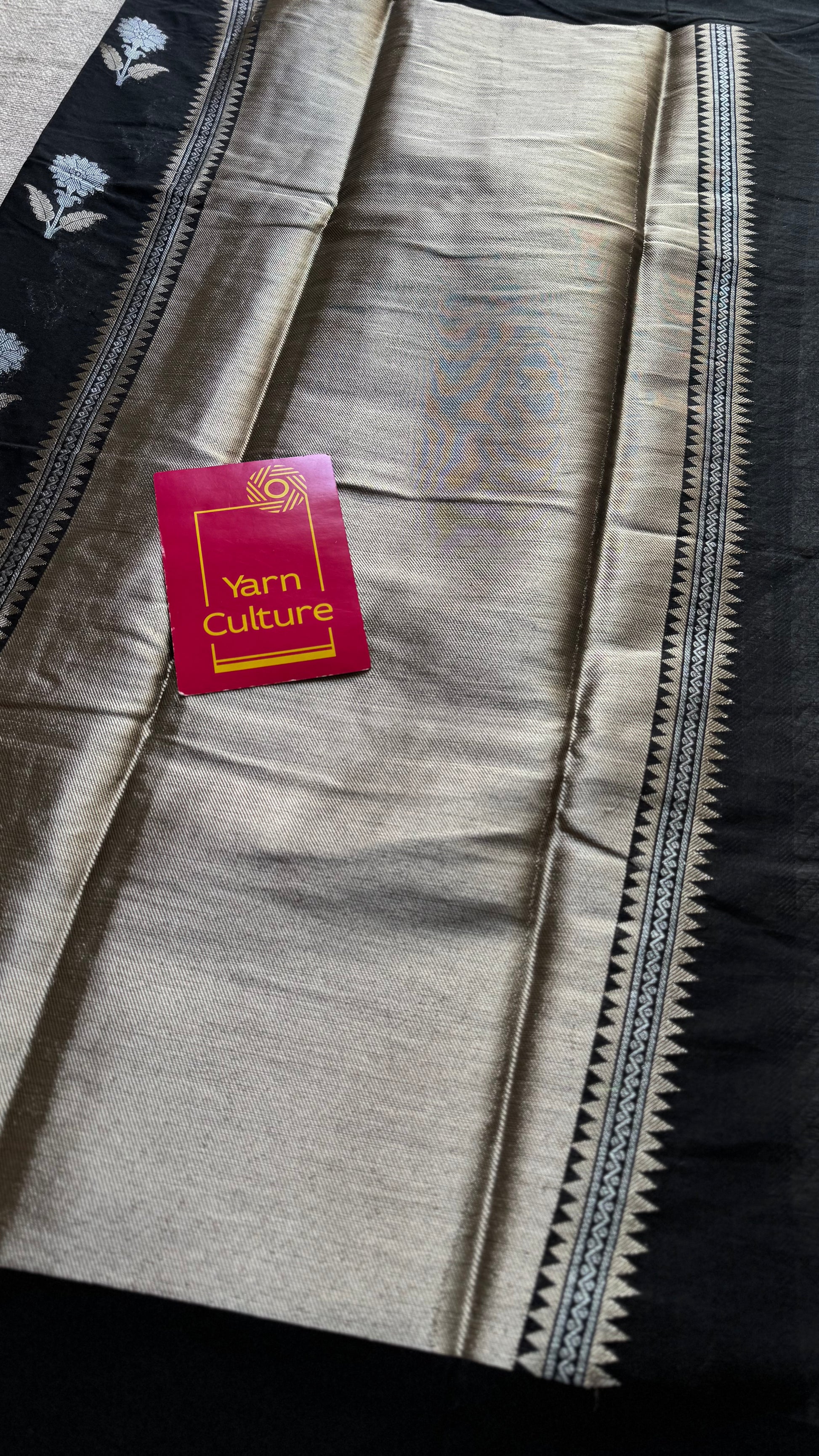 Black Banarasi semi-crepe silk with silver and gold floral buttas, plain satin border - festive, and perfect for Diwali or any occasion. Intricate pallu and blouse fabric. Effortless to drape, flowy, light to carry, and rich in look, this is a saree made to shine with you this season.