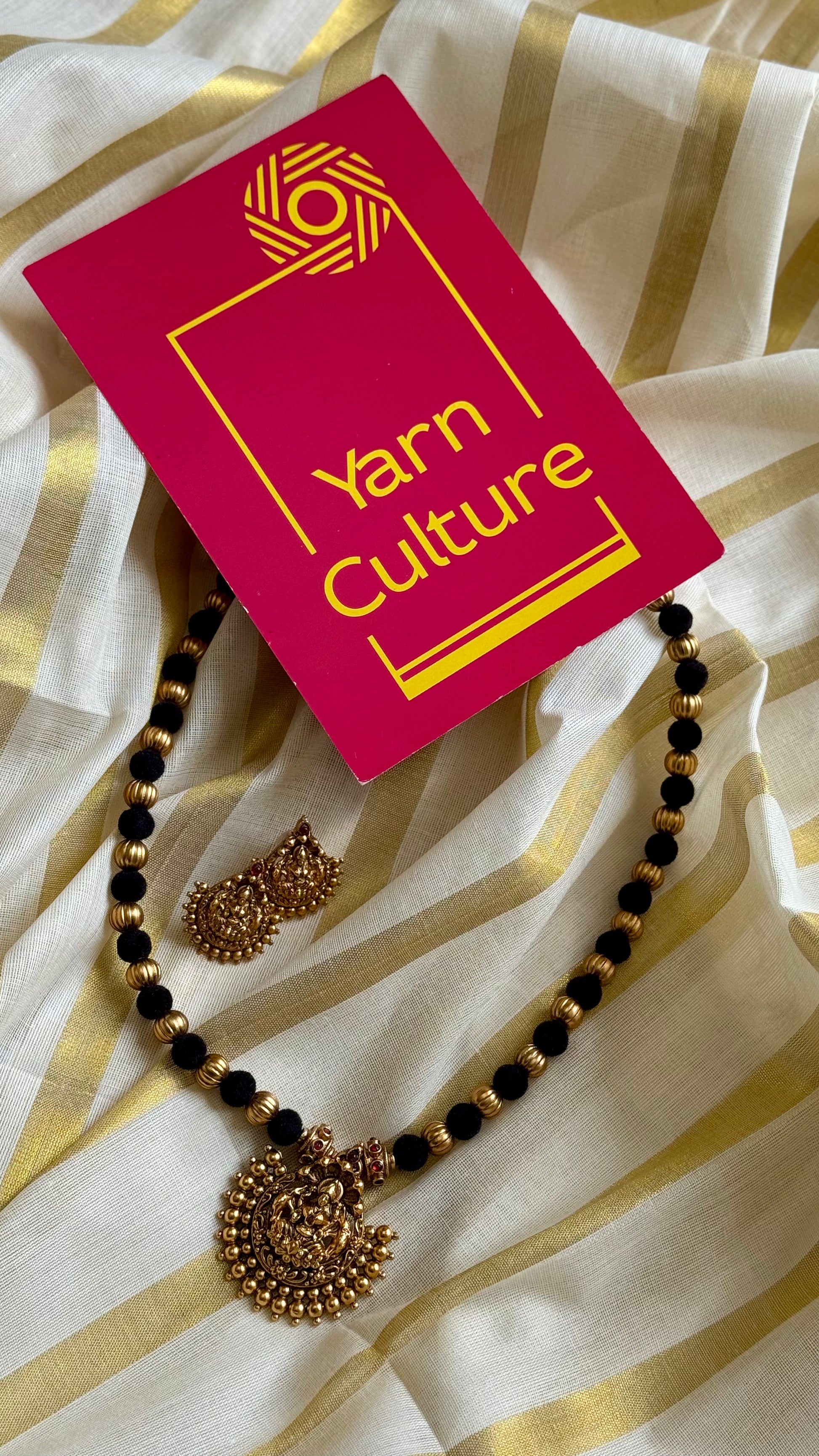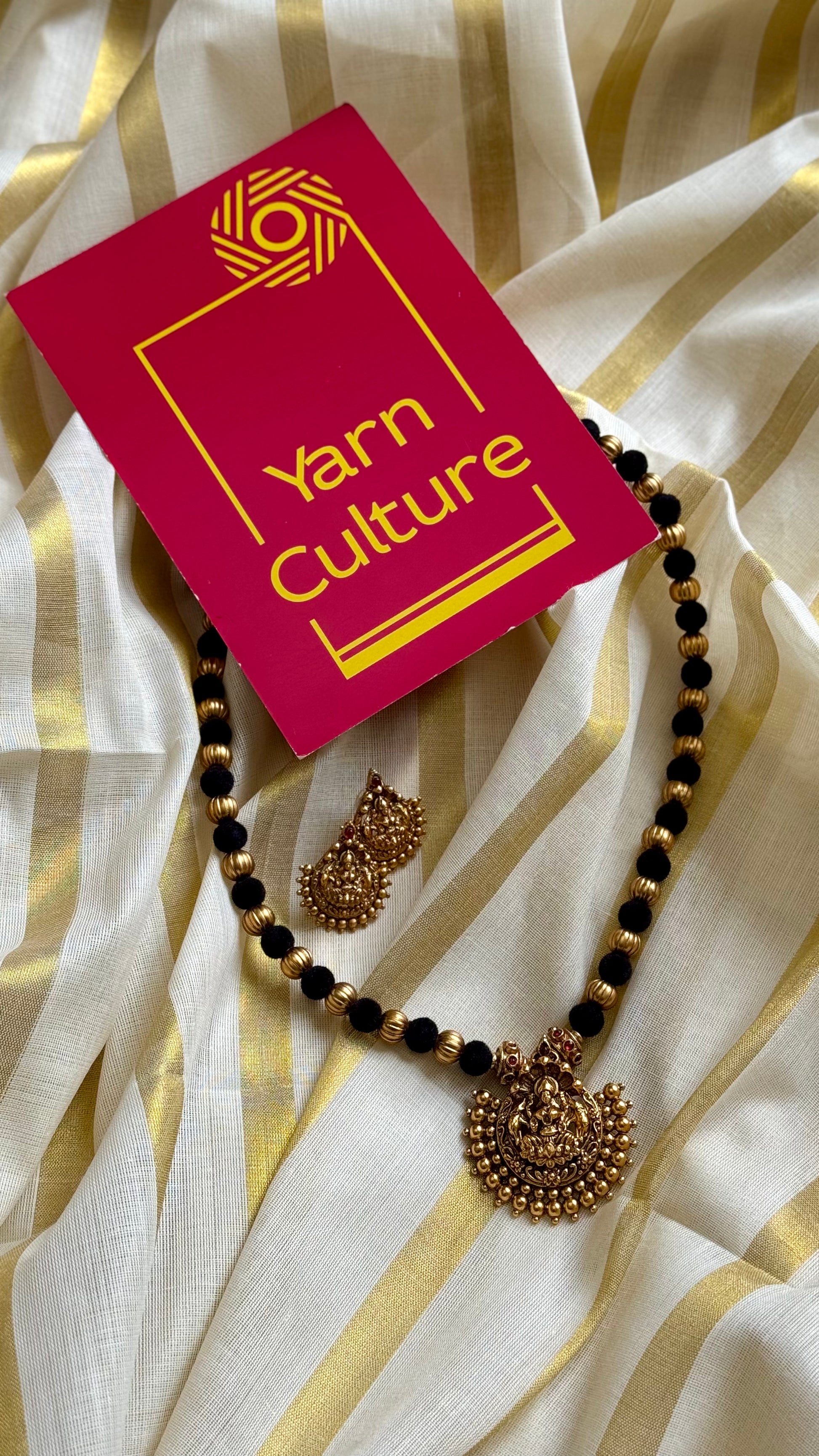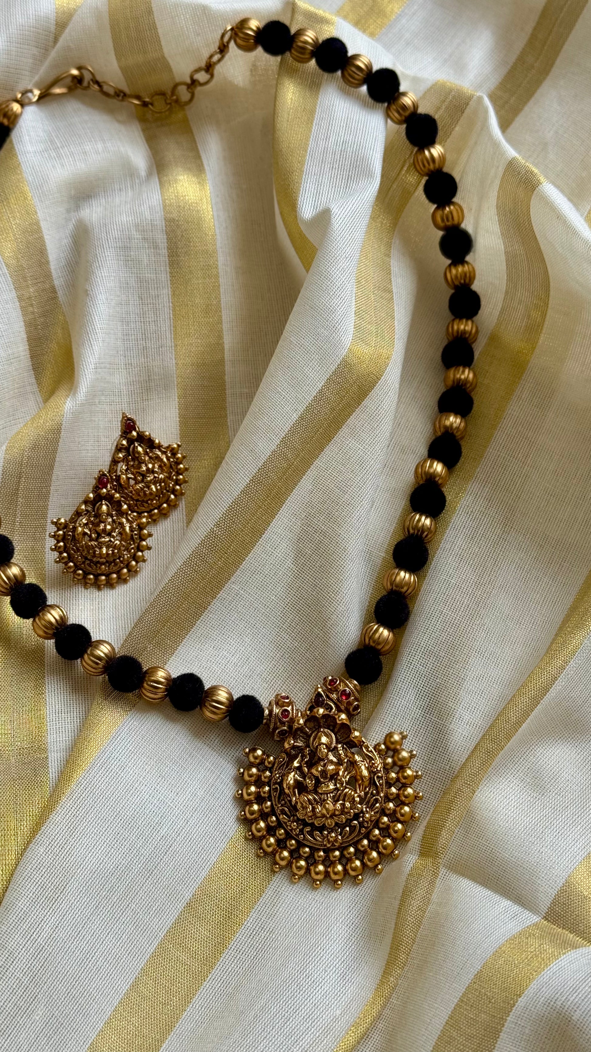 Gold beads with black and a beautiful antique temple pendant. Perfect with your Onam sarees.