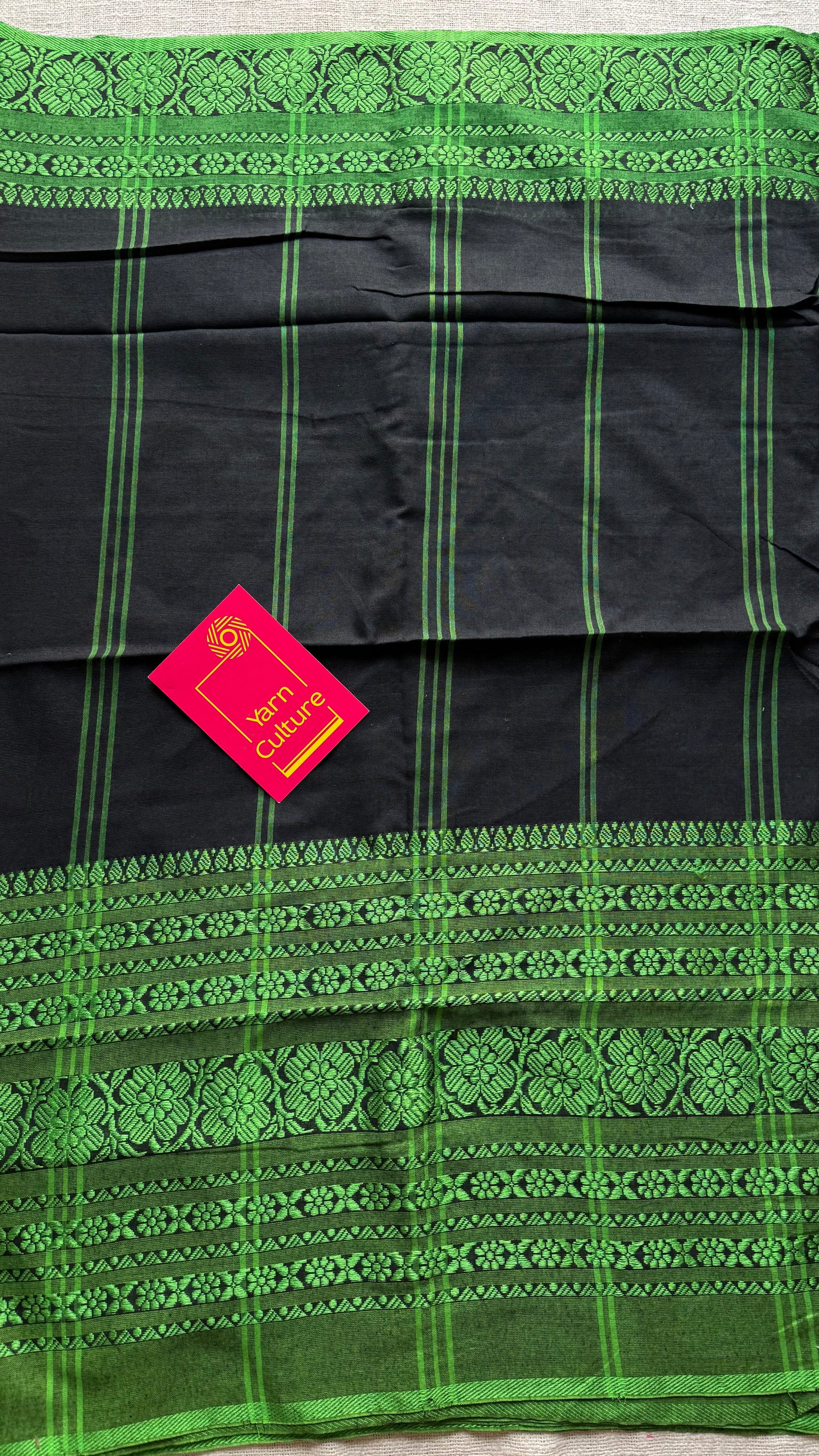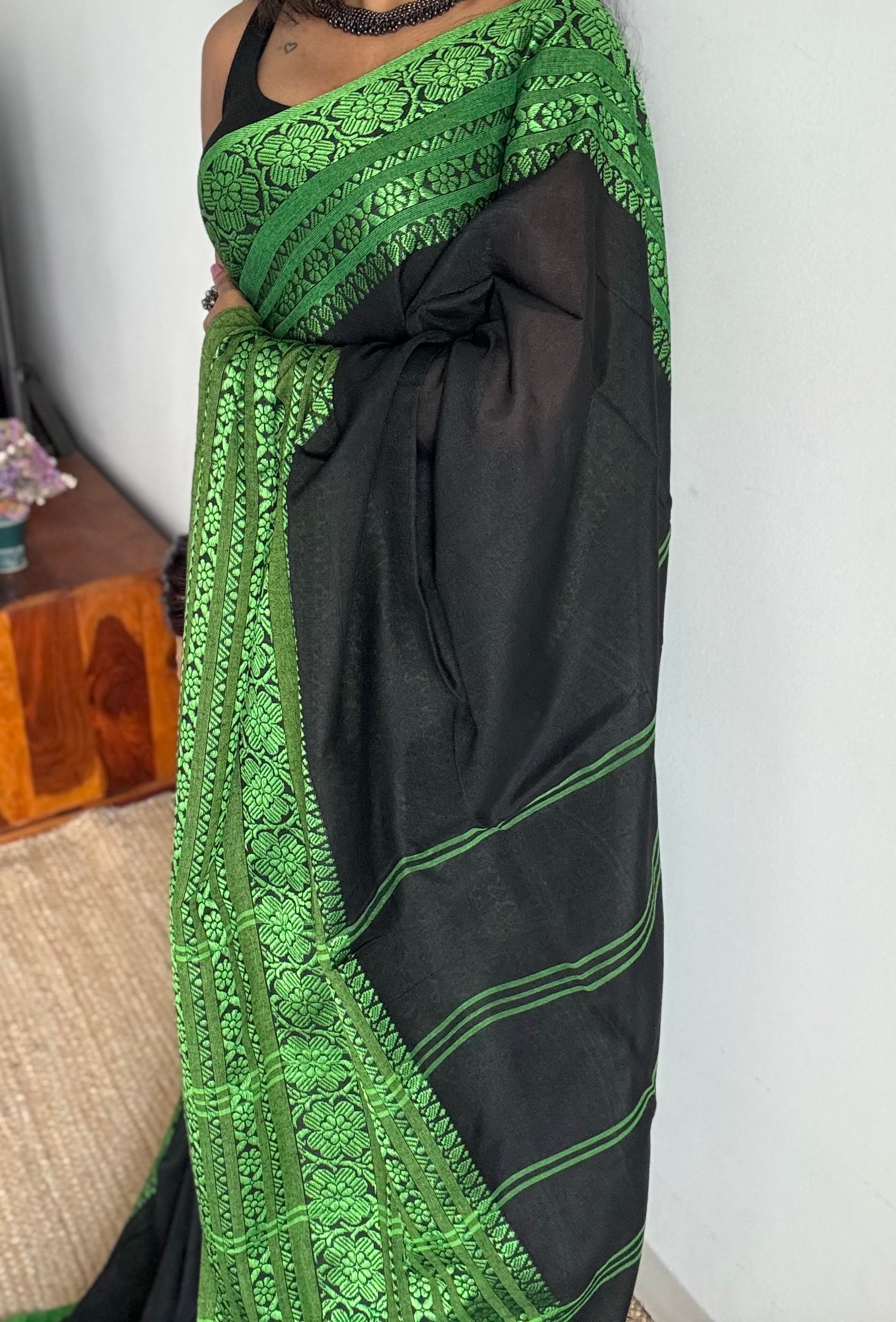 Black with green threadwork, begampuri soft cotton. Soft, easy to drape.