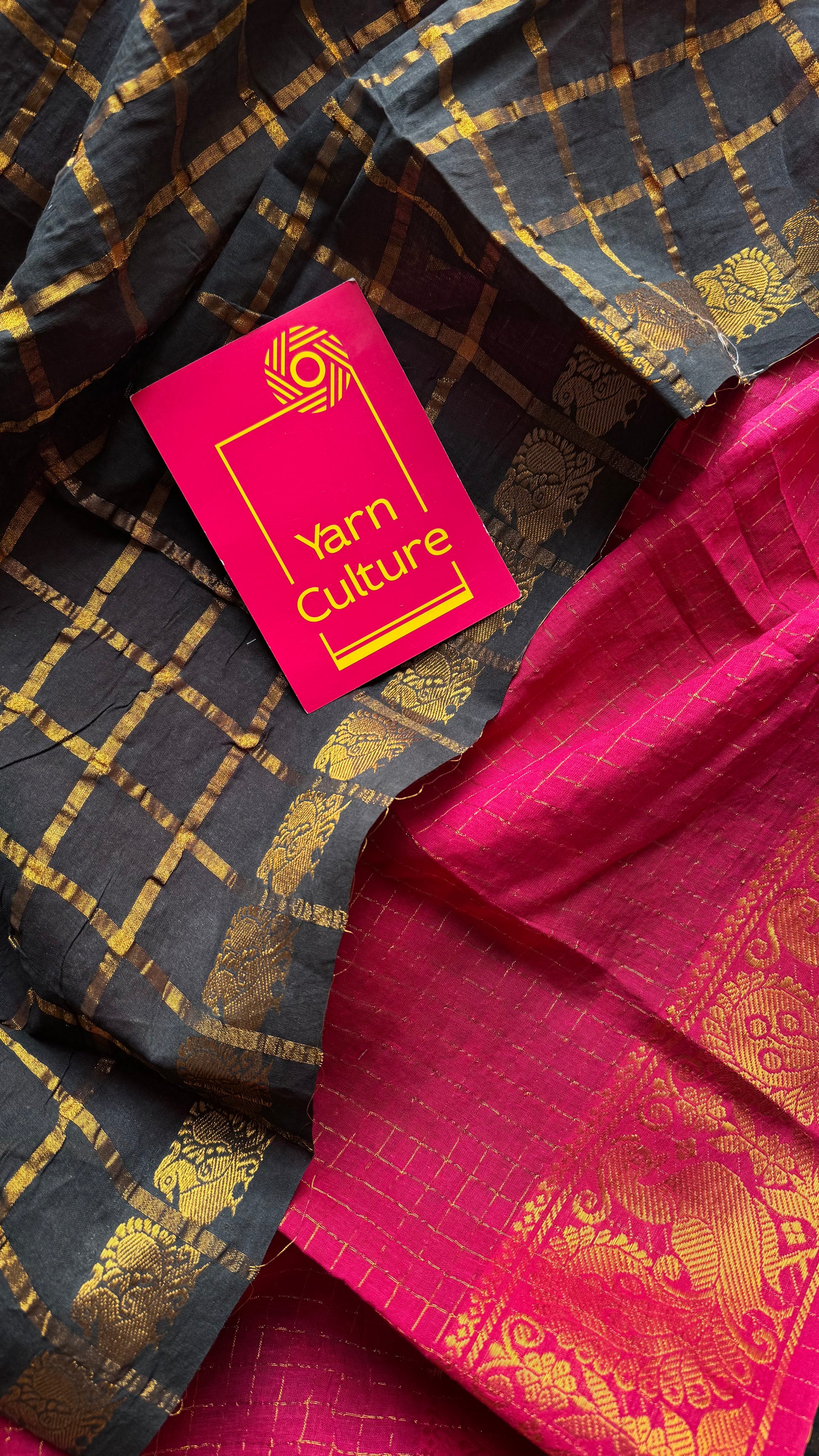 Half–half sungudi cotton saree in hot pink and black. The first half features hot pink zari kattam checks. The second half comes in black pavithra kattam. Both halves are stitched together, creating a striking contrast of colours and patterns.