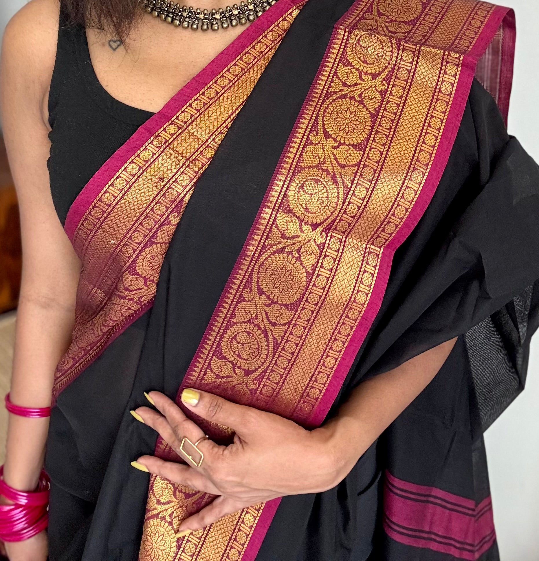 A beautiful combination of black and magenta Chettinad cotton saree finished with a pretty gold zari border. Lightweight, breathable, and easy to drape, it is perfect for summer wear, everyday elegance, and comfortable all-day use. No blouse.