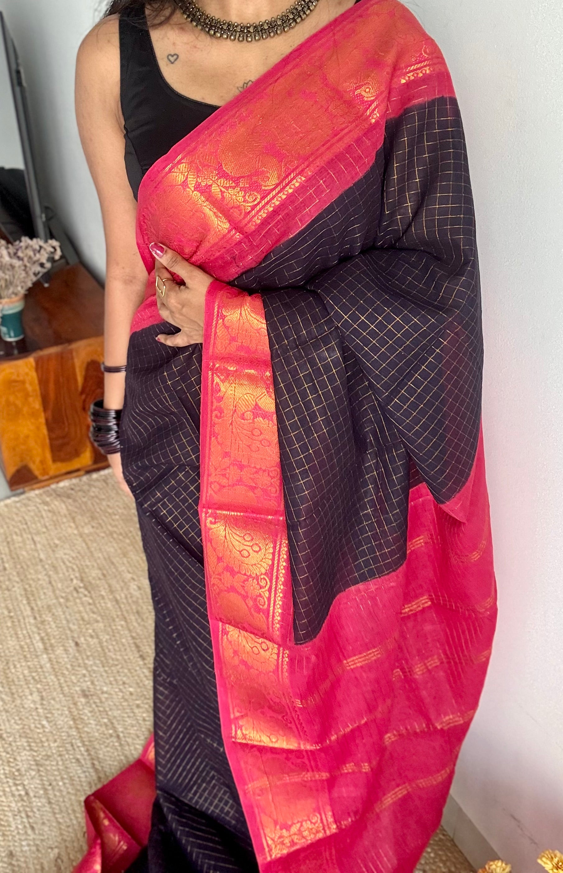 Black with pinkish red checkered sungudi, kattuchayam dyed, soft madurai cotton, no blouse.
