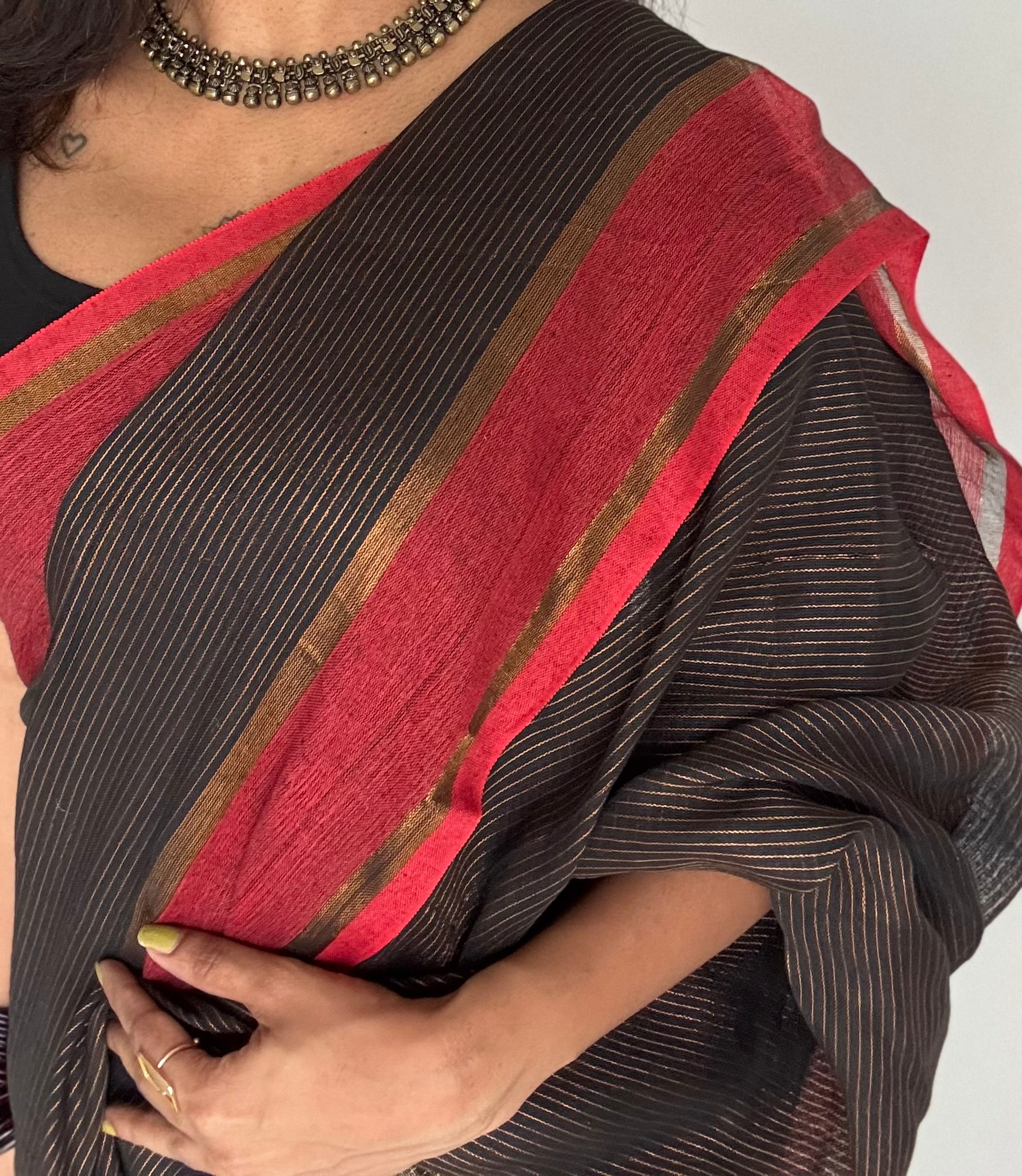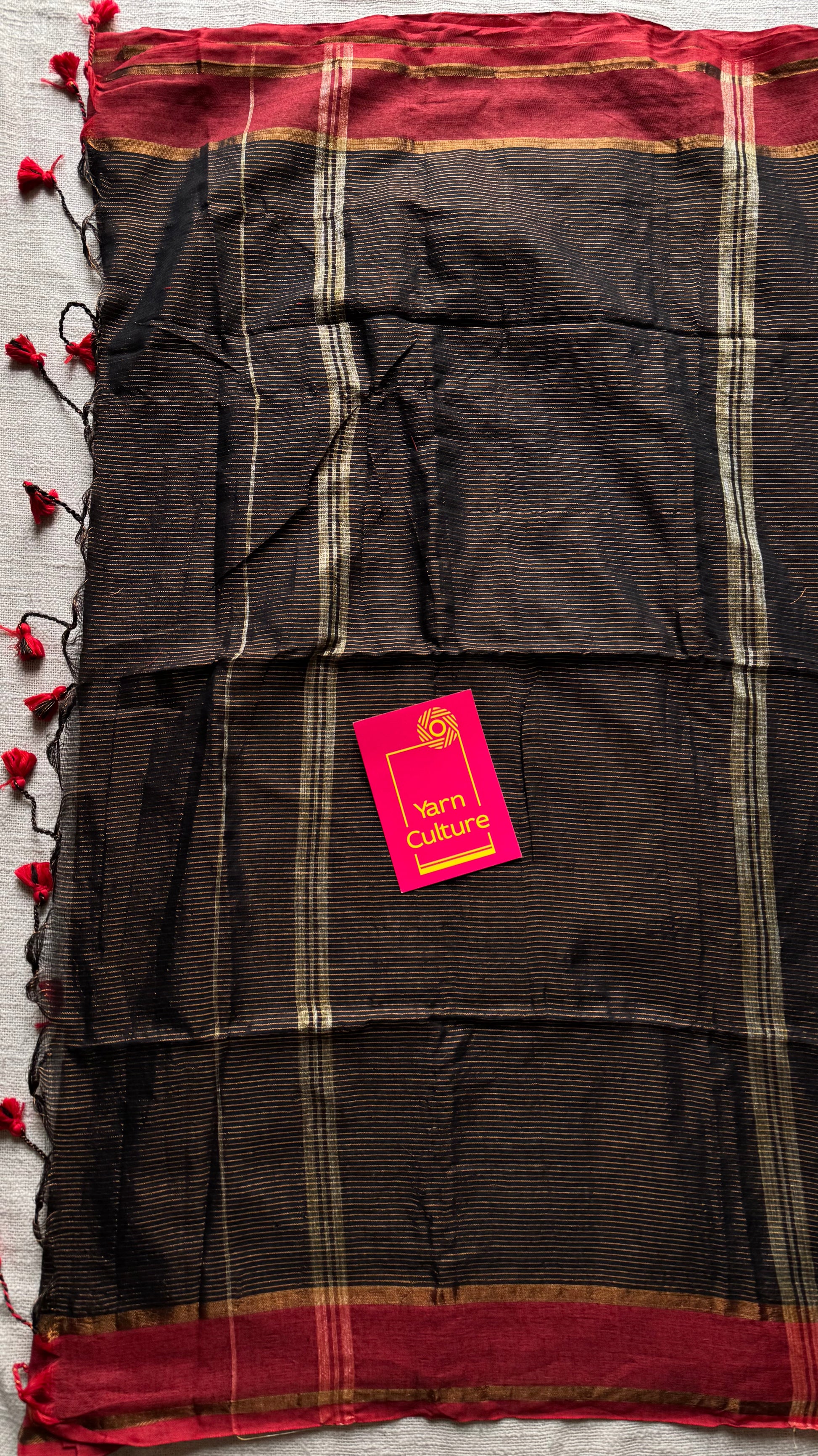 Black with red gap border, gold zari stripes, soft cotton - YCBCKCZDE133