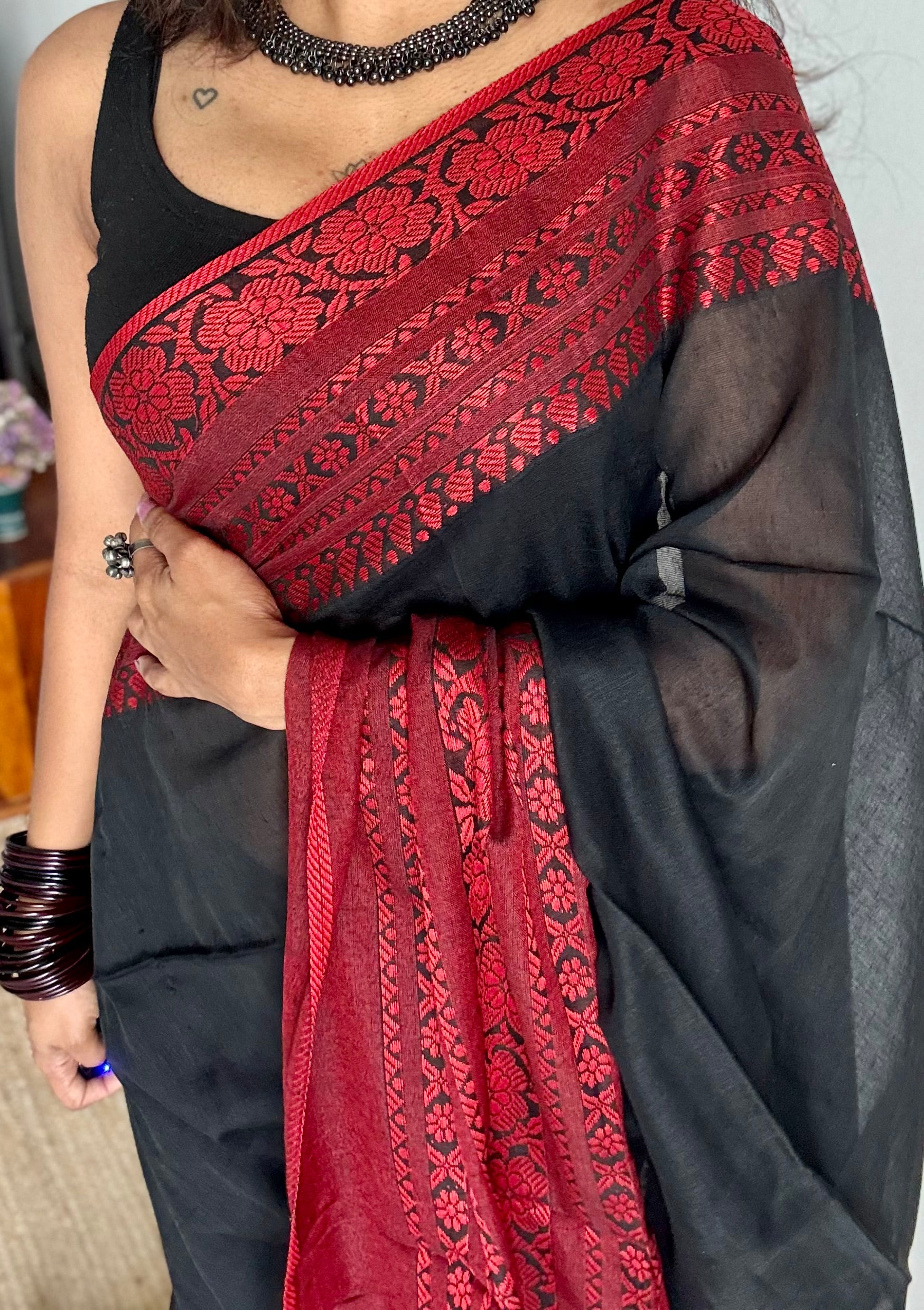 Black with red threadwork, begampuri soft cotton. Soft, easy to drape.