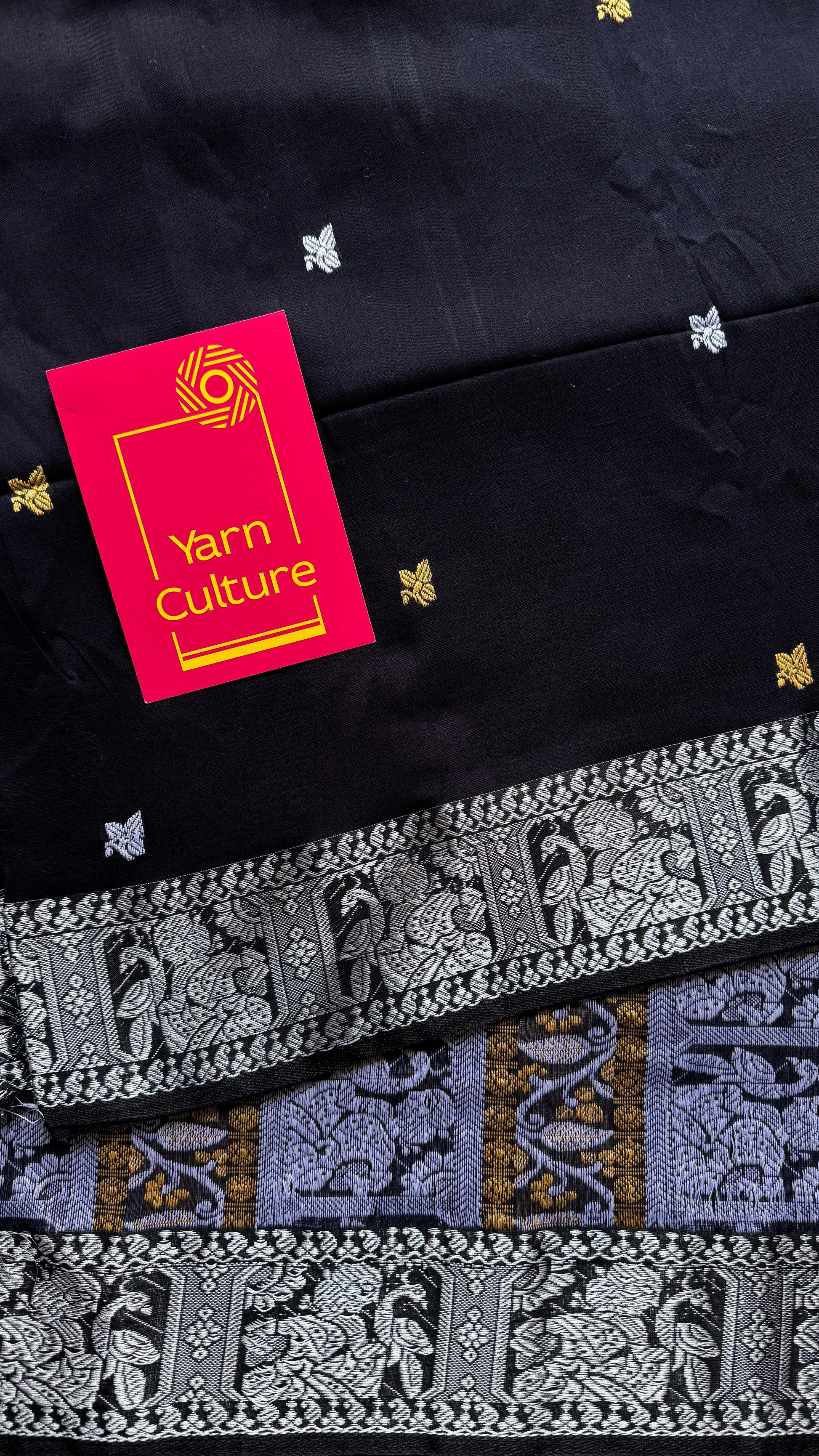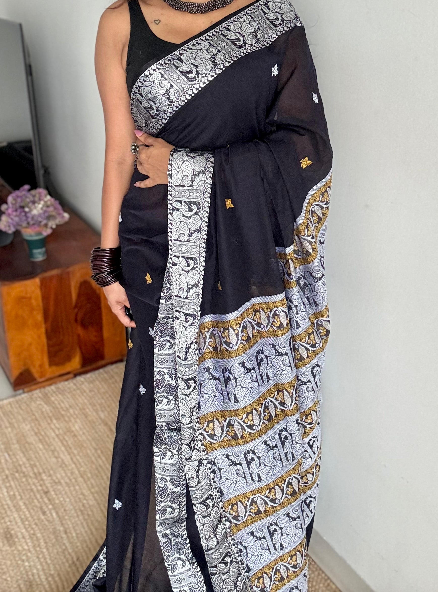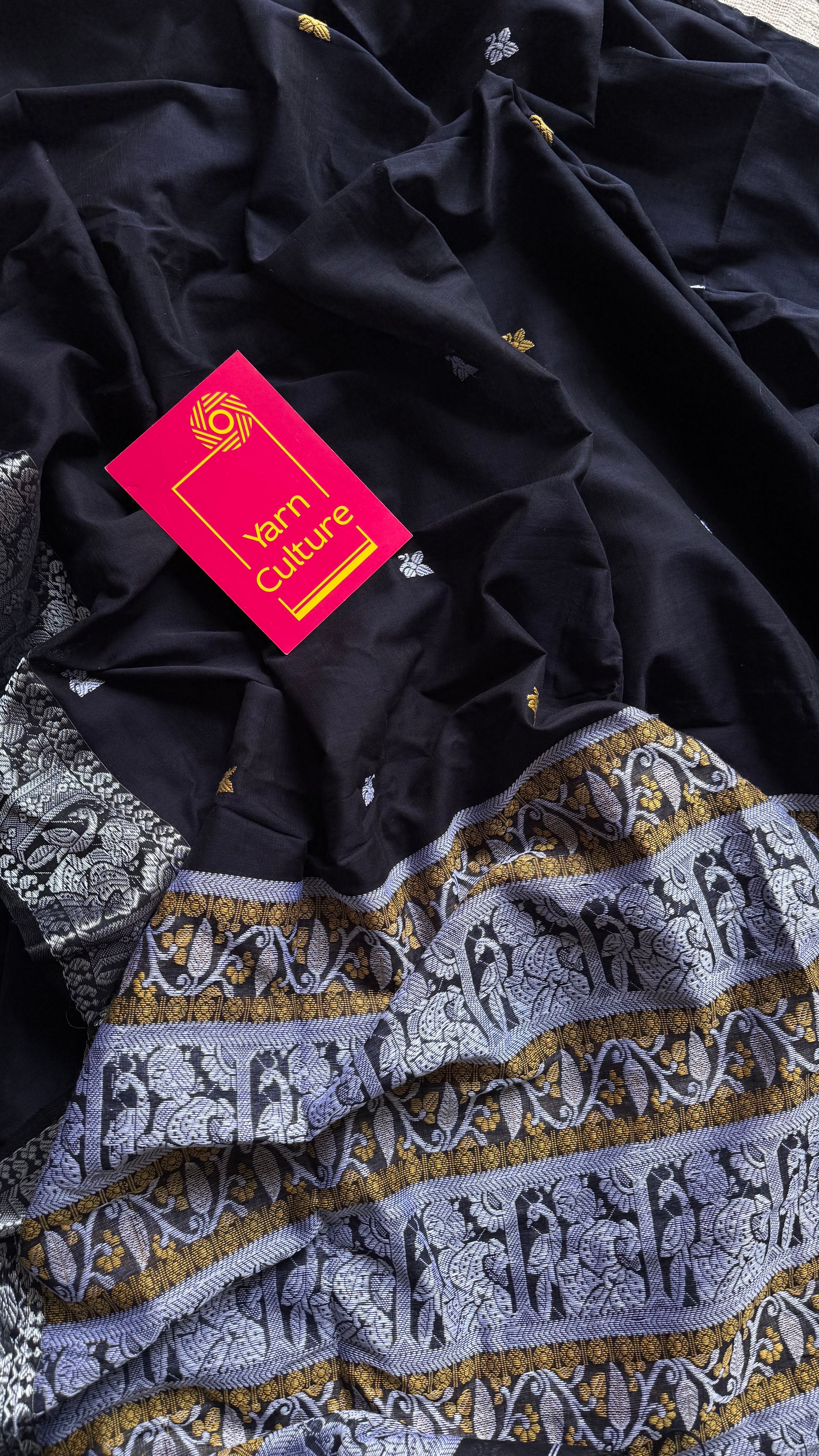 Black Baluchari-inspired cotton saree with white and yellow threadwork and classic motifs. Handwoven treasure from the village of Baluchar. The term ‘inspired’ is used because Baluchari is a GI-tagged name, reserved for silk.