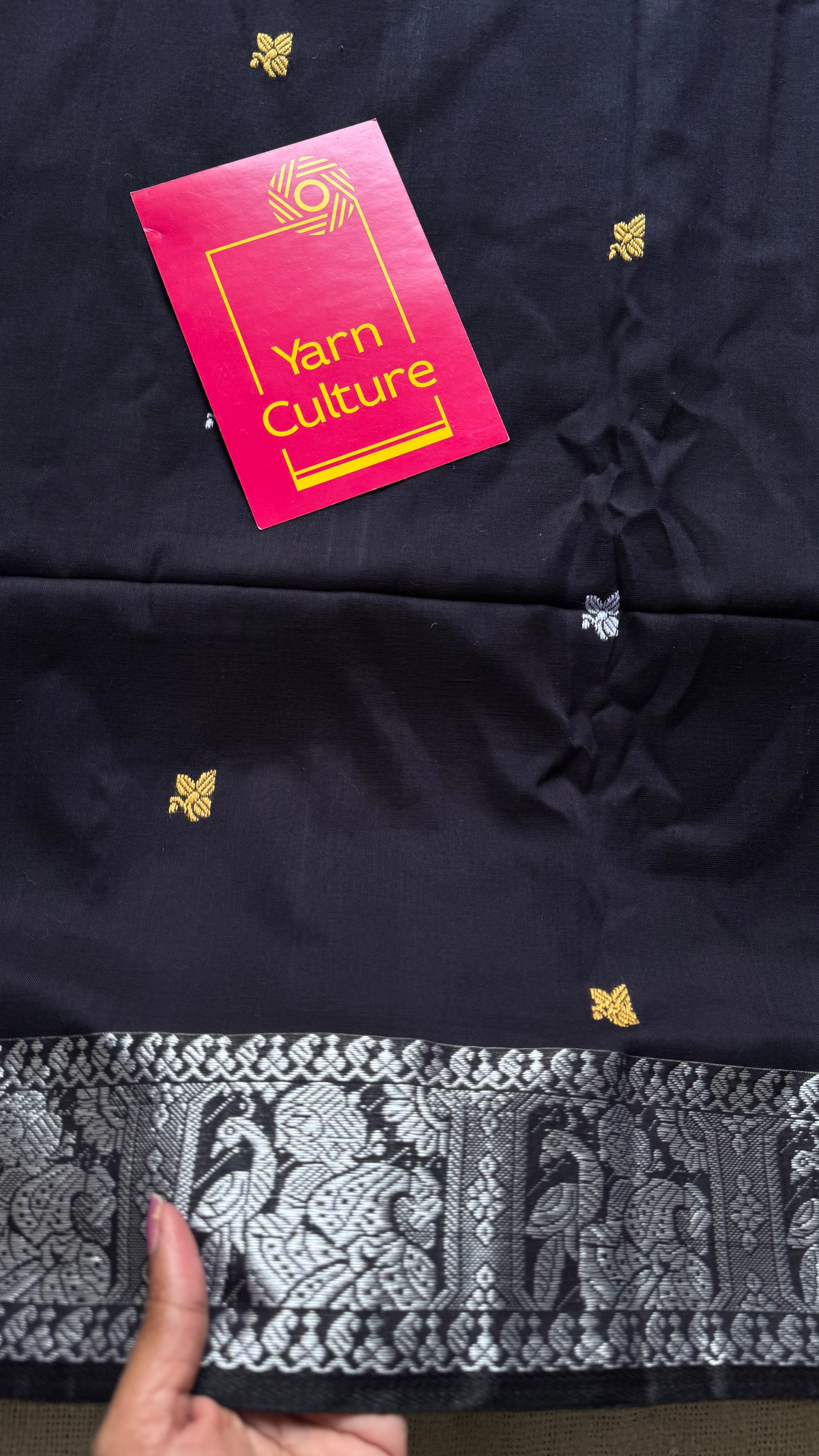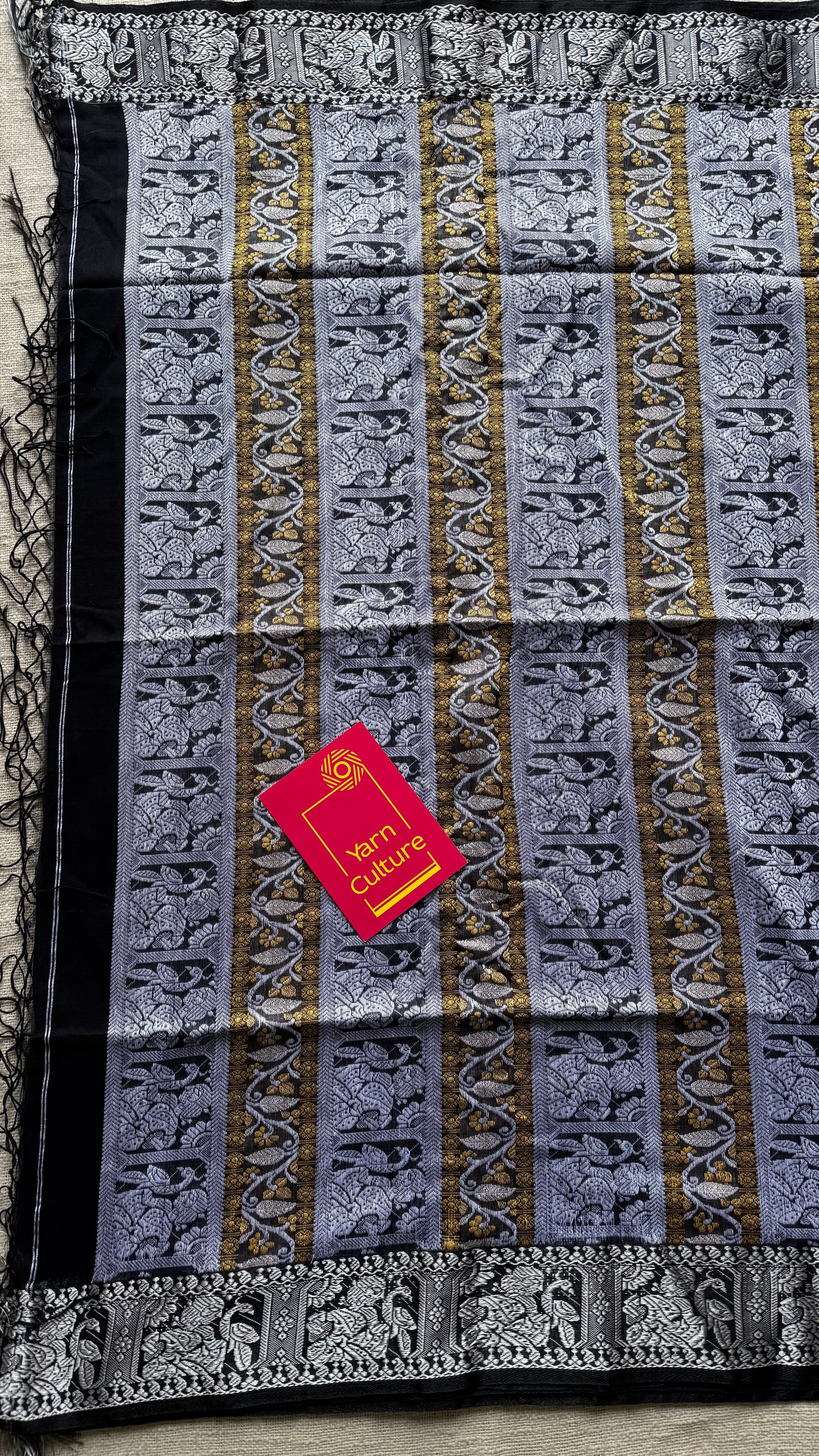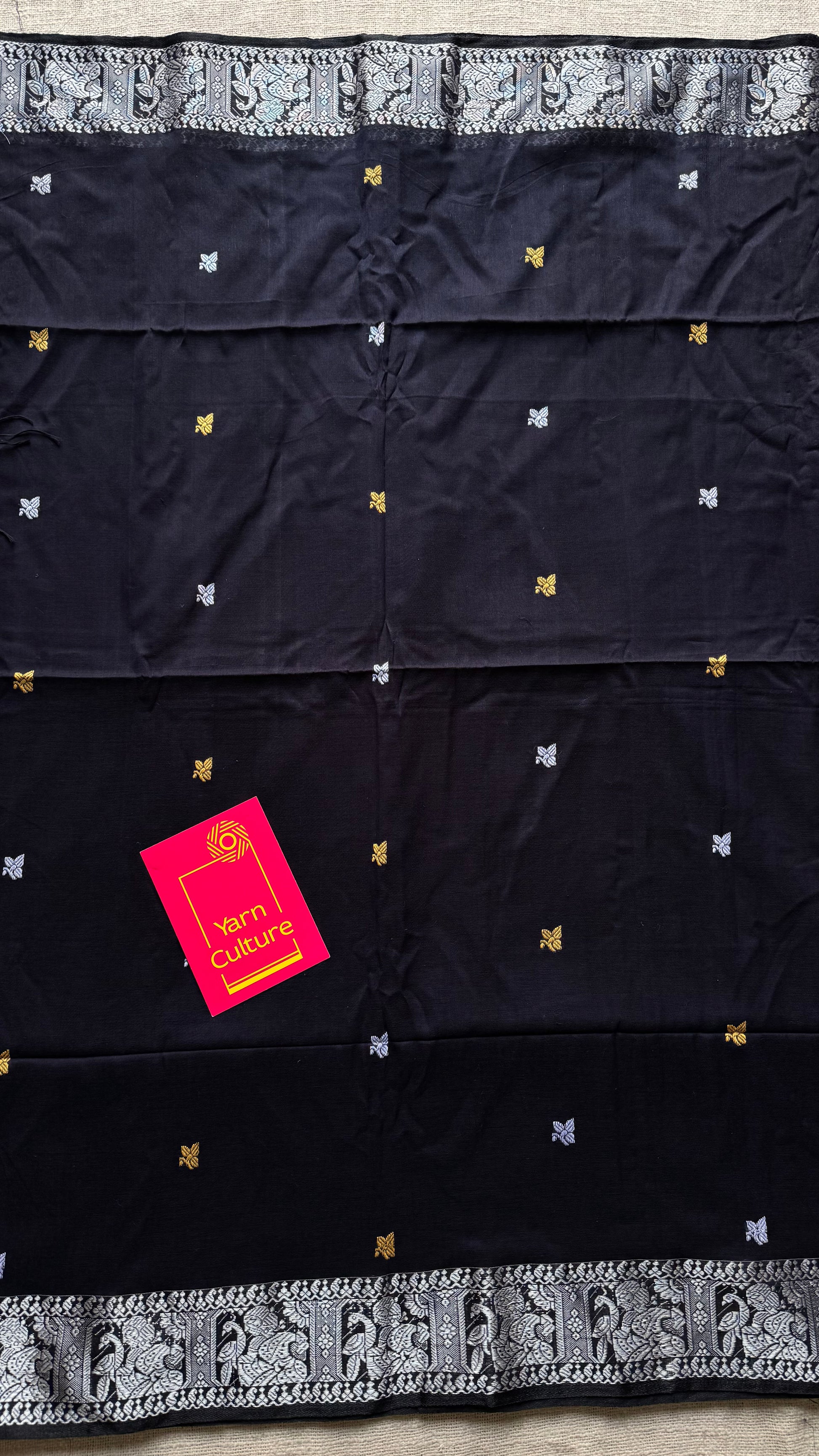 Black Baluchari-inspired cotton saree with white and yellow threadwork and classic motifs. Handwoven treasure from the village of Baluchar. The term ‘inspired’ is used because Baluchari is a GI-tagged name, reserved for silk.