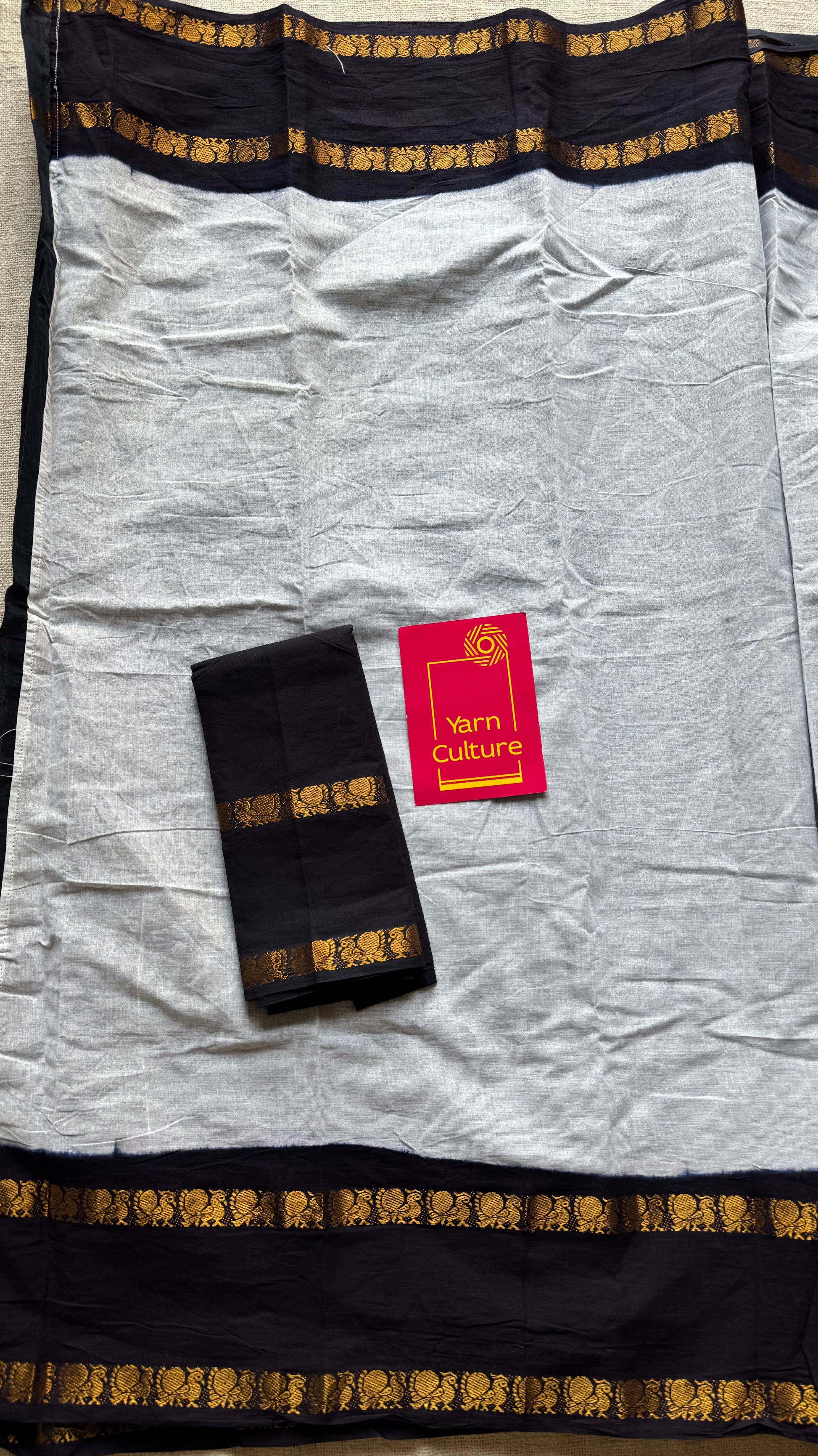Half–half sungudi cotton saree in black and white. The first half features black with a peacock border. The second half comes in white with a black peacock border. Both halves are stitched together, creating a striking contrast of light and dark.