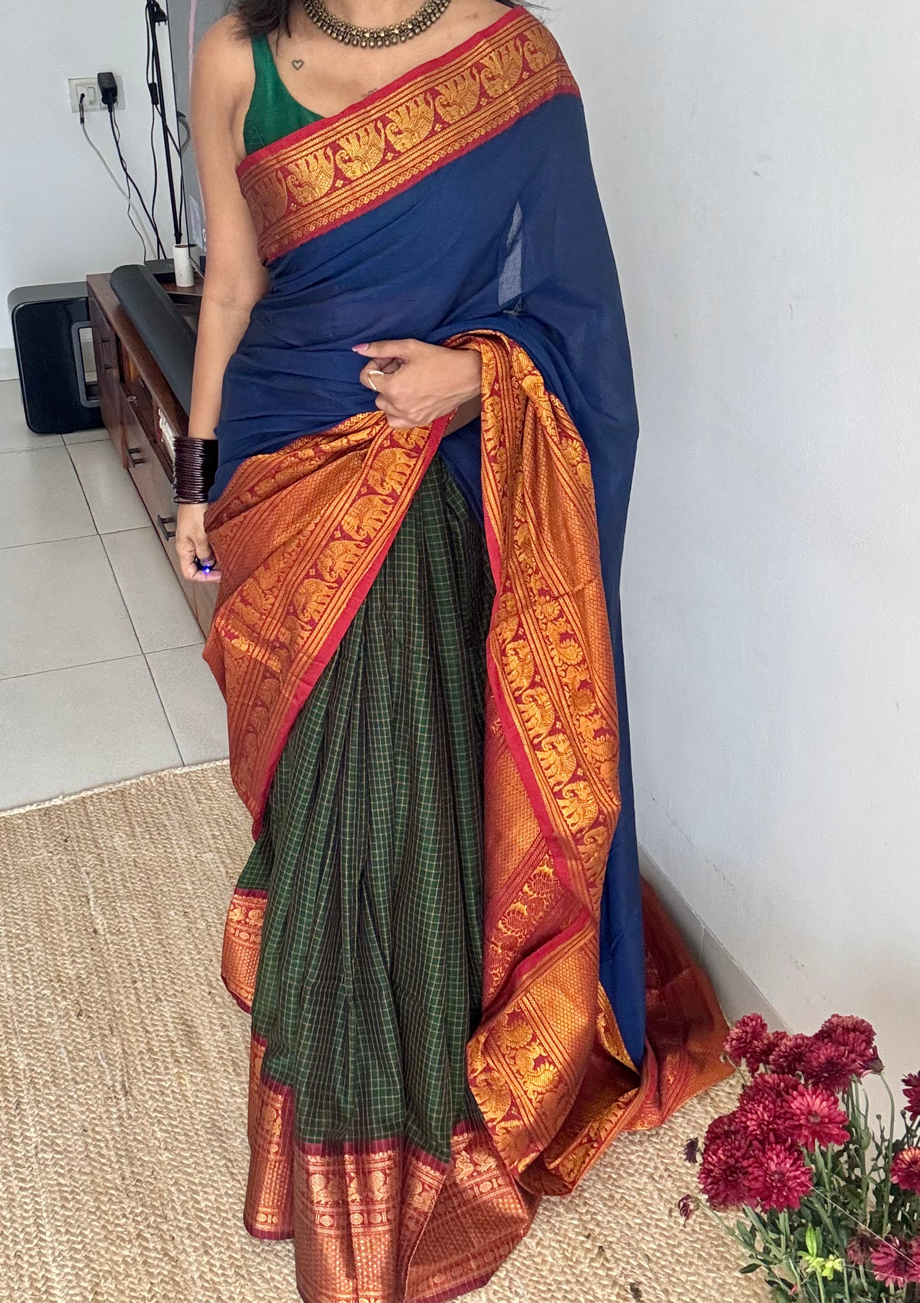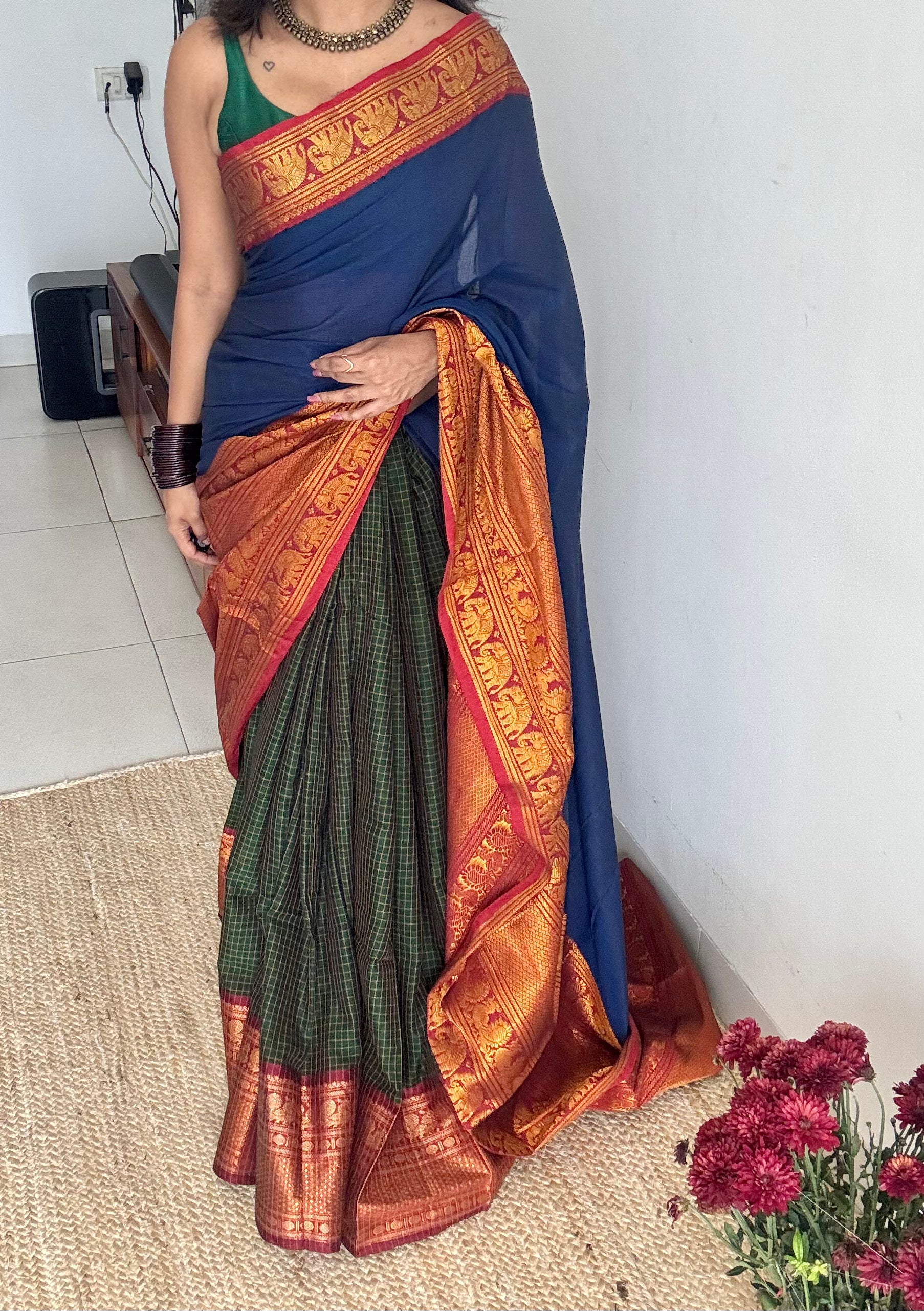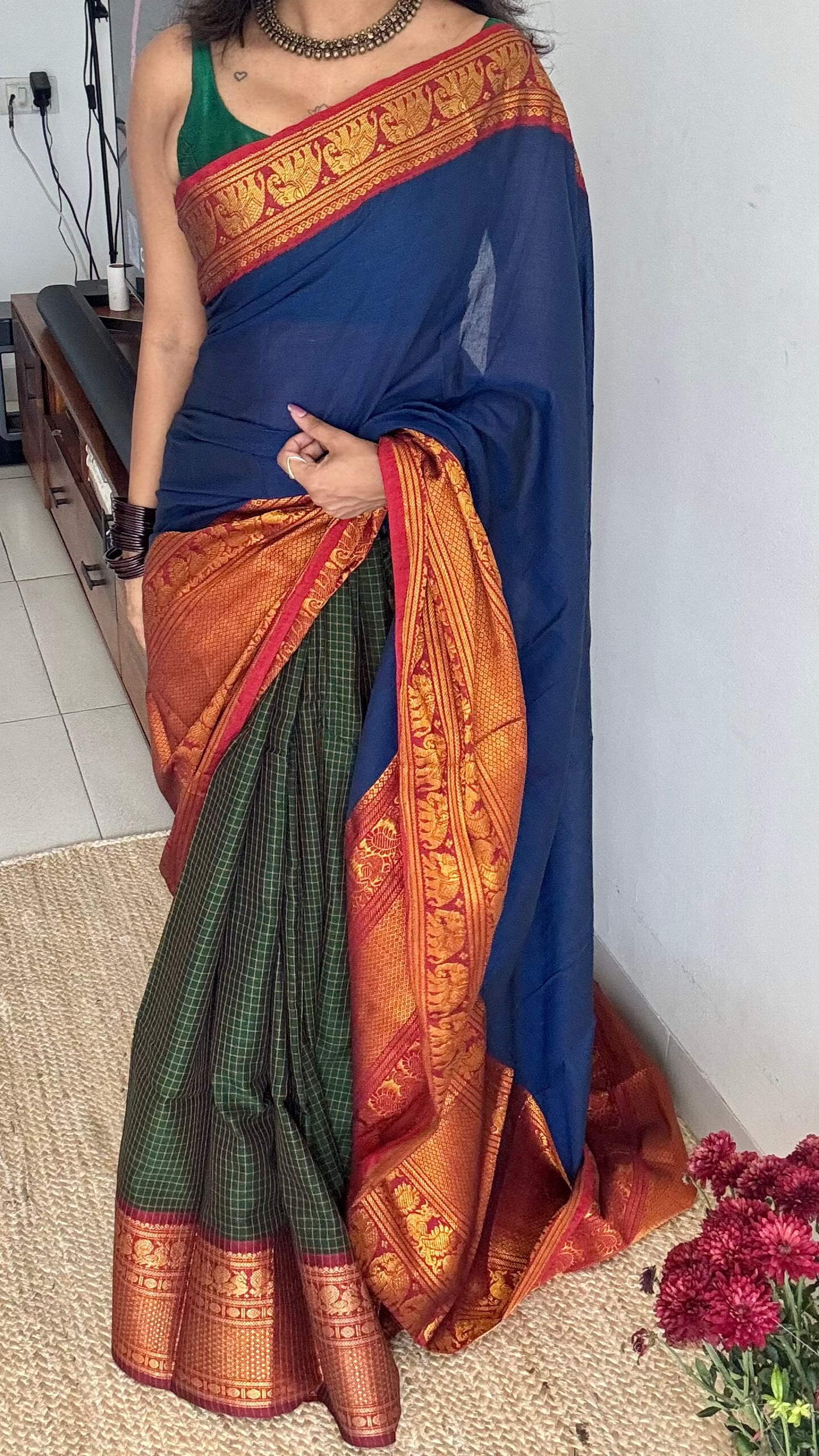 Blue - Green Checks half saree (dhavani), unstitched material, soft cotton - YCAHSN21