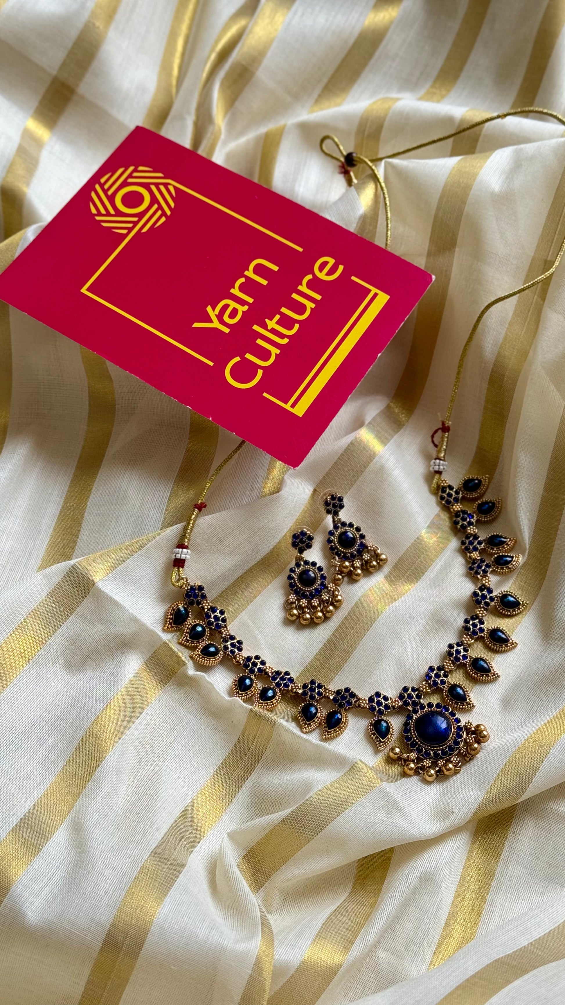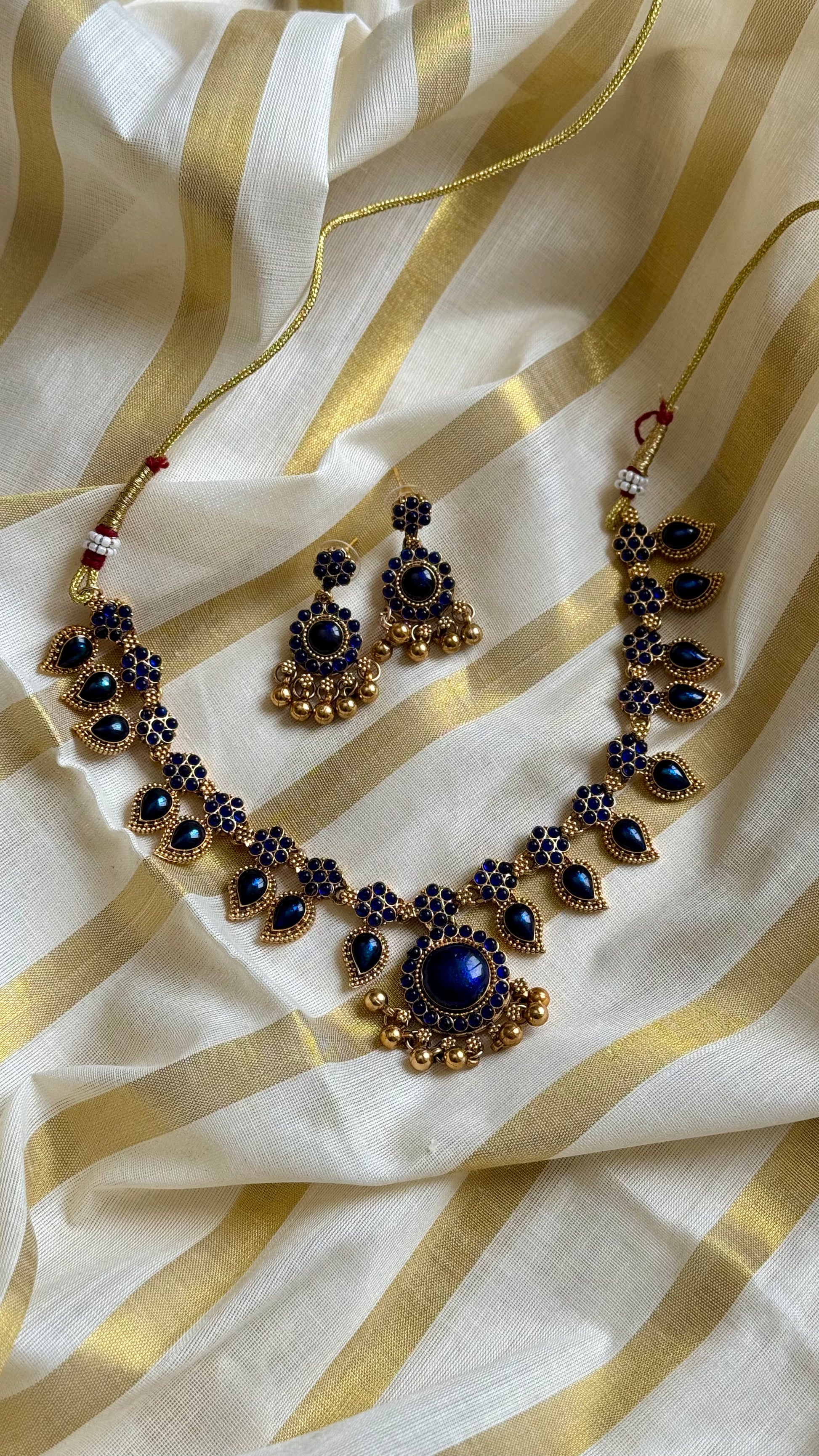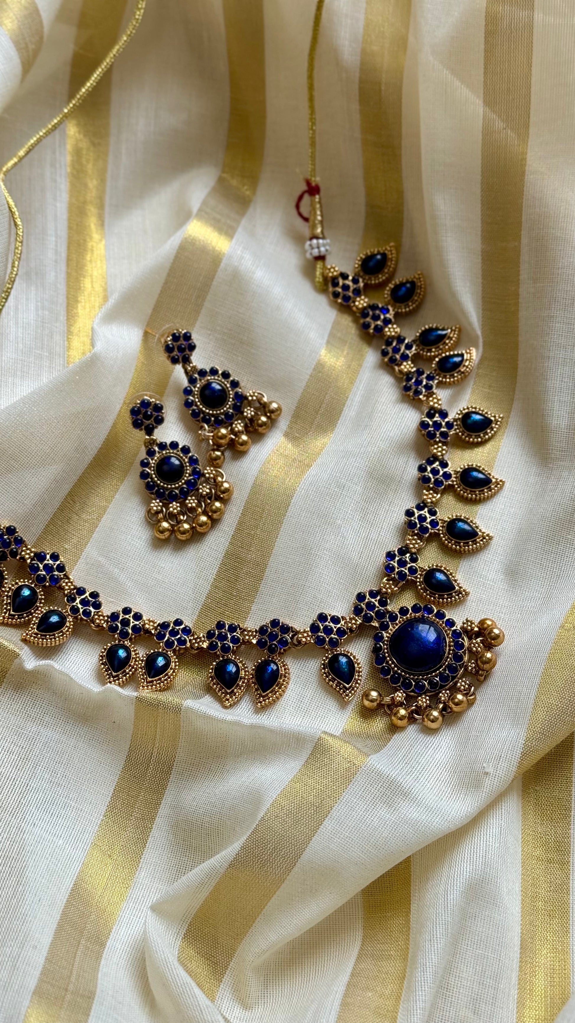 A beautiful temple jewellery inspired design in antique gold, adorned with deep blue stones. Perfect with all your ethnic attire.