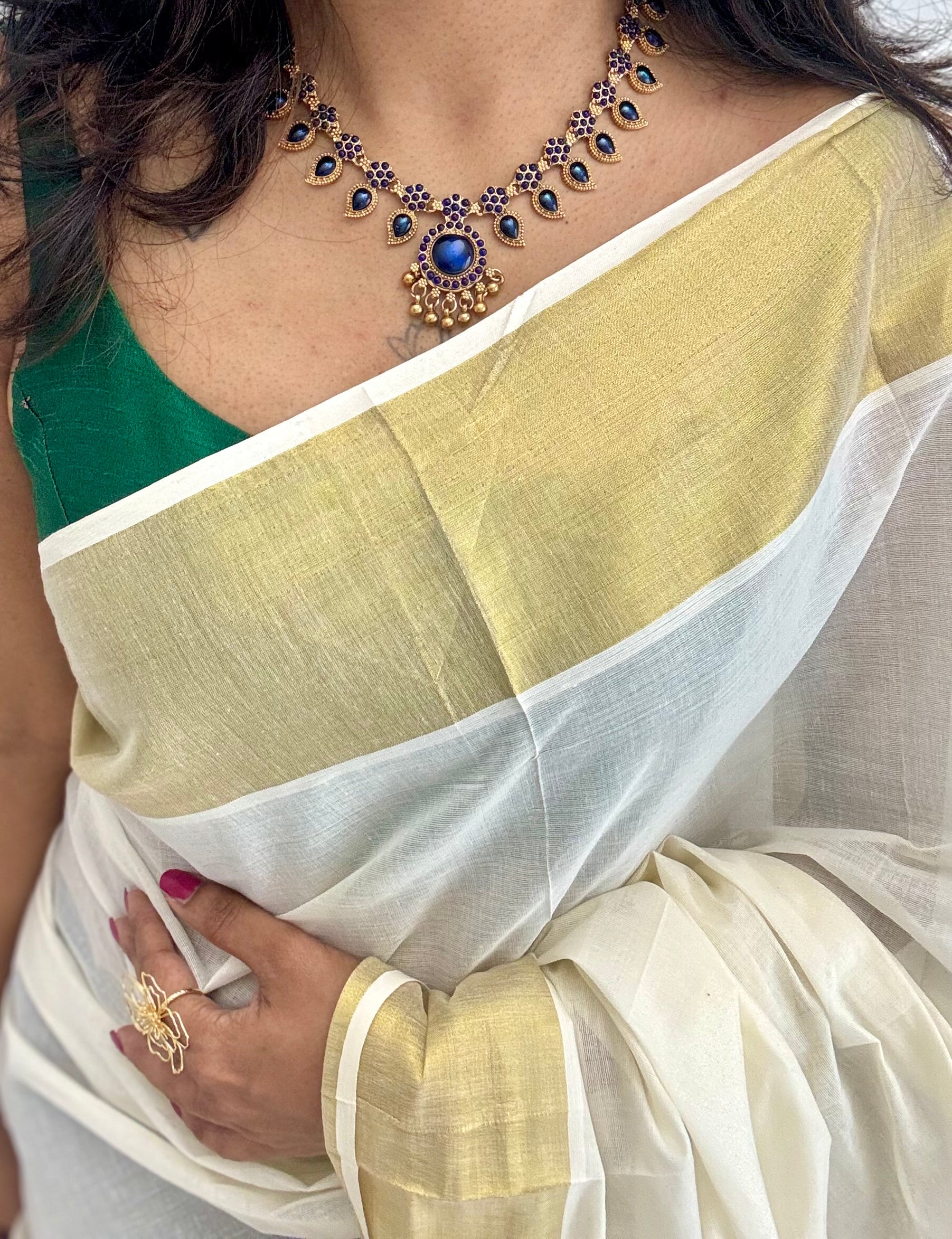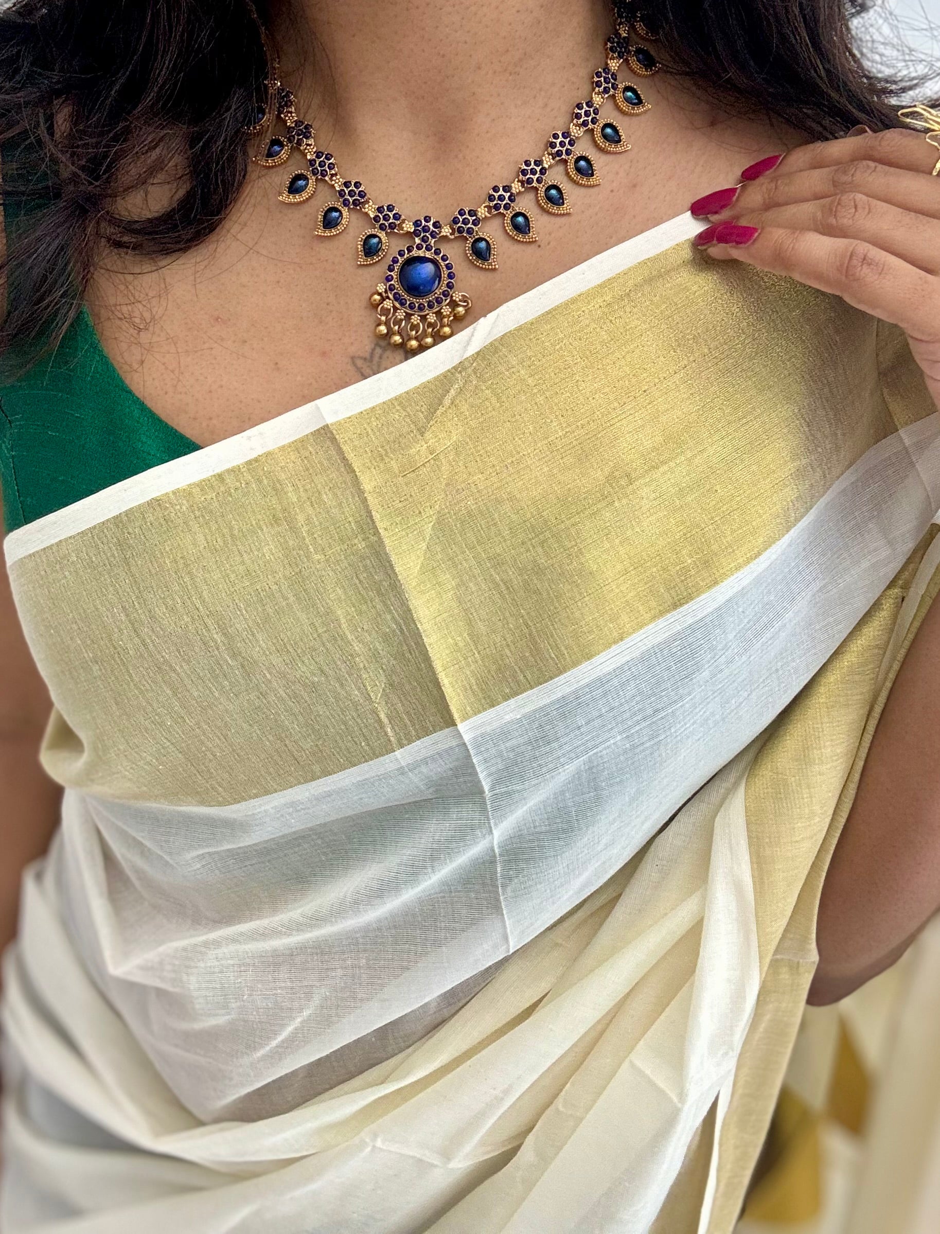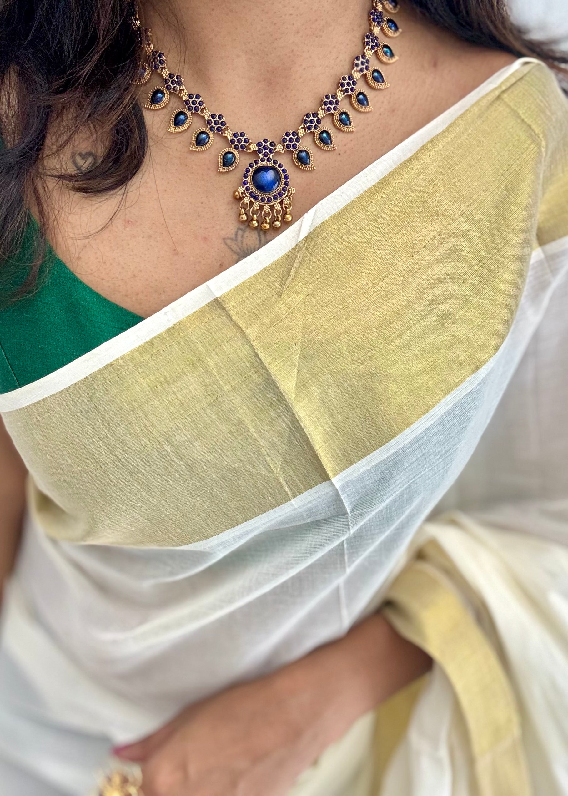 A beautiful temple jewellery inspired design in antique gold, adorned with deep blue stones. Perfect with all your ethnic attire.