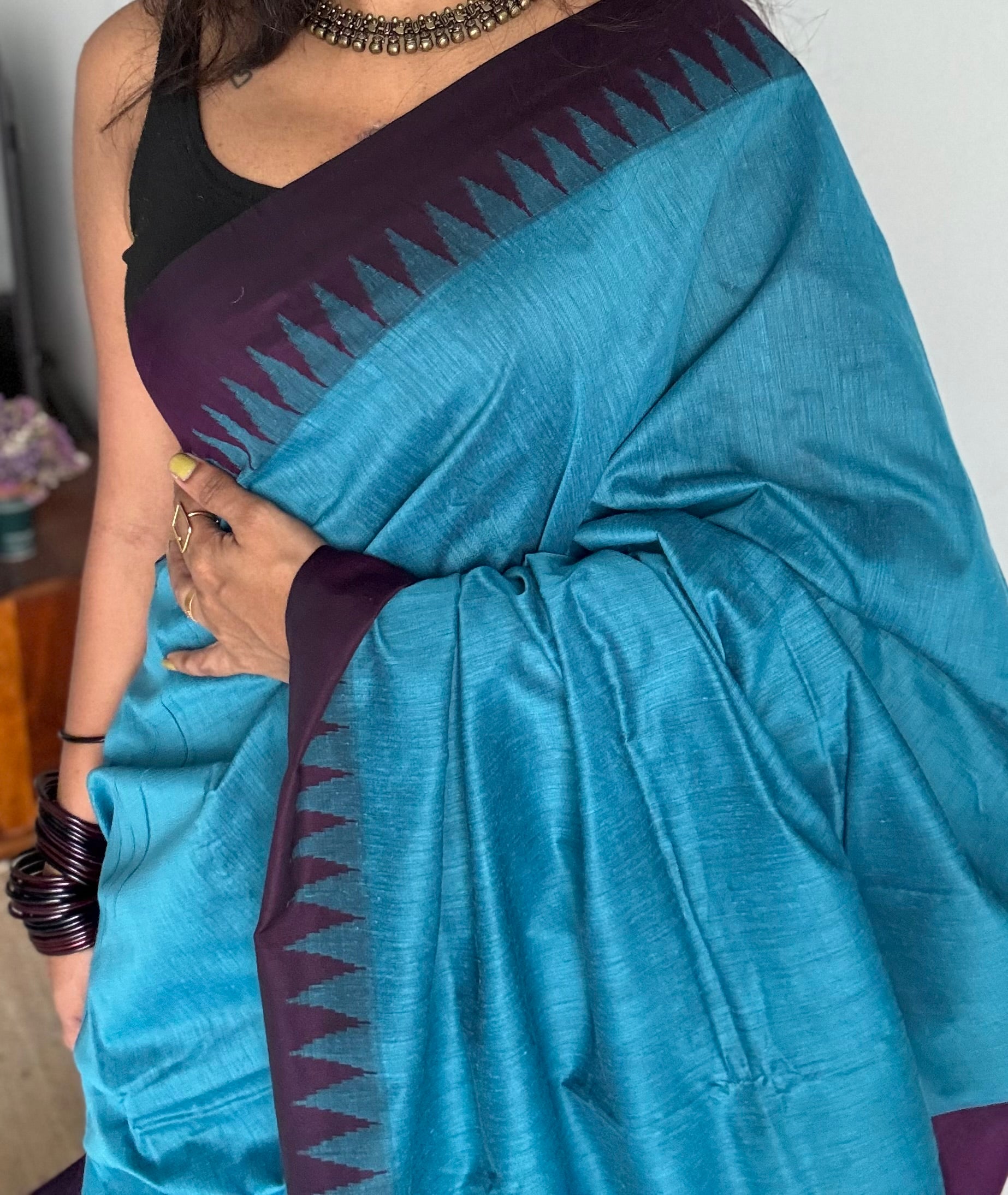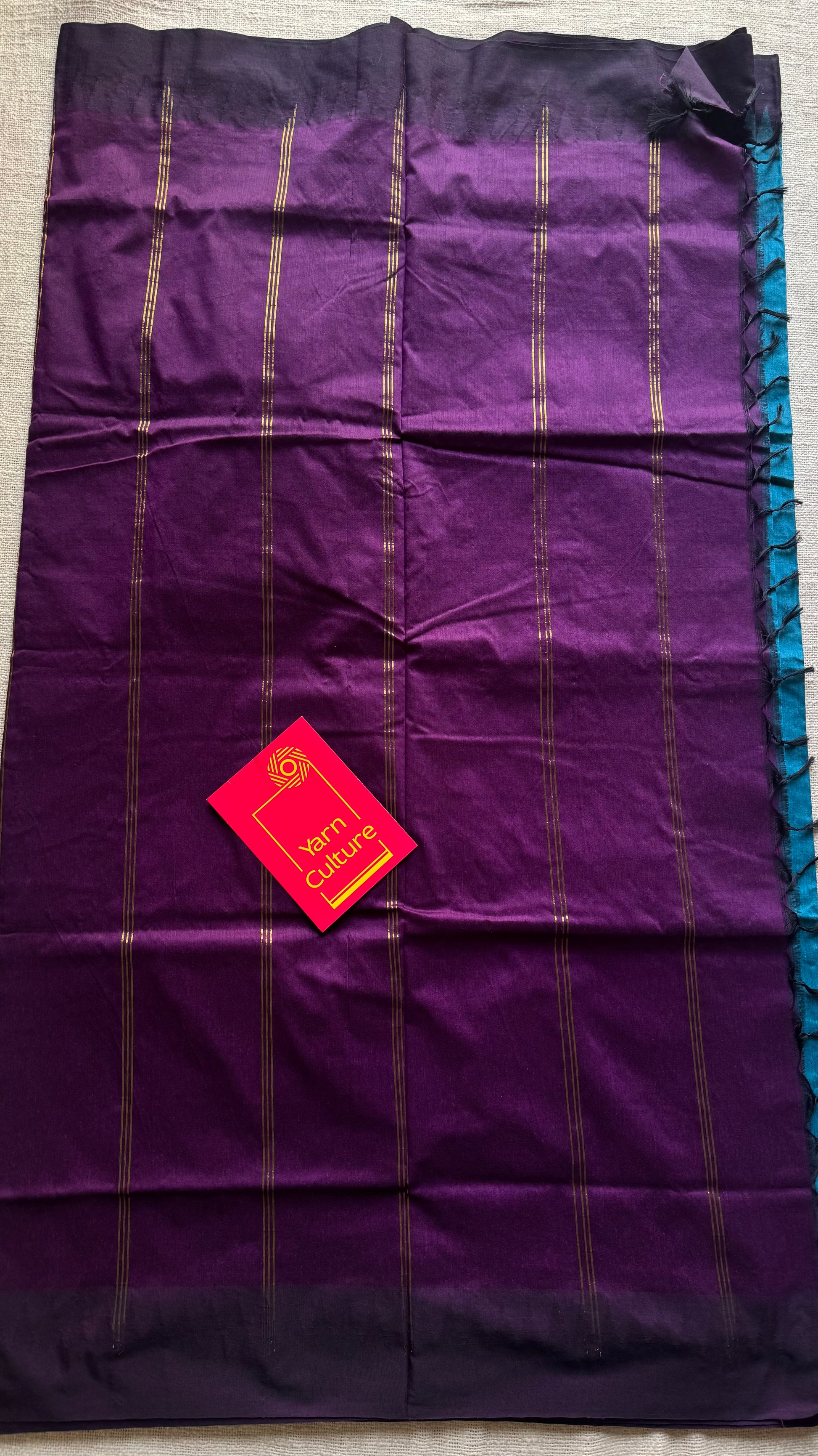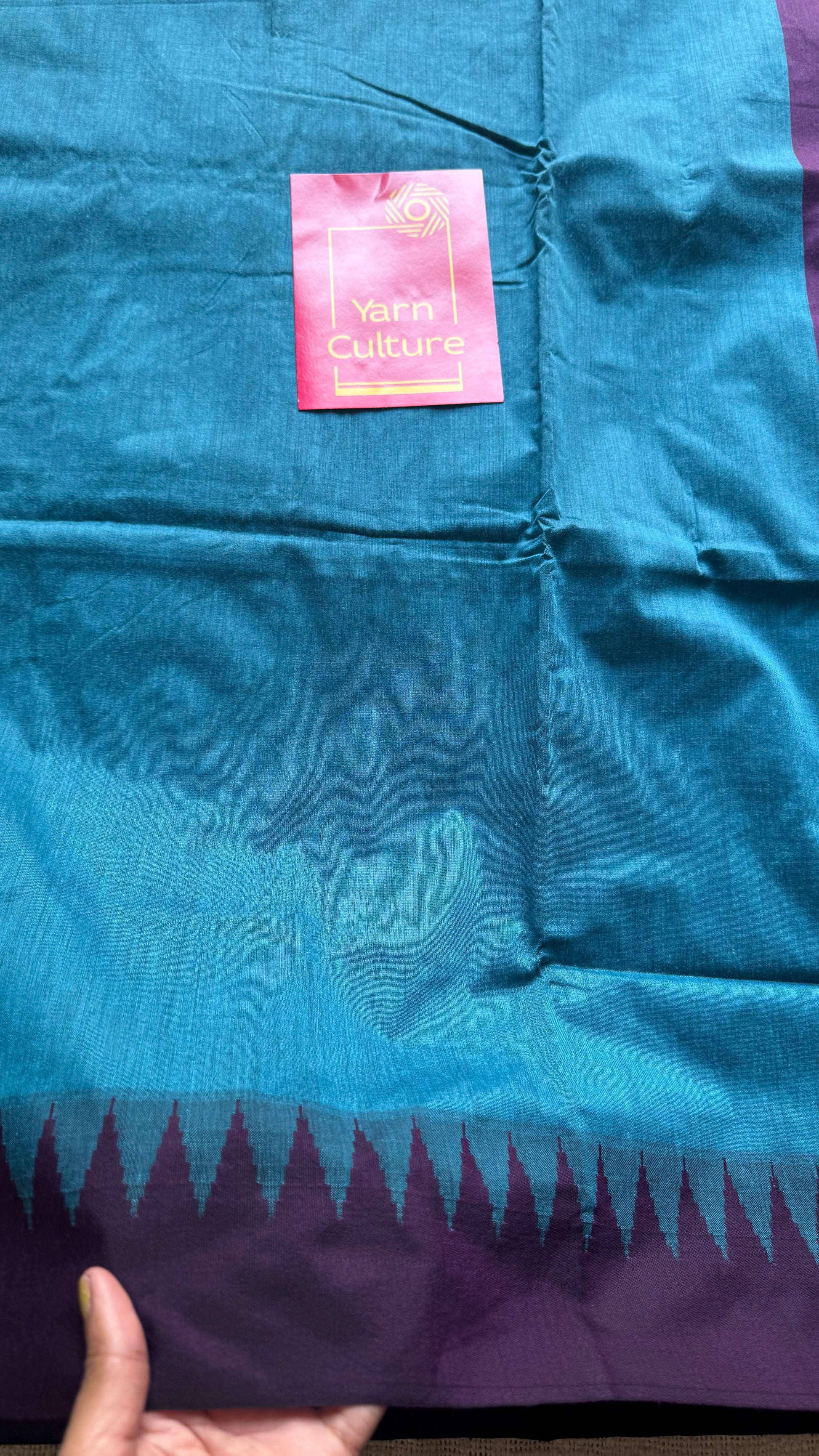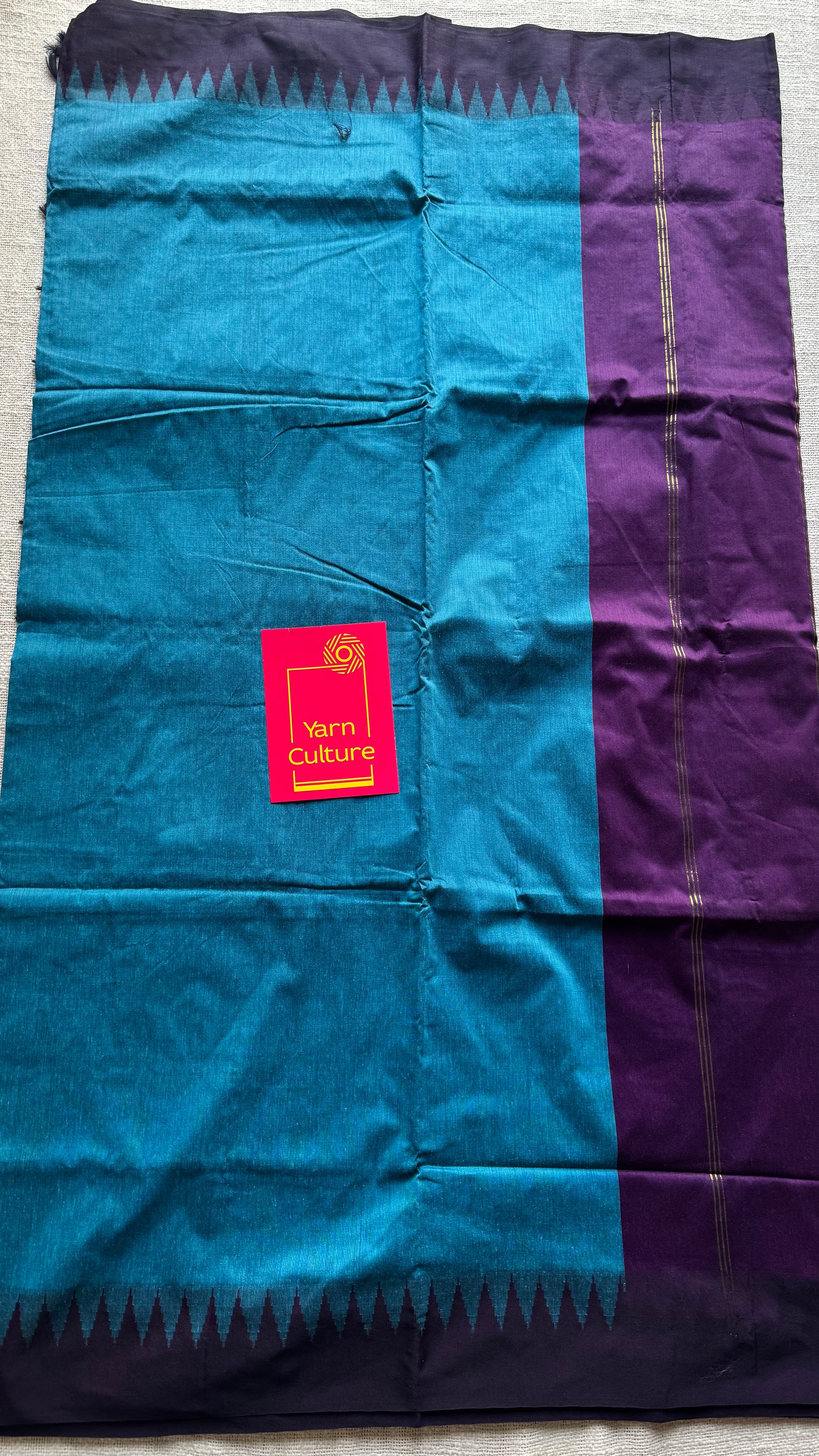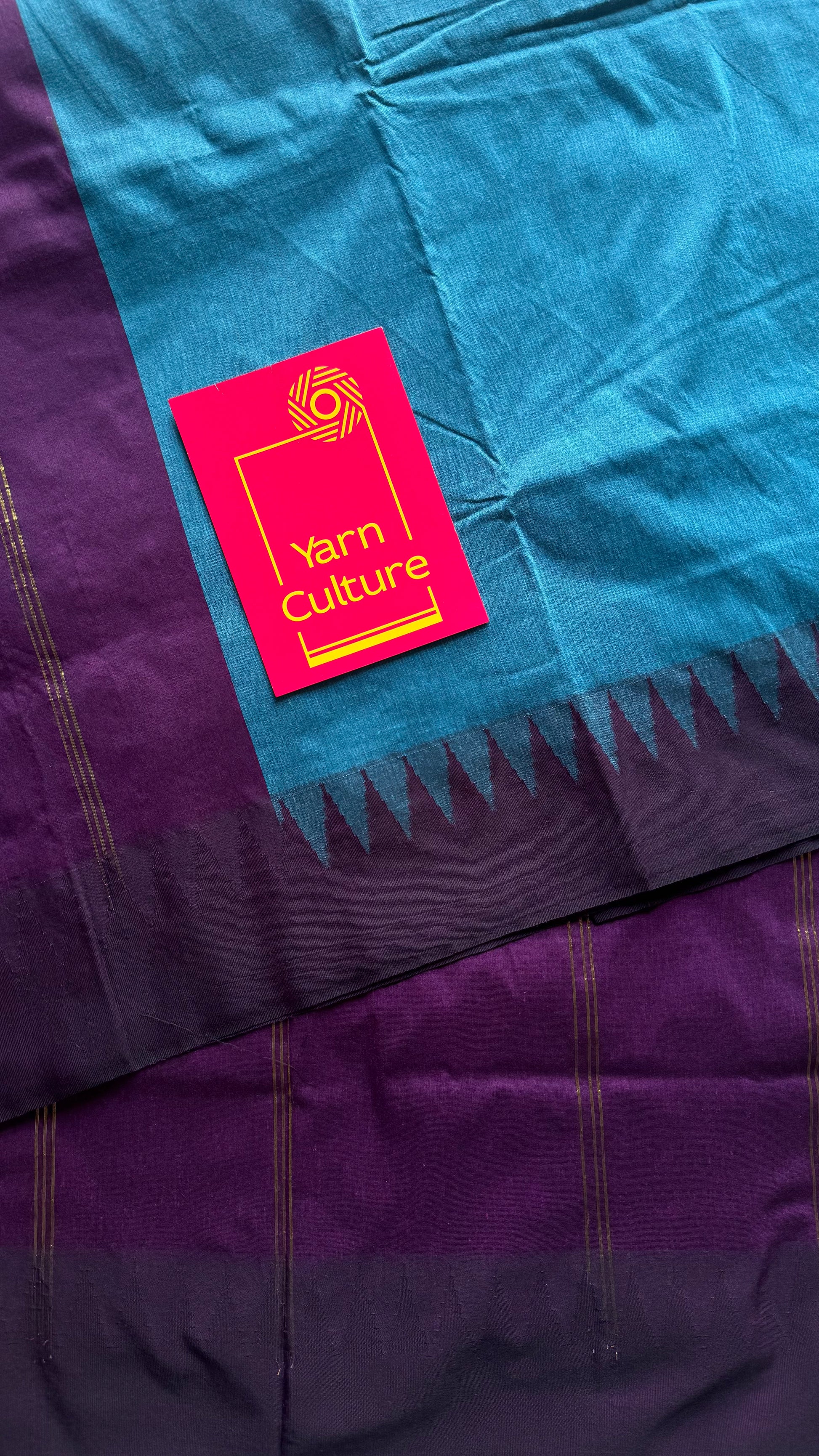 Blue with wine contrast, temple border saree, cotton silk - YCCOTNTBFE58