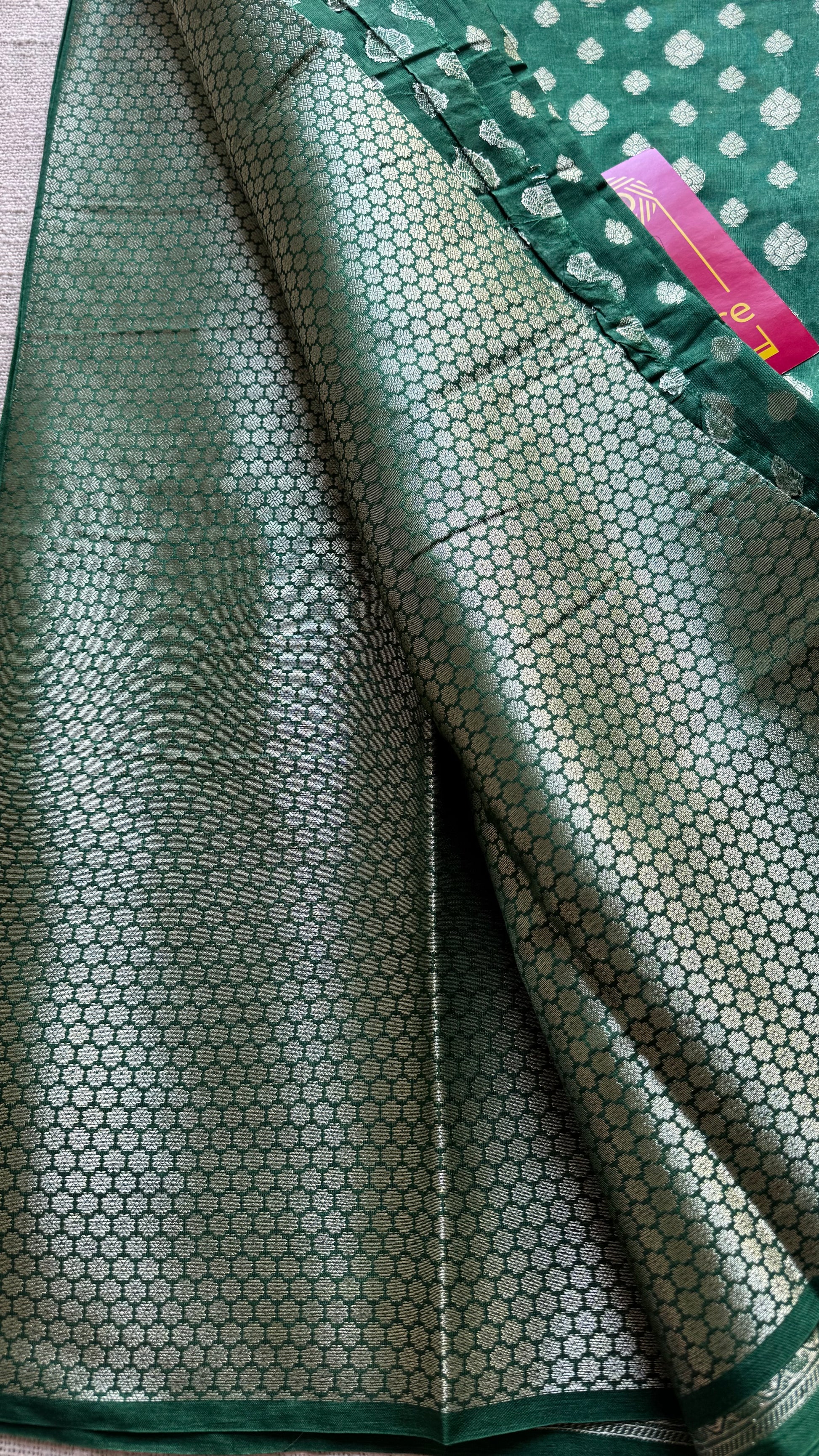 Bottle green, silver buttas buttas and zari, Banarasi semi-silk with georgette mix - festive, and perfect for Diwali or any occasion. Intricate pallu and blouse fabric. Effortless to drape, flowy, light to carry, and rich in look, this is a saree made to shine with you this season.