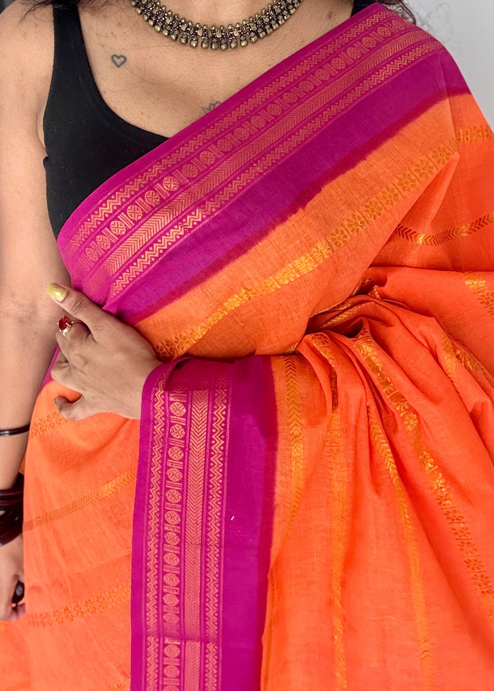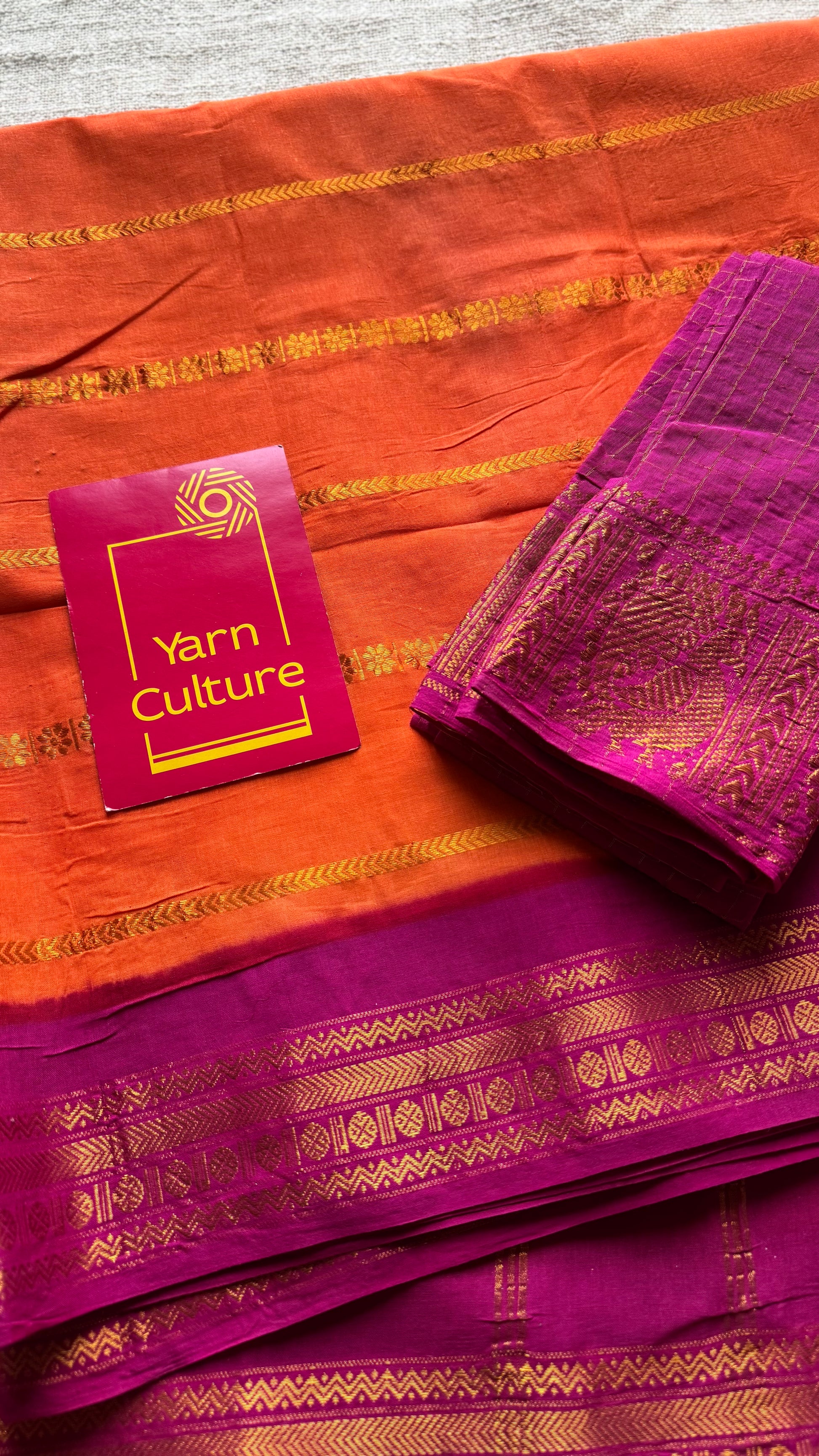 Bright orange with magenta patterned veldhaari, kattuchayam dyed, madurai cotton, with contrast blouse fabric 💖