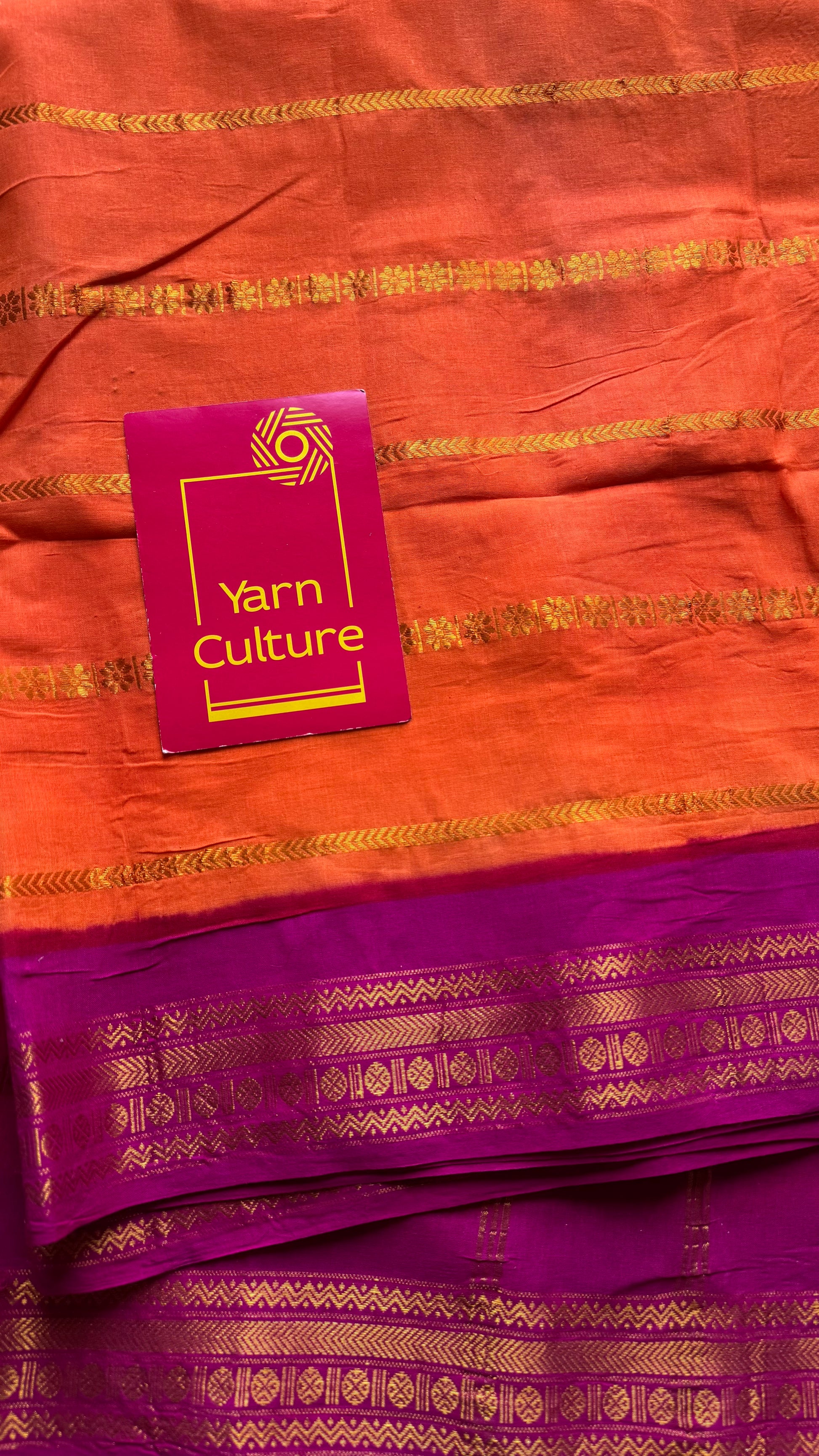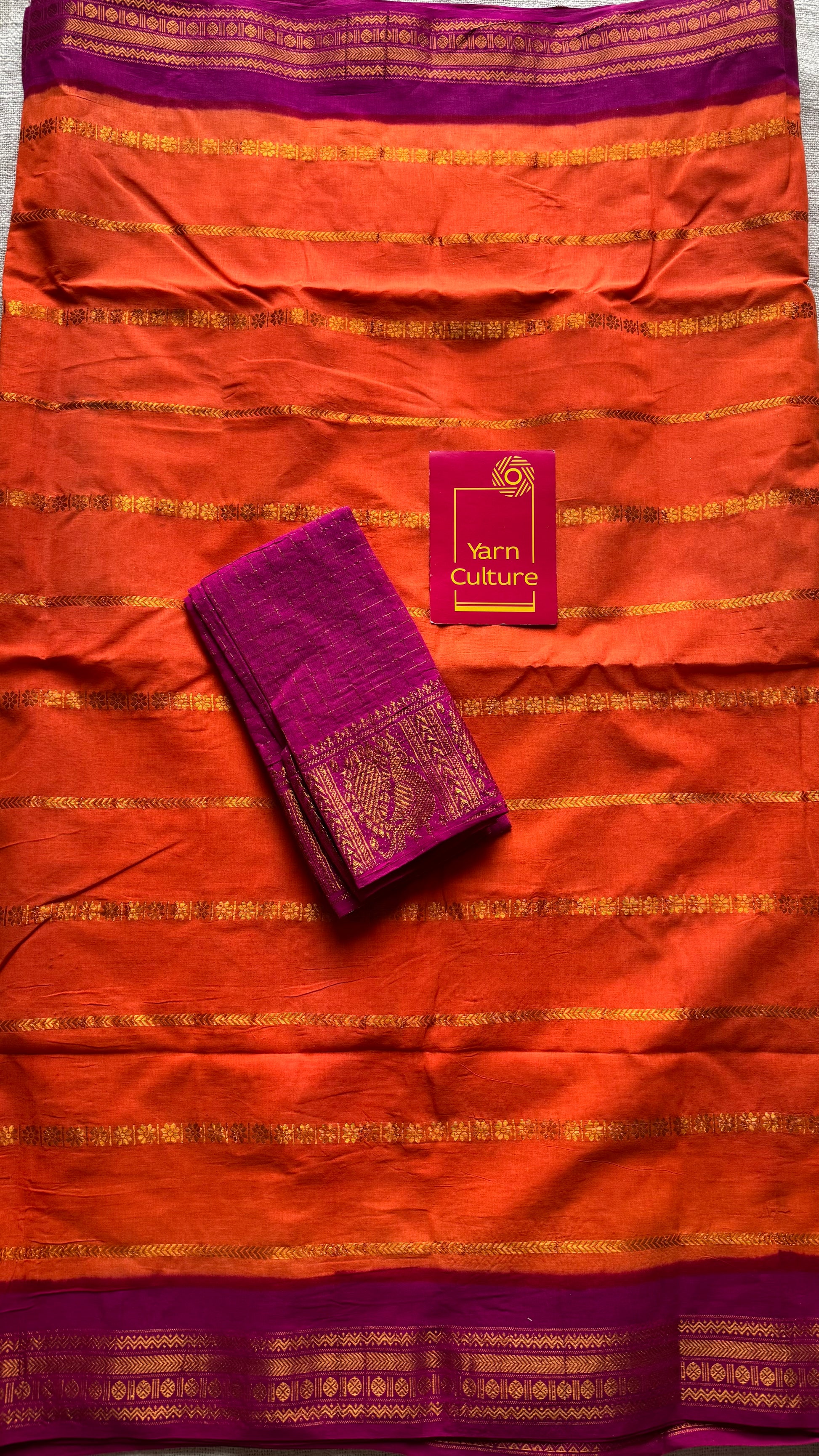 Bright orange with magenta patterned veldhaari, kattuchayam dyed, madurai cotton - YCCOTNSEMS93