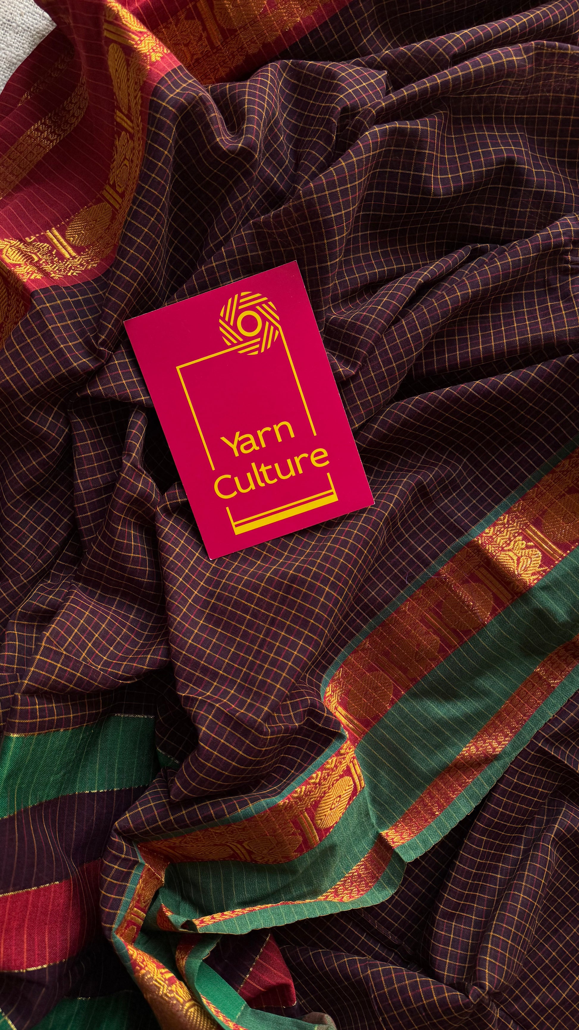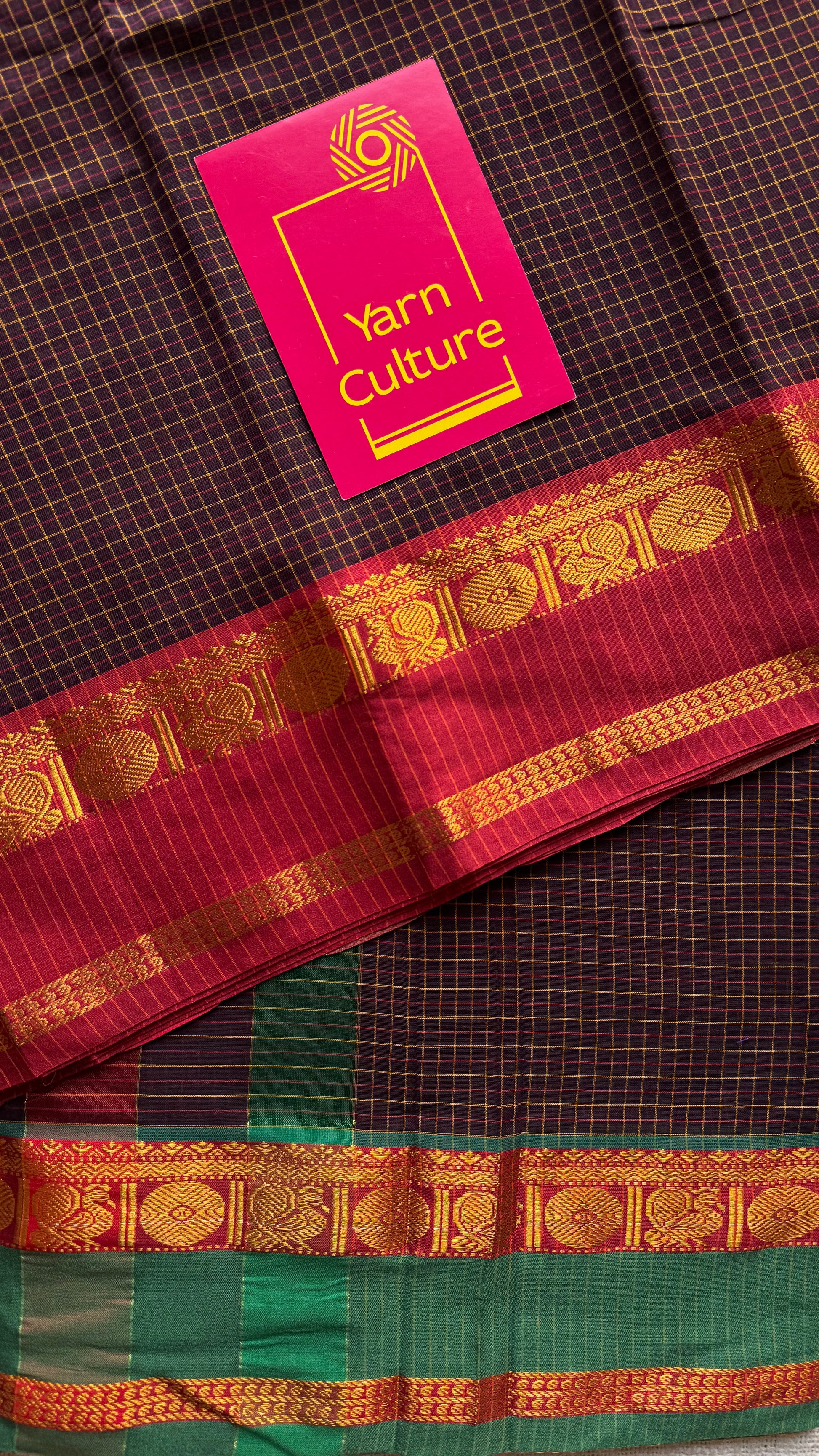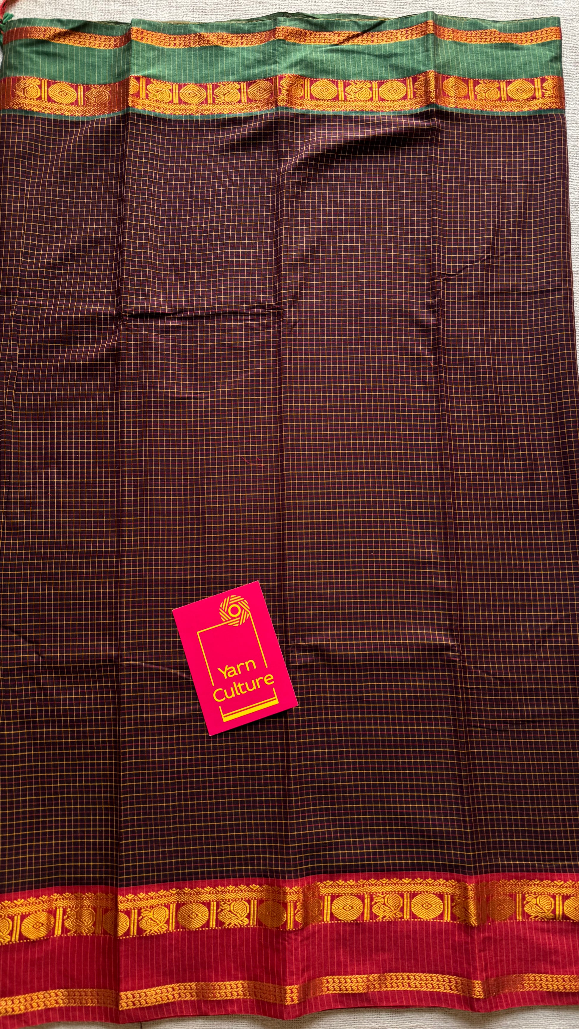 Brown checks with green and red ganga jamuna borders, premium narayanpet soft cotton - YCWOTDNPJA155