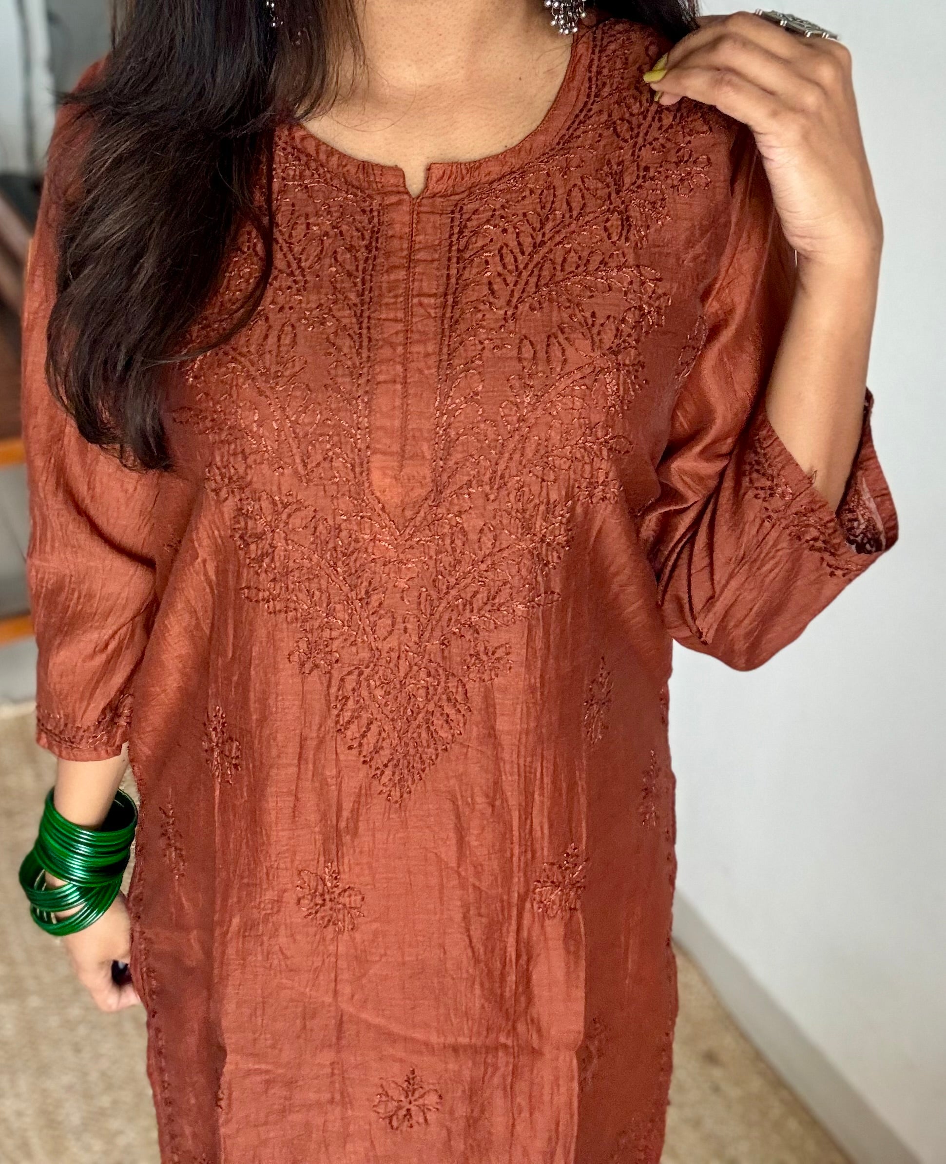 Fabric: Mul Chanderi Work: Hand-embroidered Chikankari bakhiya Neckline: Round neck Sleeves: Three-fourth Fit: Straight fit Length: Knee-length (approx.; may vary slightly with size) Lining: Included Occasion: Everyday elegance / Workwear / Festive minimal