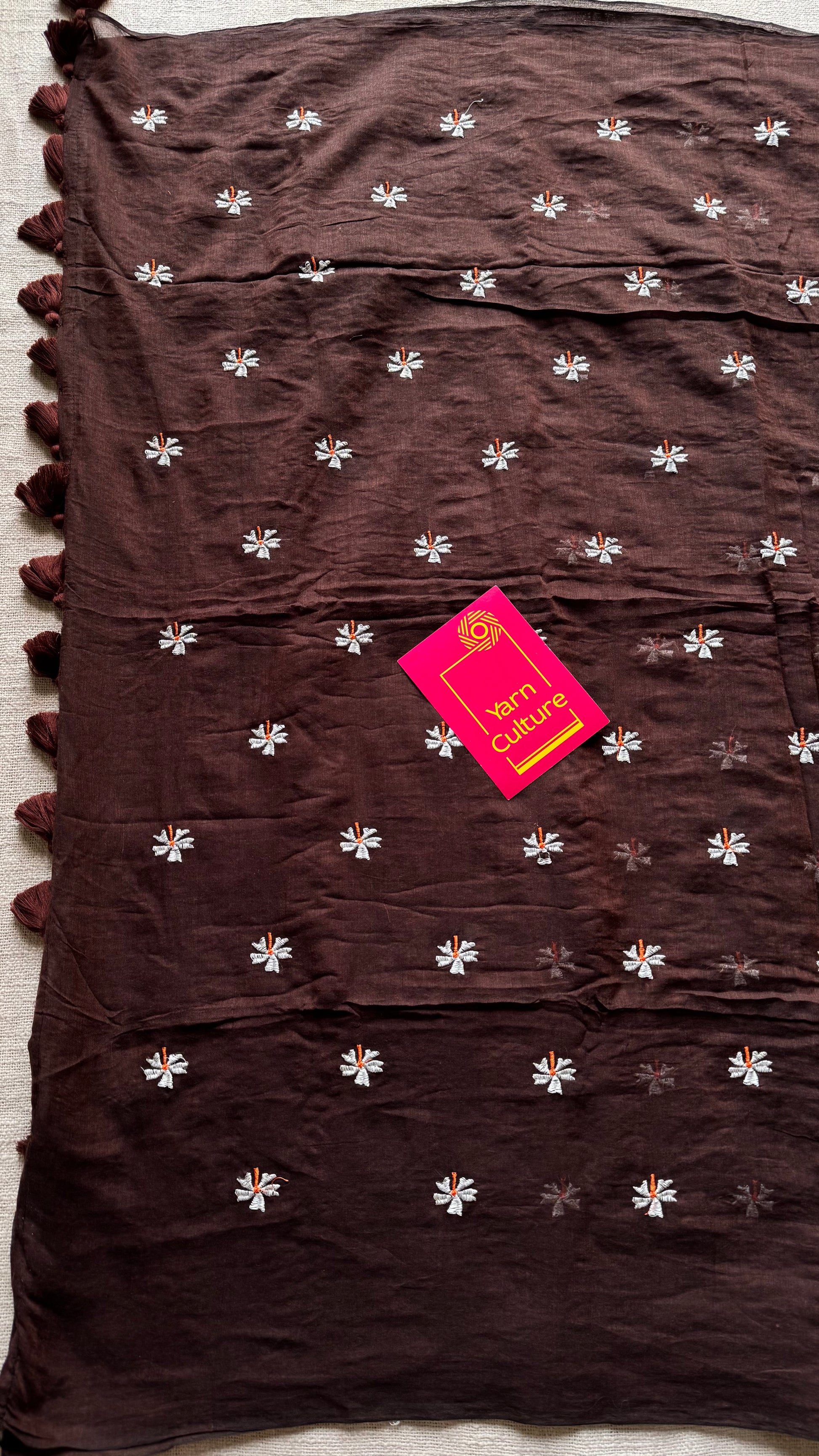 Brown parijat floral embroidered soft mul cotton saree - airy, breathable, and made for long summer days. Easy to drape, soft, easy to drape.