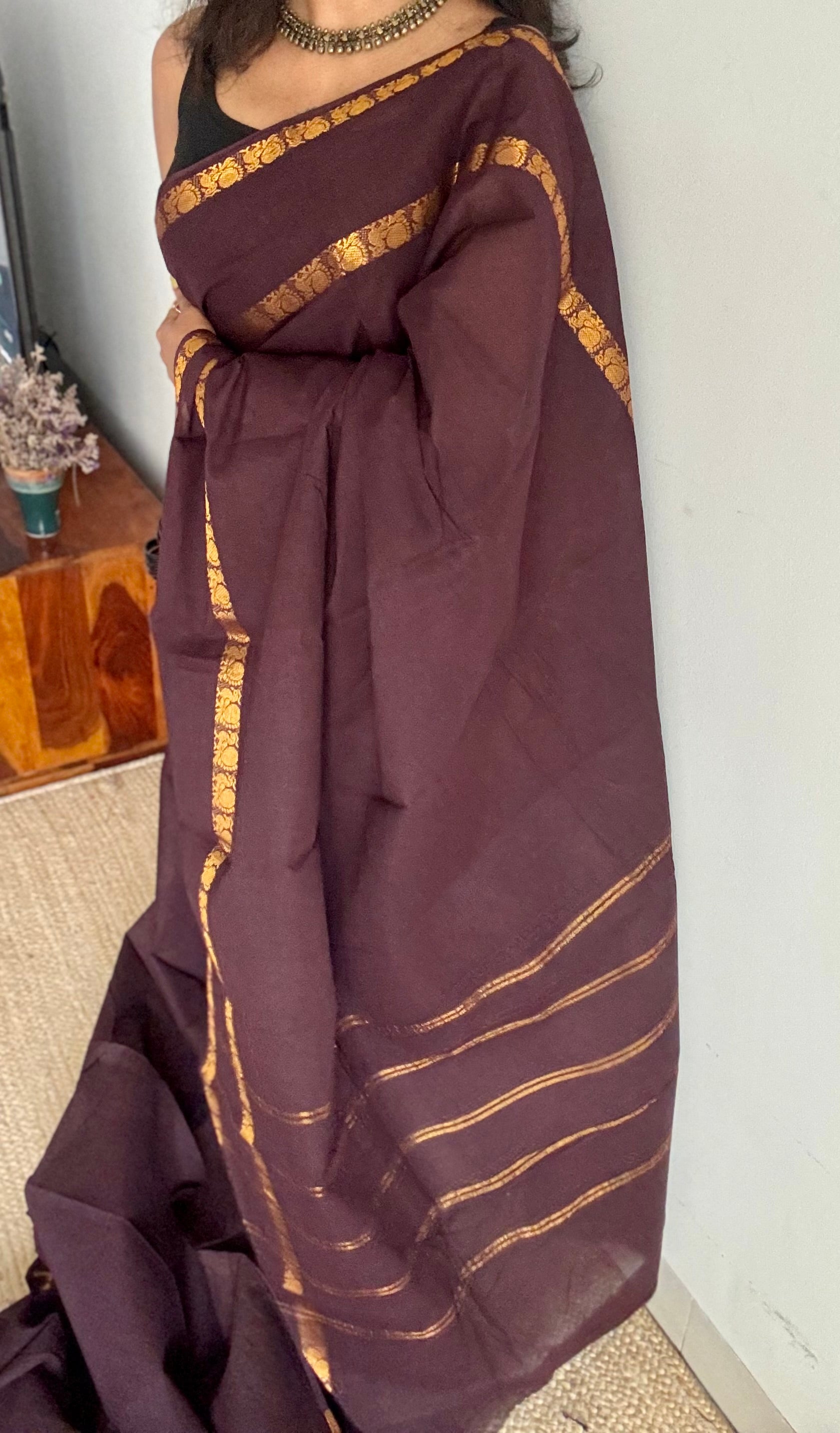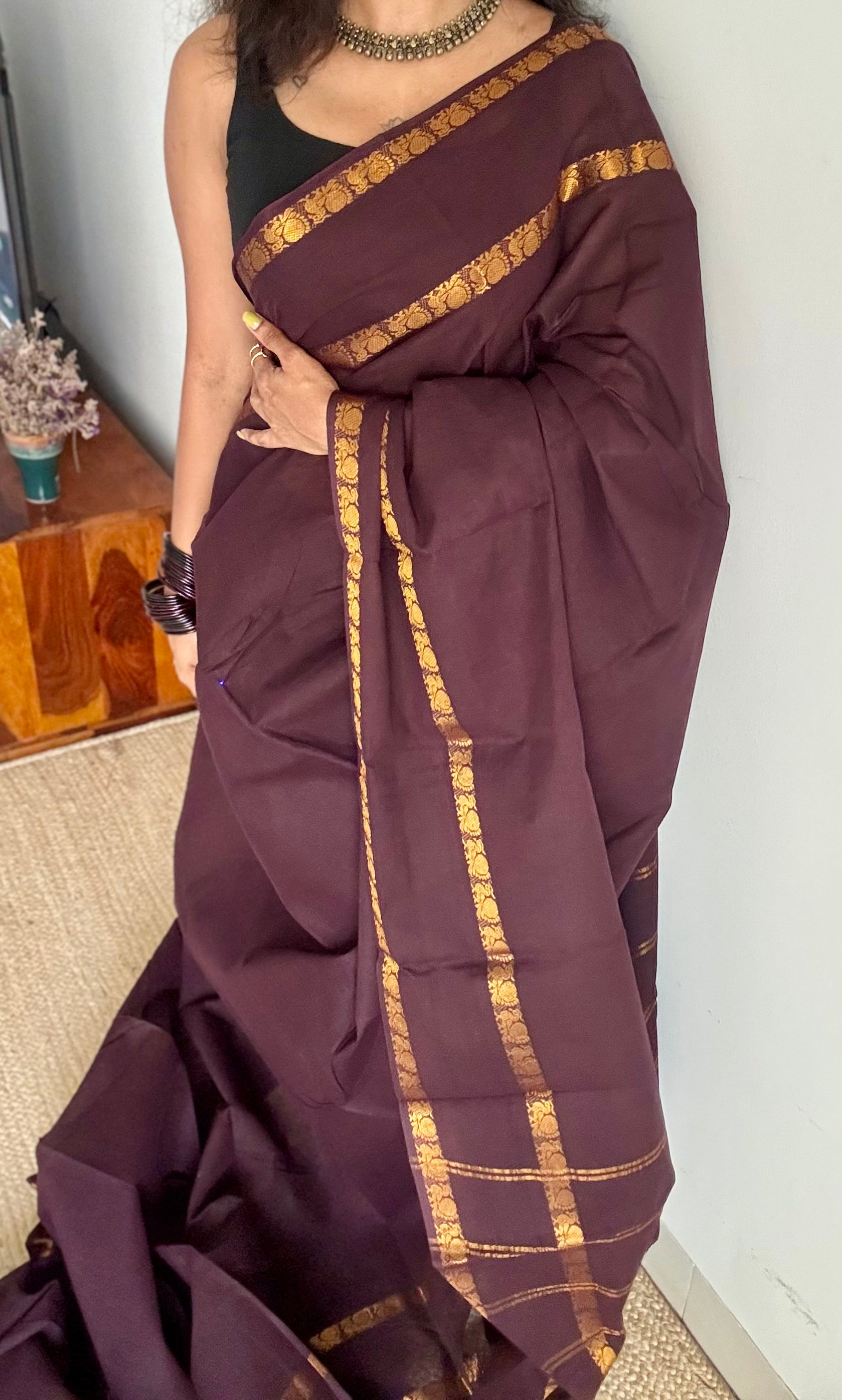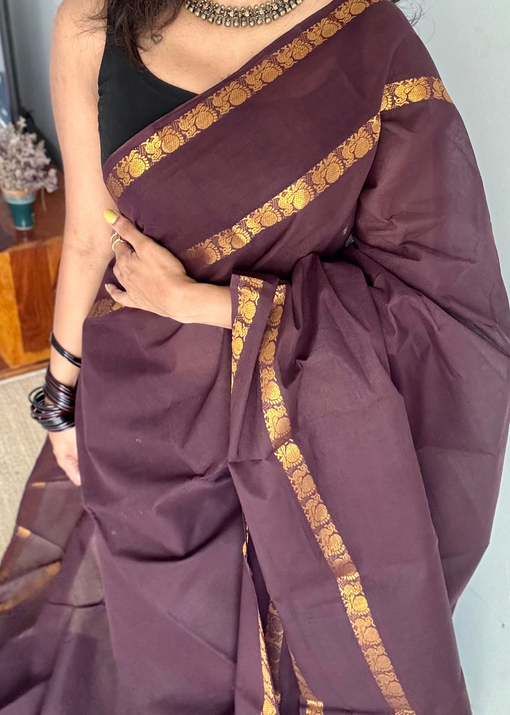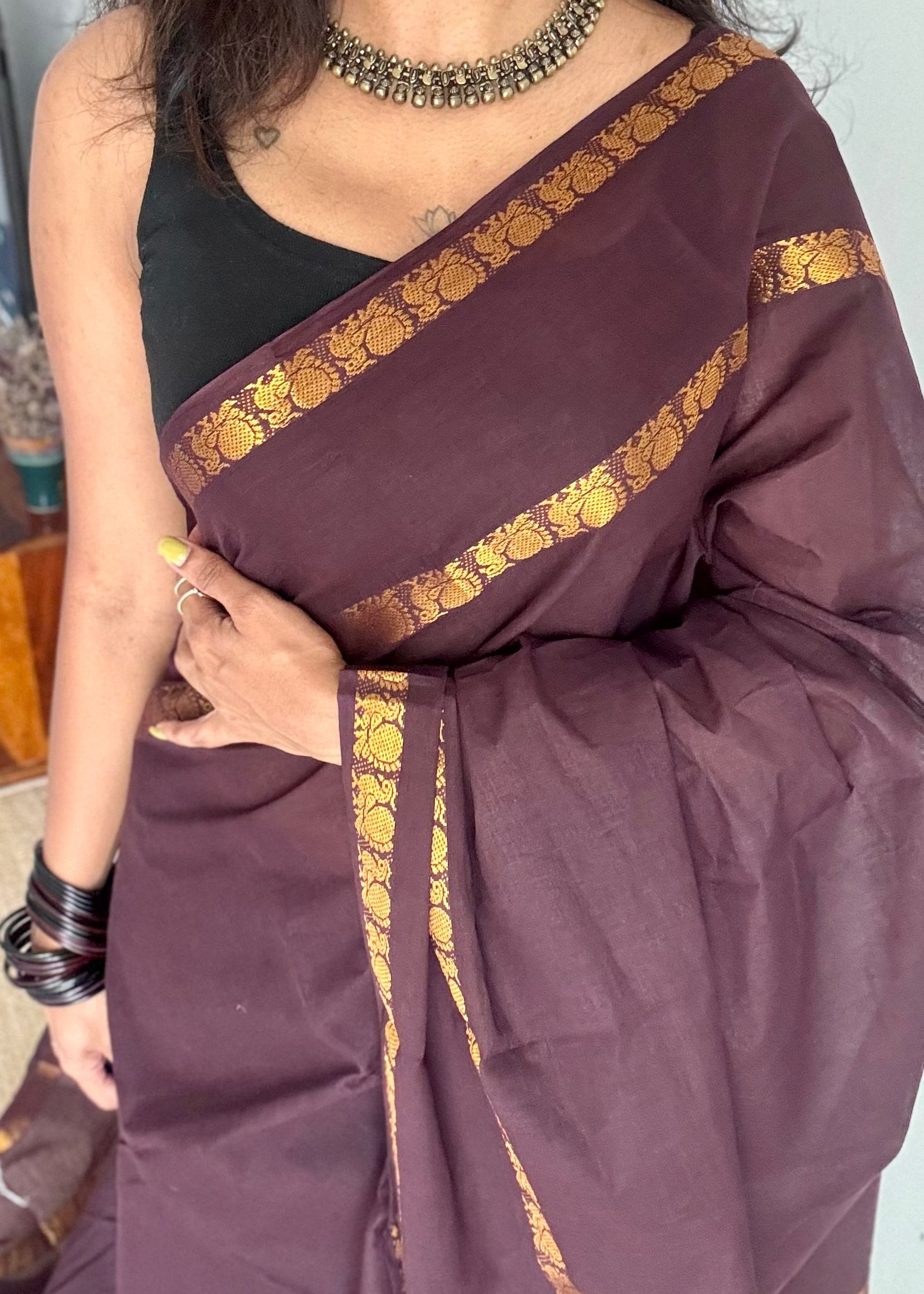 Brown rettaipettu peacock double border 💖 Made using the kattuchayam dyeing technique. Comes with 0.9m same colour blouse