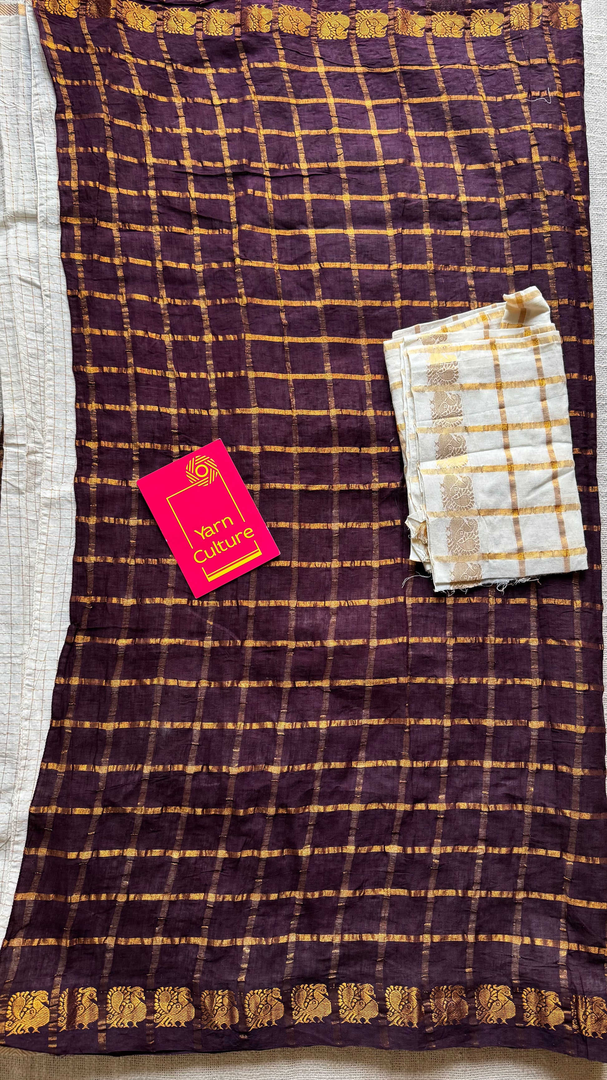 Half–half sungudi cotton saree in brown and ivory. The first half features brown pavithra kattam. The second half comes in ivory mini kattam checks. Both halves are stitched together, creating a soft contrast of colours and patterns.