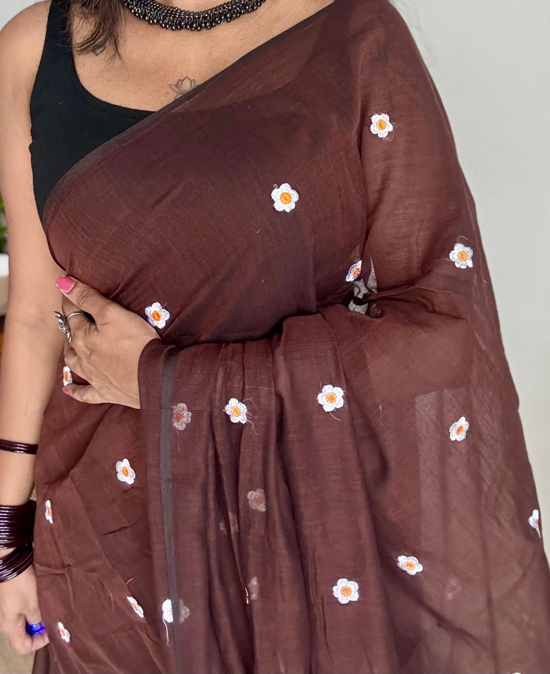 Brown with white floral embroidered soft mul cotton saree - airy, breathable, and made for long summer days. Easy to drape, soft, easy to drape.