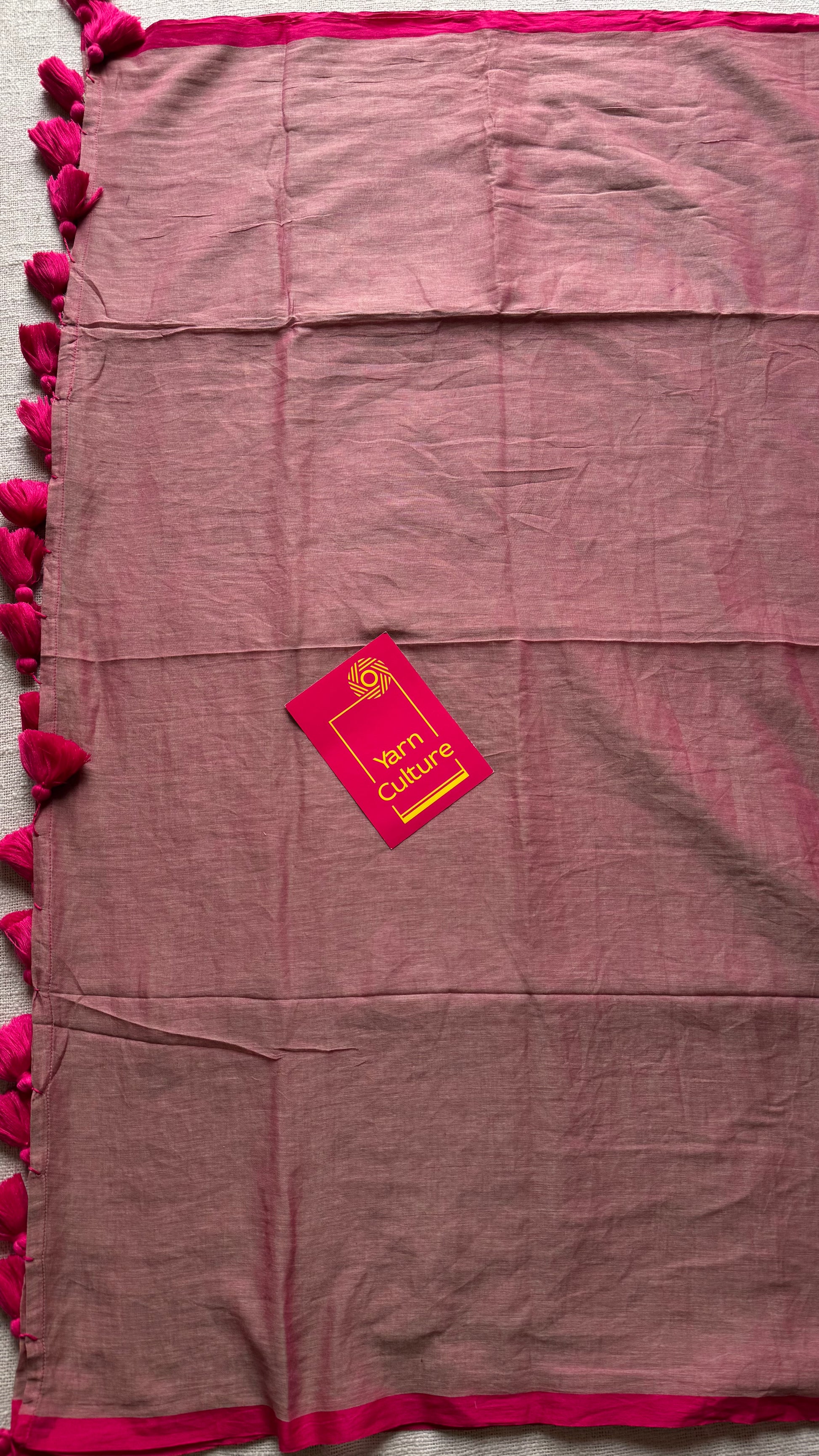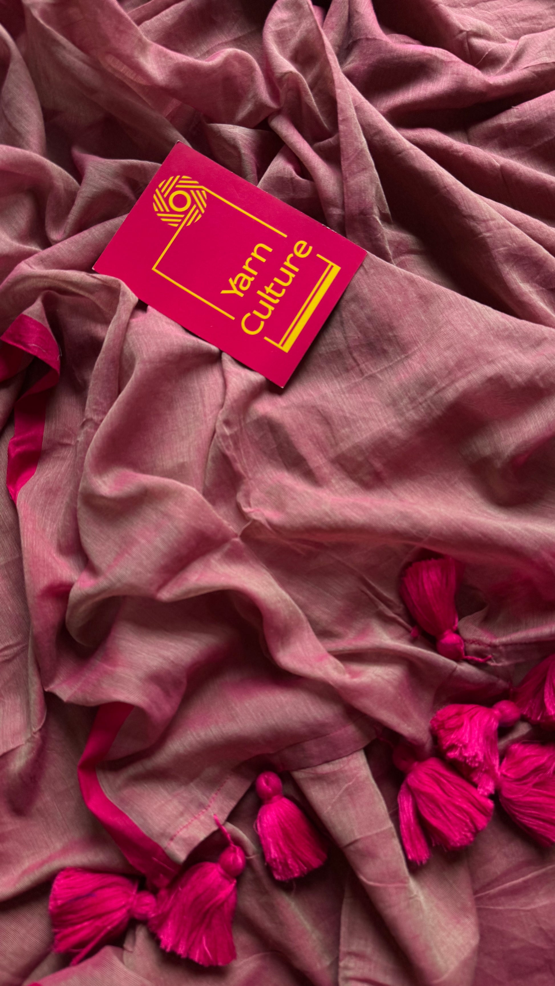 A subtle mauve mul cotton saree finished with a striking pinkish red border. Lightweight, breathable, and soft, it is perfect for summer wear, everyday styling, and effortless draping.
