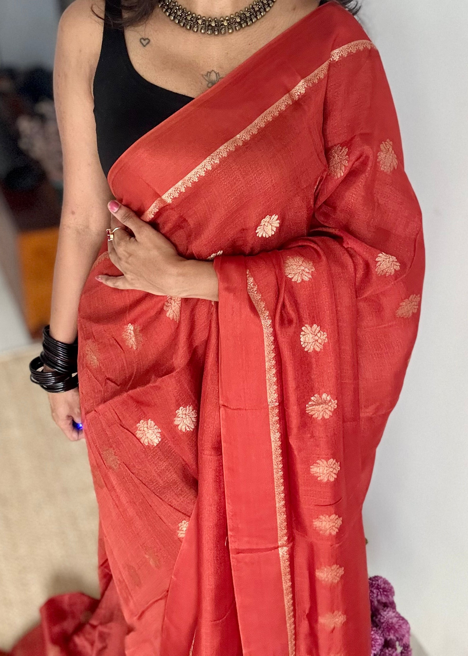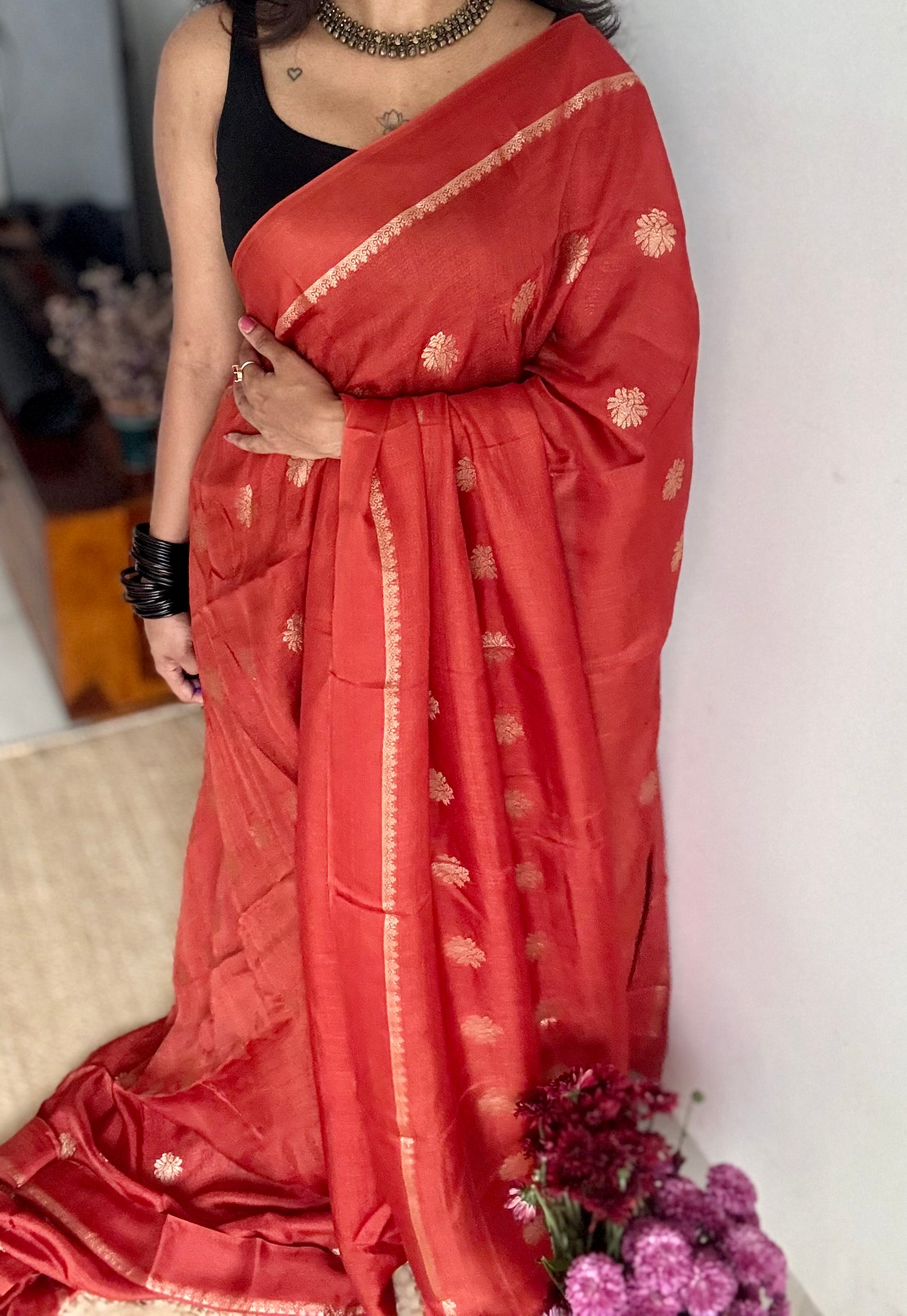 Burnt Orange Viscose Khadi silk with satin borders, jacquard zari and motifs all over in gold.