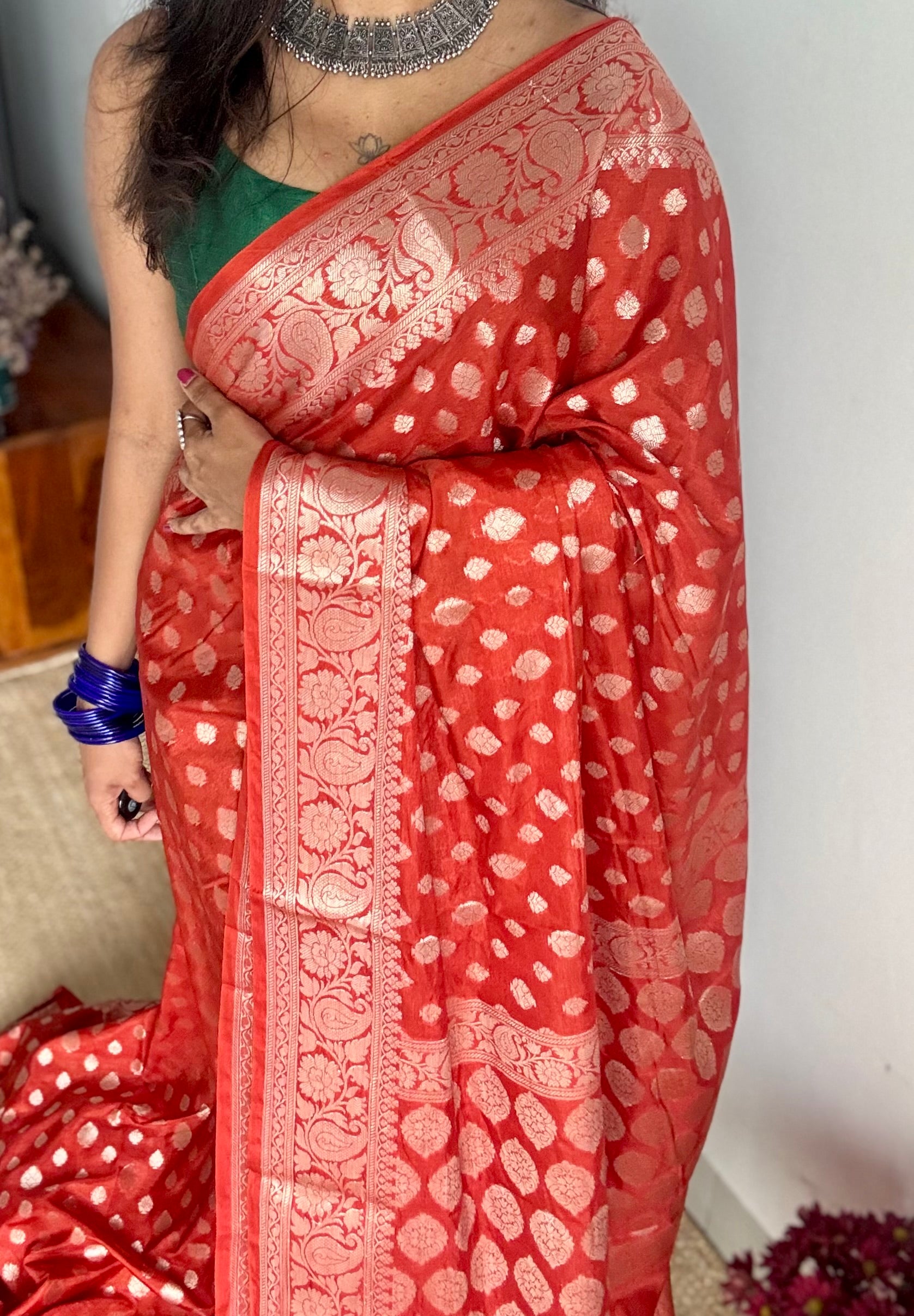 Burnt red, silver buttas and zari, Banarasi semi-silk with georgette mix - festive, and perfect for Diwali or any occasion. Intricate pallu and blouse fabric. Effortless to drape, flowy, light to carry, and rich in look, this is a saree made to shine with you this season.