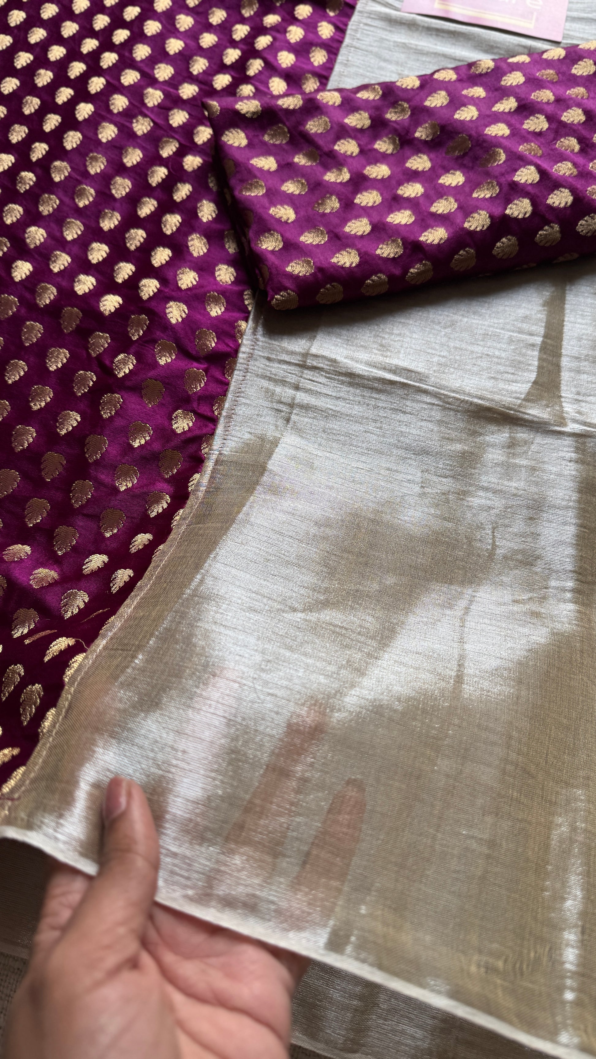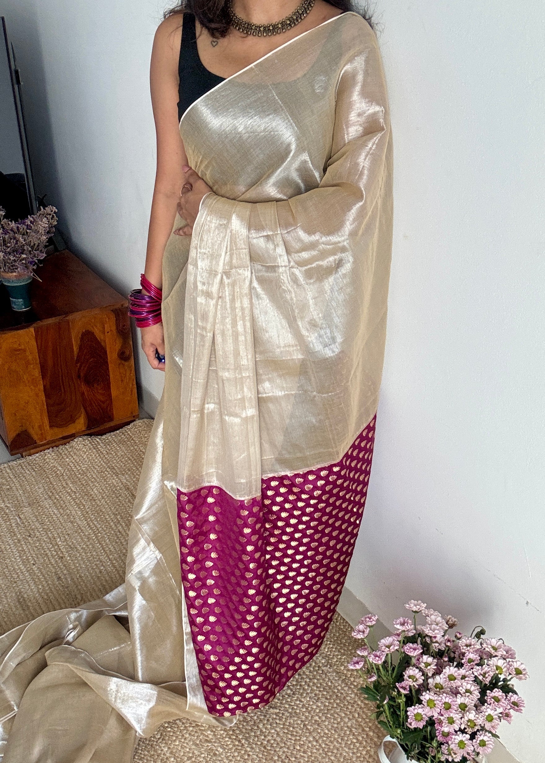 A saree woven like a soft dream - Chaand Phool glows in moon silver mul tissue, light and luminous like a pearl under starlit skies. Its contrast purple-pink brocade pallu and blouse bloom with quiet joy, bringing just the right touch of colour to this serene silhouette.
