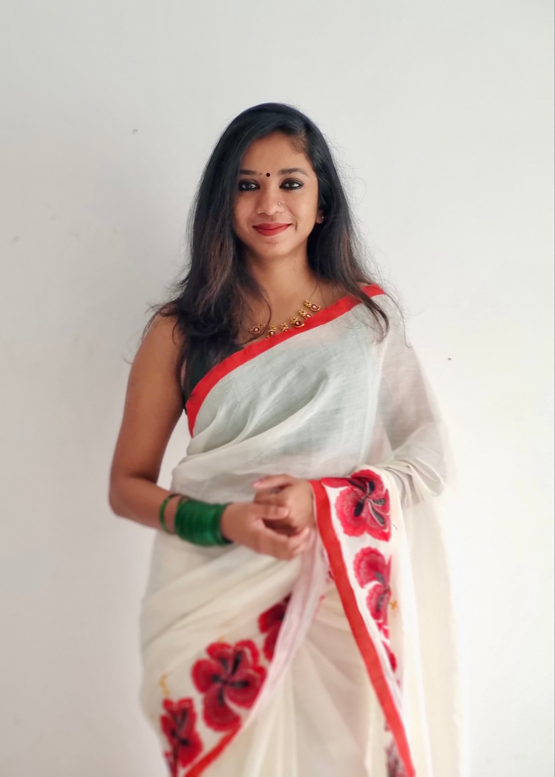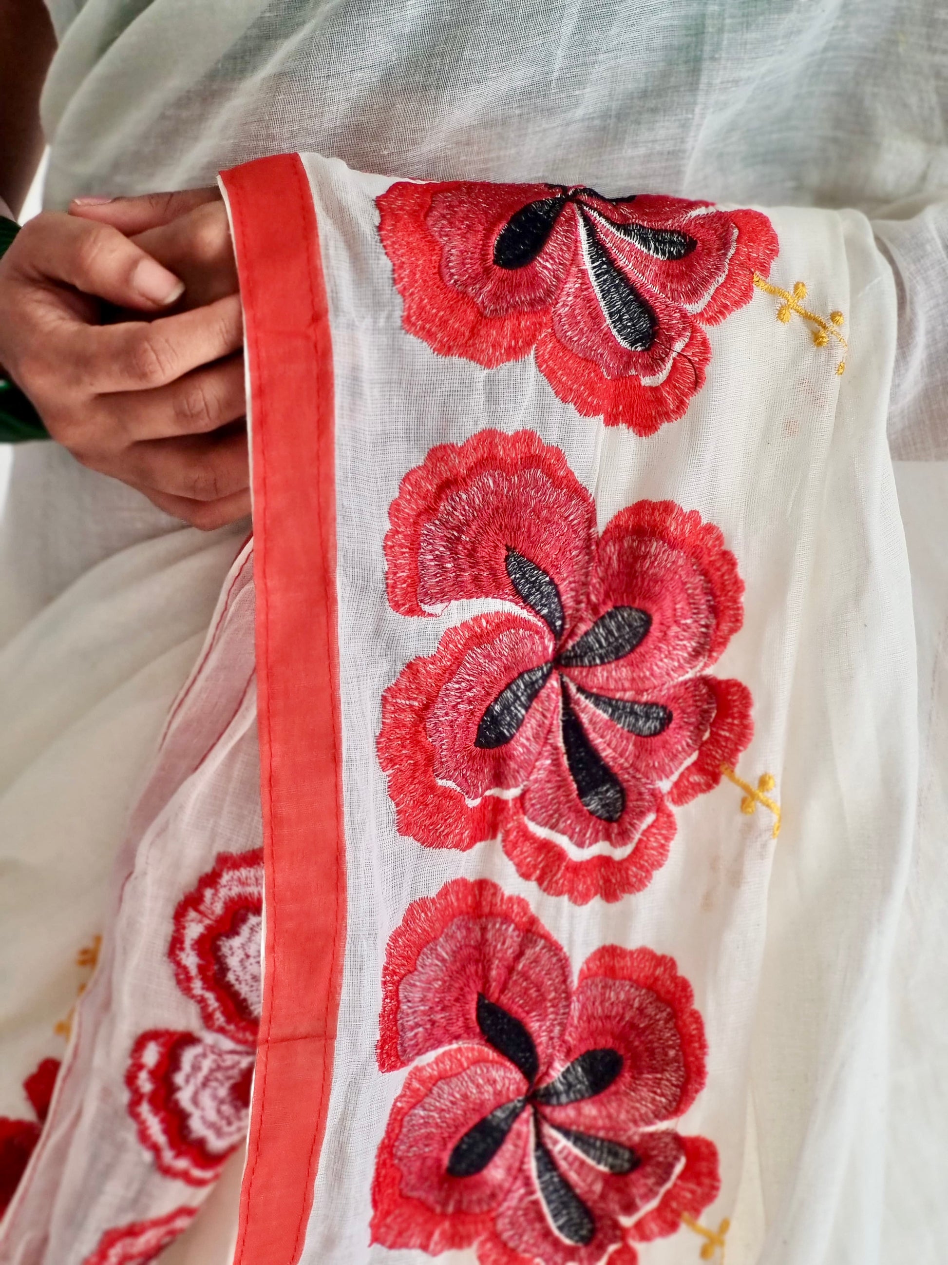A soft cotton saree in ivory, delicately embroidered with colourful red hibiscus flowers along the edges of the saree.