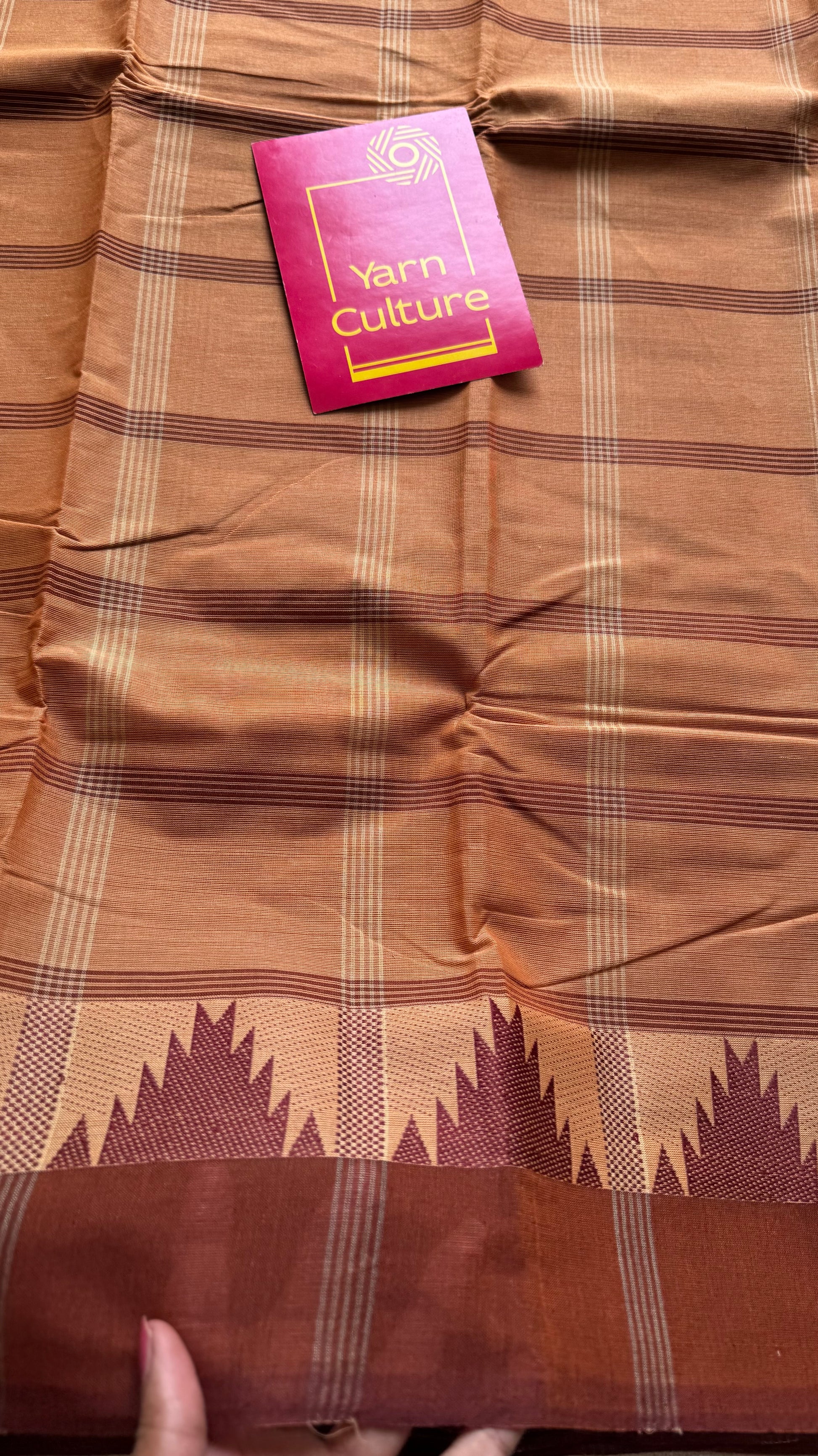 Chettinad cotton saree with light brown and dark brown checks, temple motif border - YCCOTNAP71