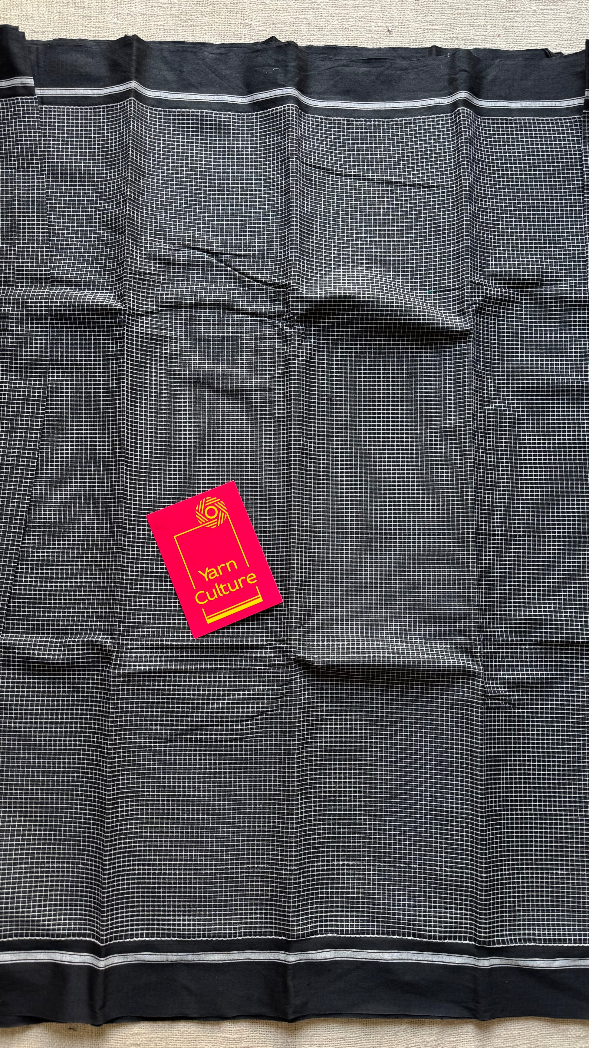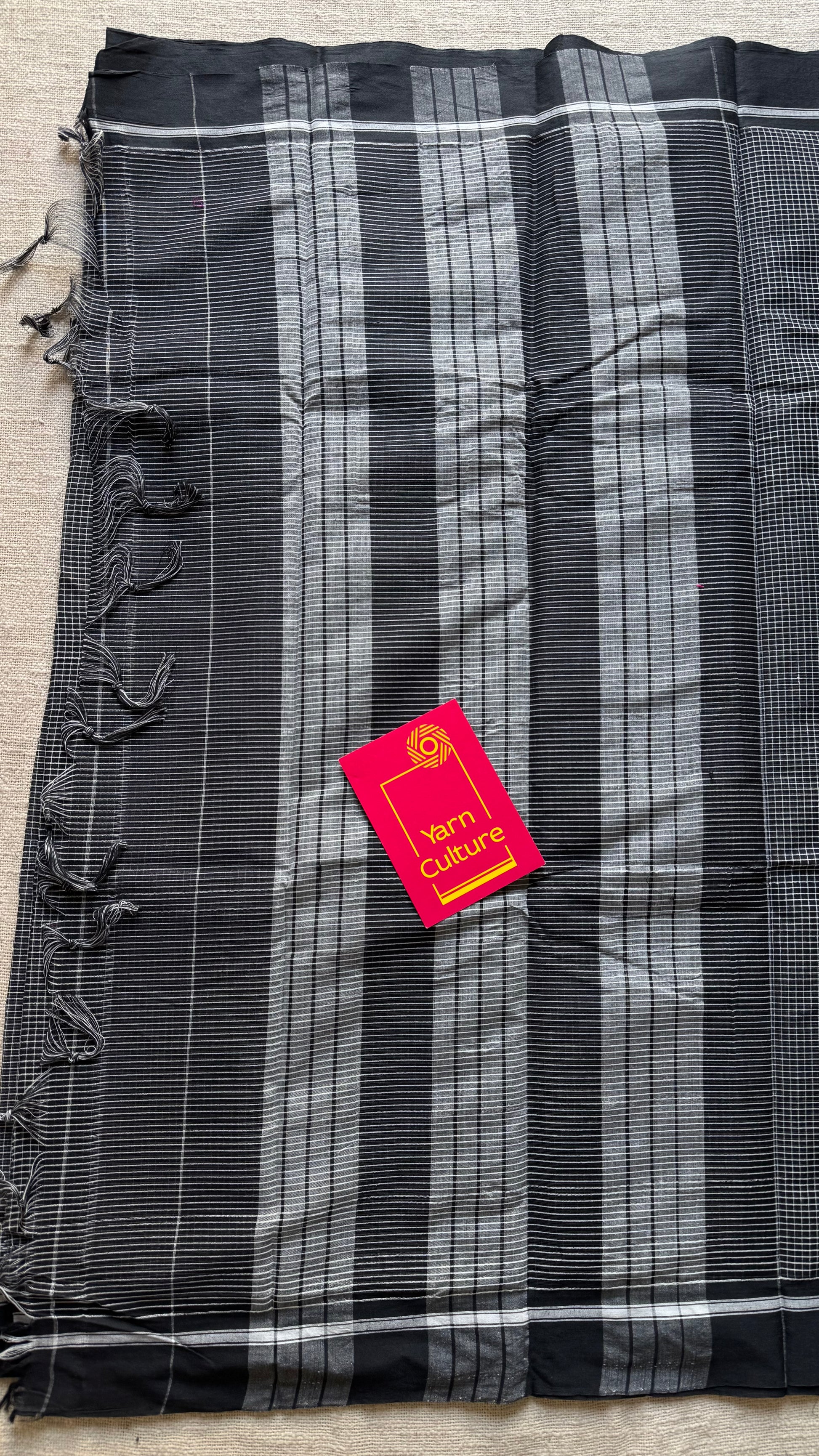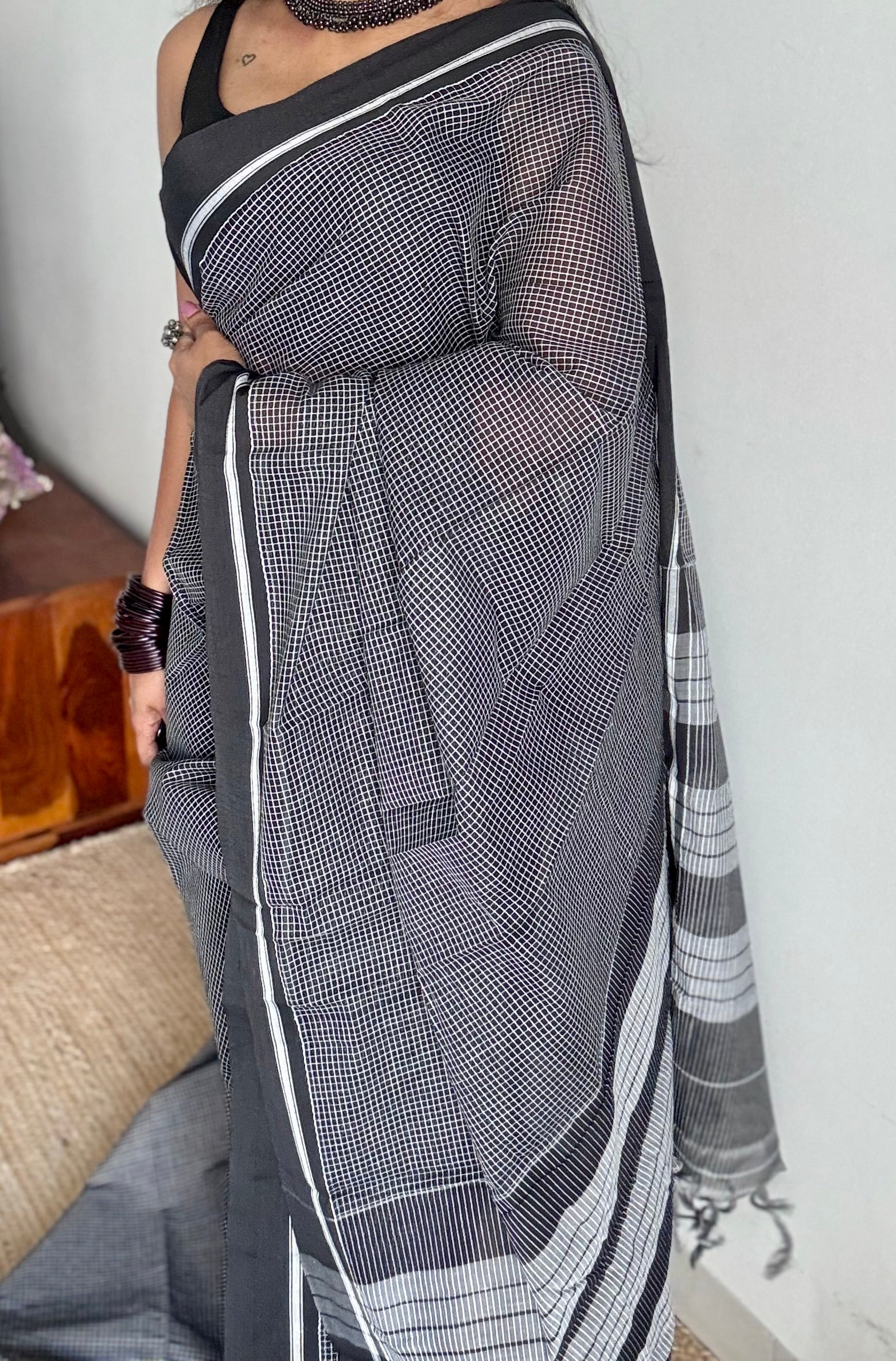 Classic Black and White : Harmony of Hues. This beautiful saree features the classic black and white checks with black border. Handwoven in Ilkal, soft, easy to drape.