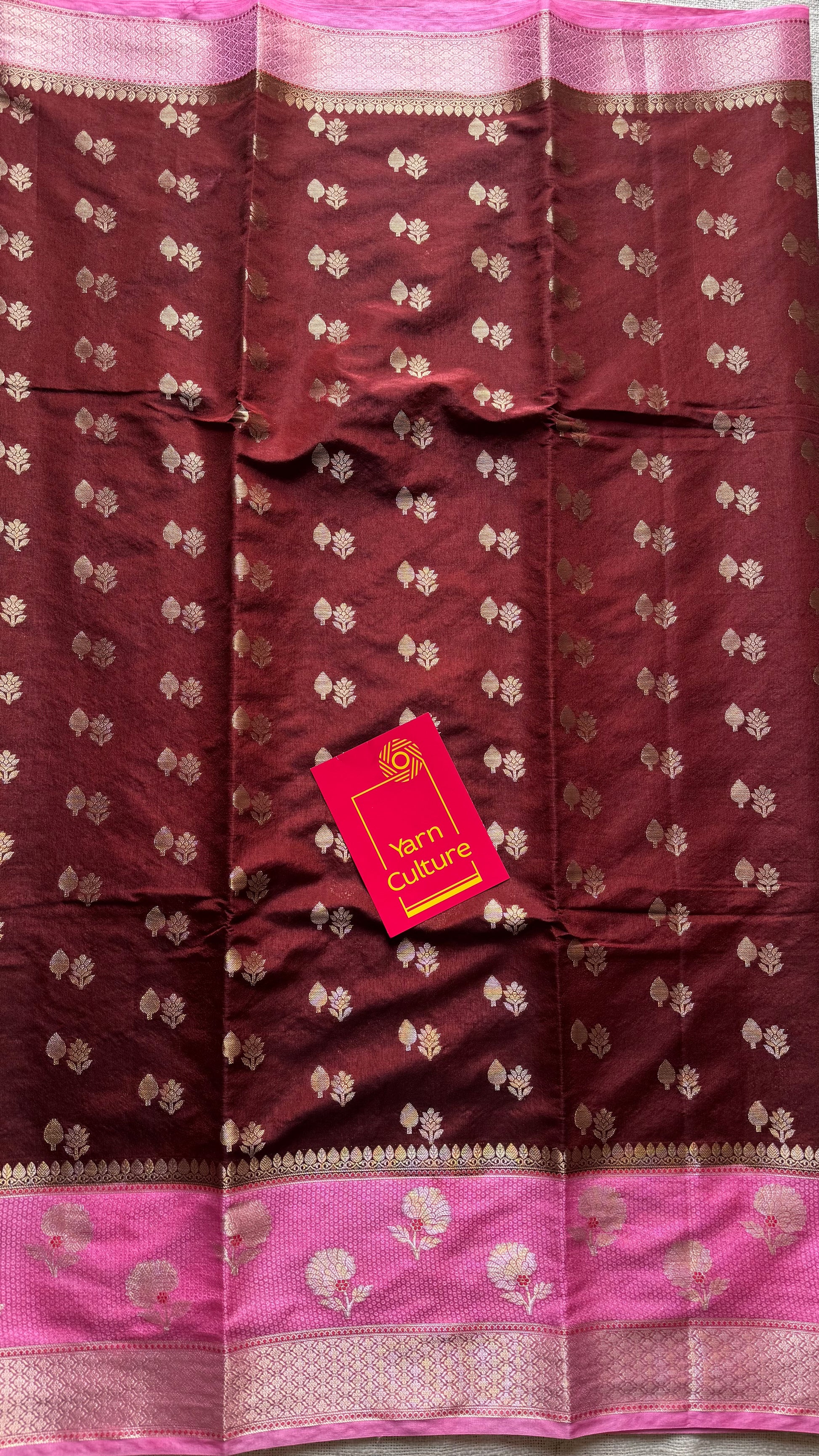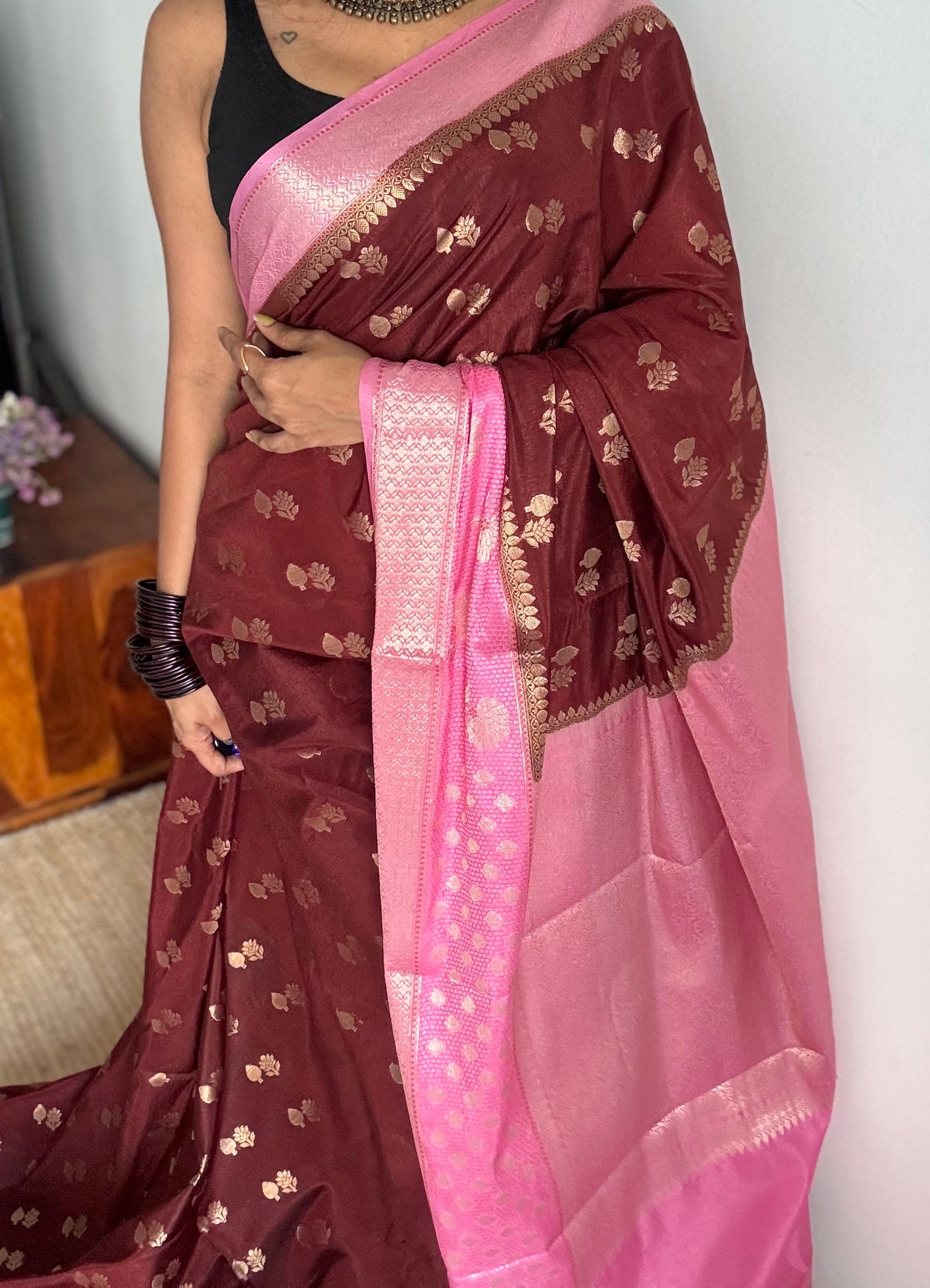 A pretty combo of brown with pink in banarasi semi dupion silk, intricate pallu and blouse. Floral buttas, floral motif border. Effortless to drape, light to carry, and rich in look, this is a saree made to shine with you this season.