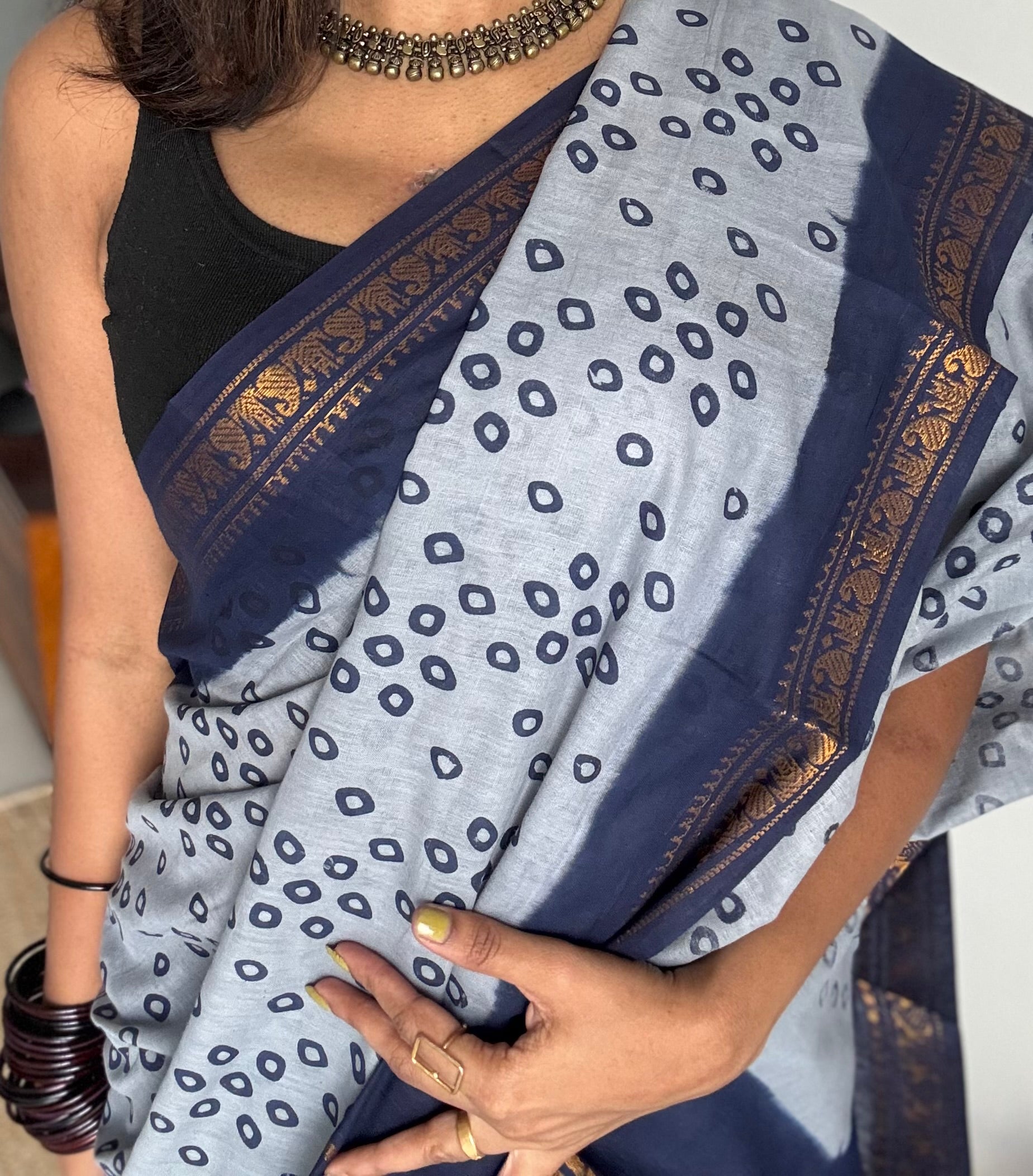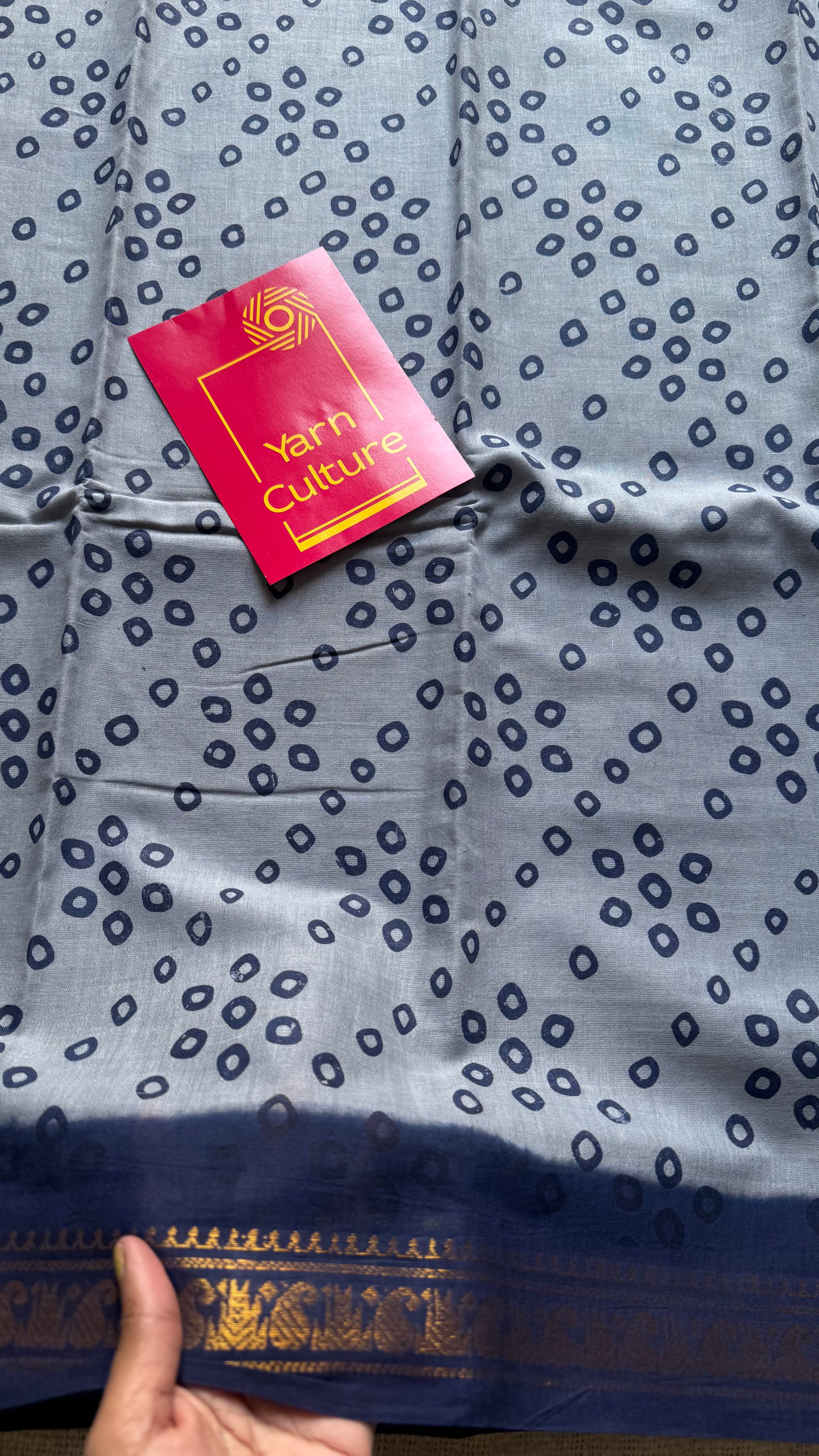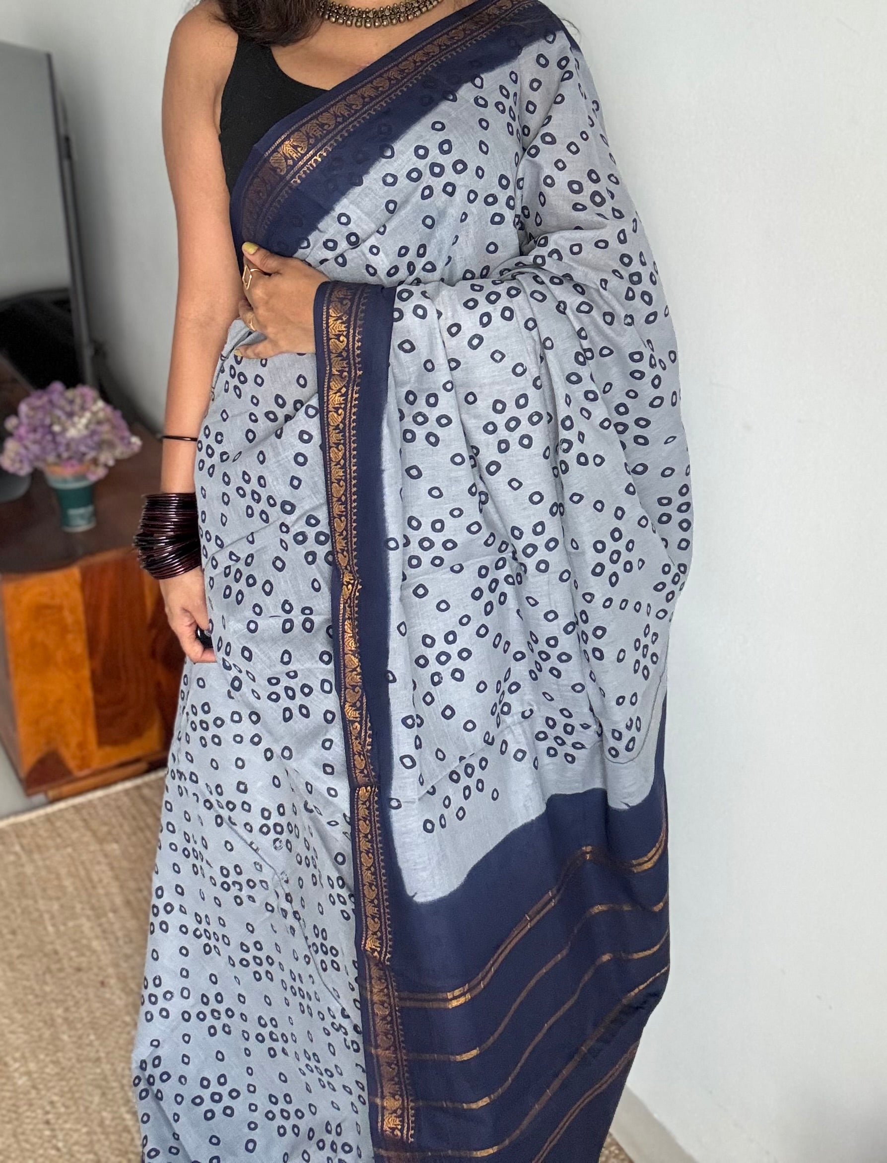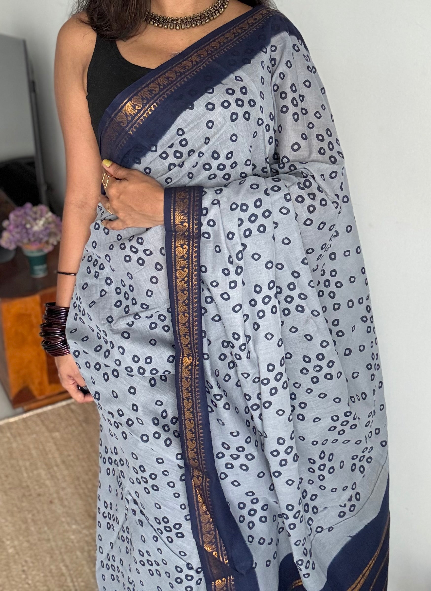 Cool grey with dark blue, motif printed, kattuchayam dyed madurai sungudi cotton saree - YCCOTNMSFE73