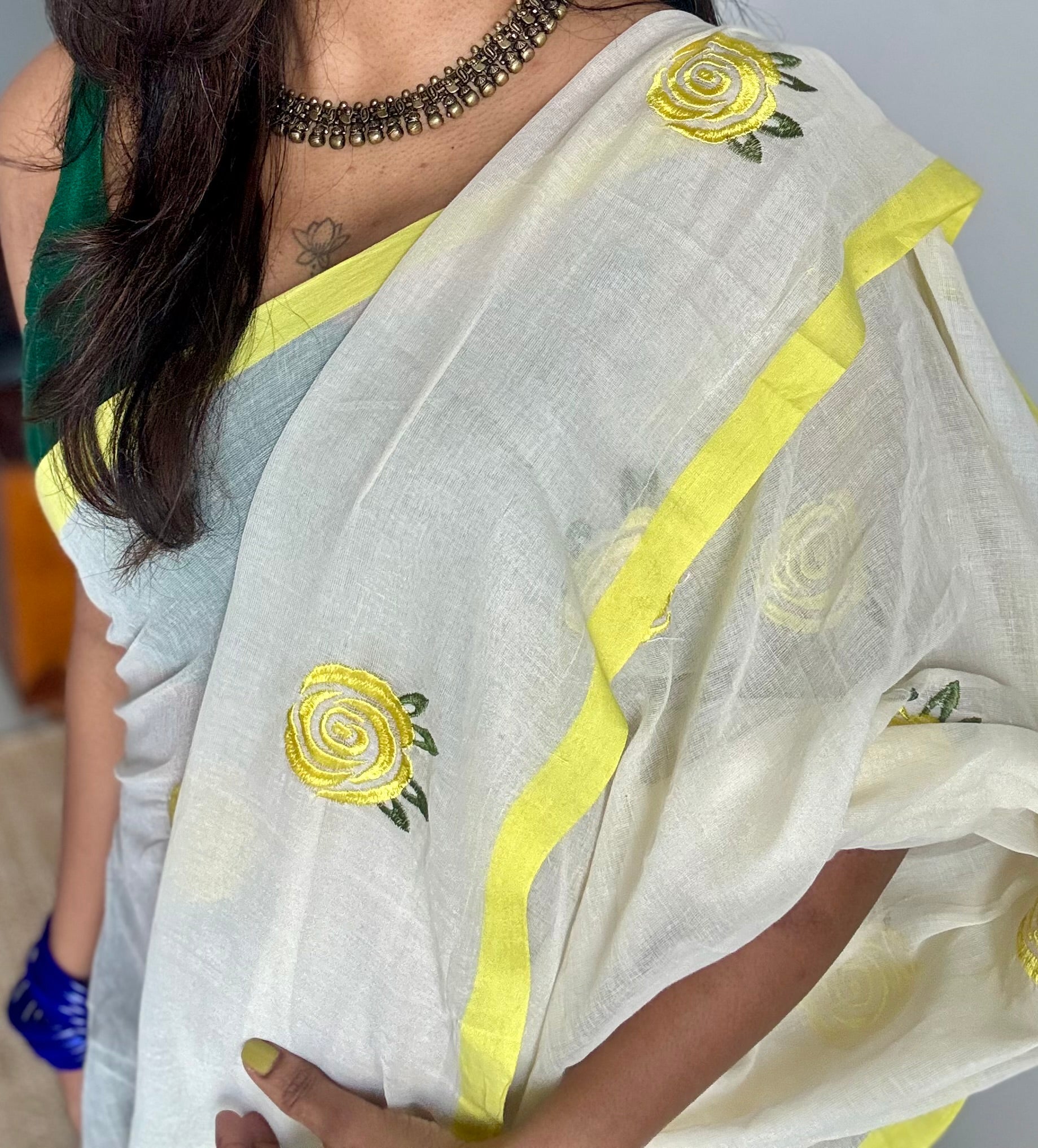 Cream mul with lemon yellow rose thread embroidery - YCBCMCNO76